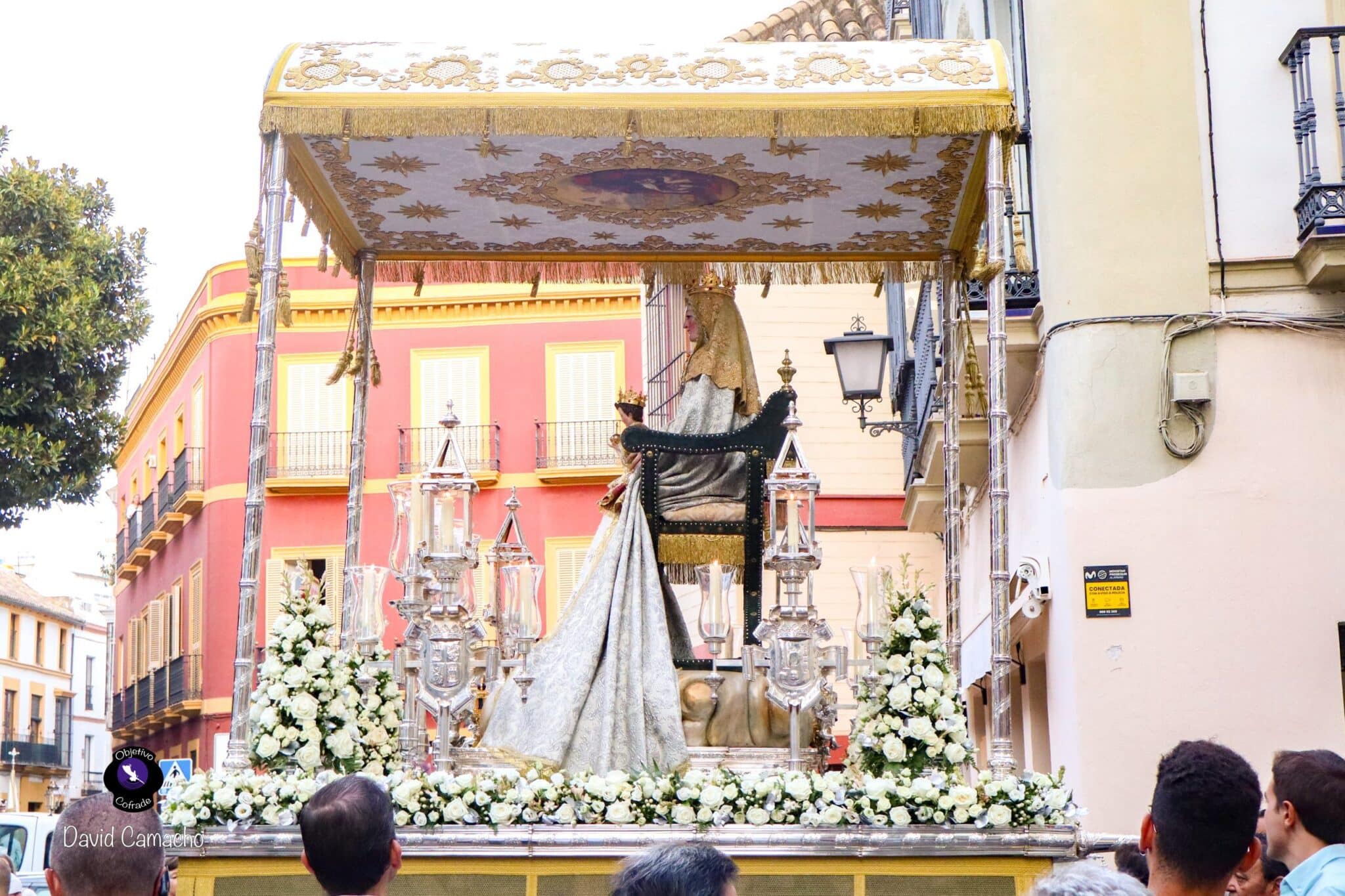 La Virgen de los Reyes lució un espléndido exorno floral a cargo de Flores Ventura, compuesto por rosas blancas, rosas de pitiminí, lisanthus, nardos, hiperycum y eucaliptus plata. Este elegante arreglo floral aportó una delicada fragancia y belleza al conjunto procesional.