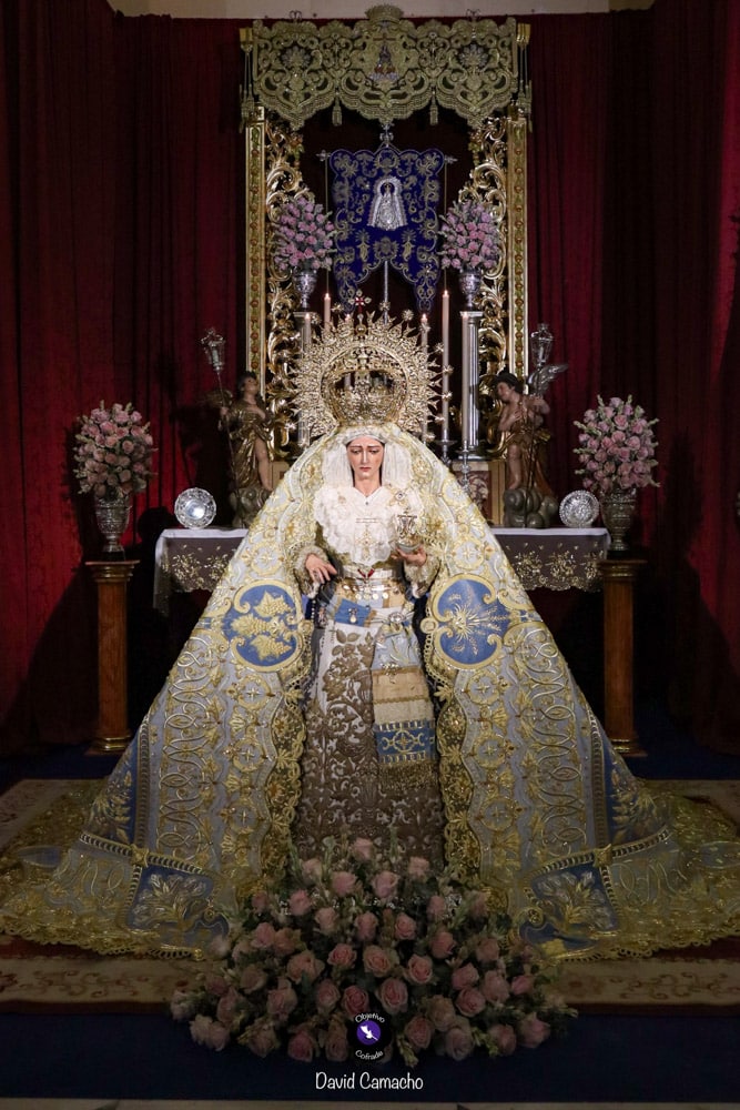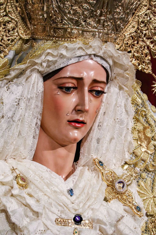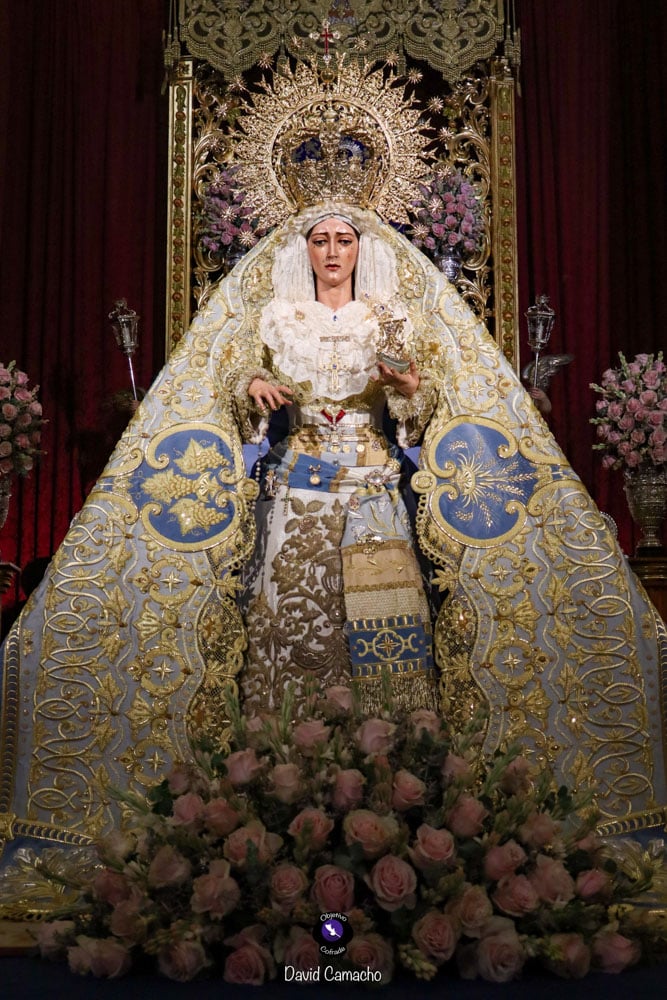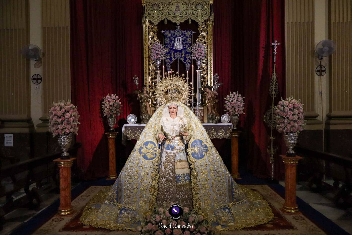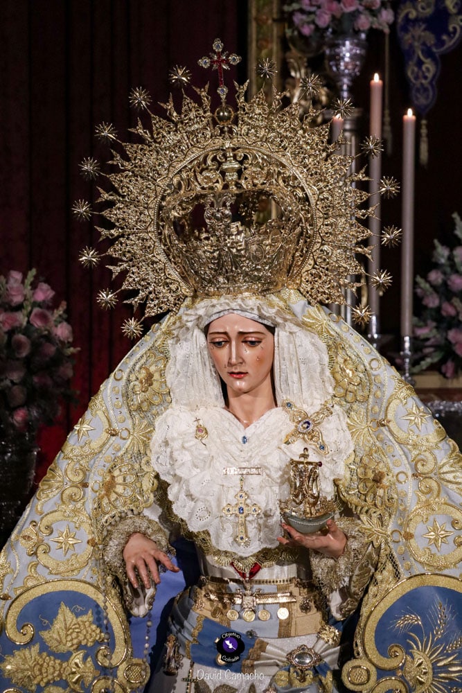 El culto se abrió en la tarde del viernes tras la celebración de la misa de hermandad, momento en el que se permitió también a los fotógrafos captar las primeras estampas de la dolorosa vestida de Reina y entronizada en un altar dispuesto con esmero por el equipo de priostía. La Virgen luce en esta ocasión un nuevo manto de salida, además de un tocado compuesto por mantilla de blonda de seda española, puñetas de encaje de bolillos en hilo de oro y un fajín bordado a realce en tejidos nobles.