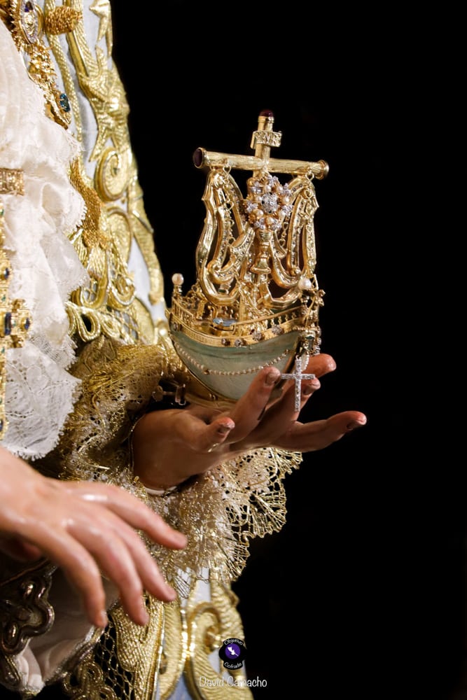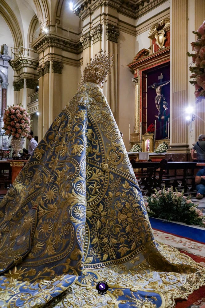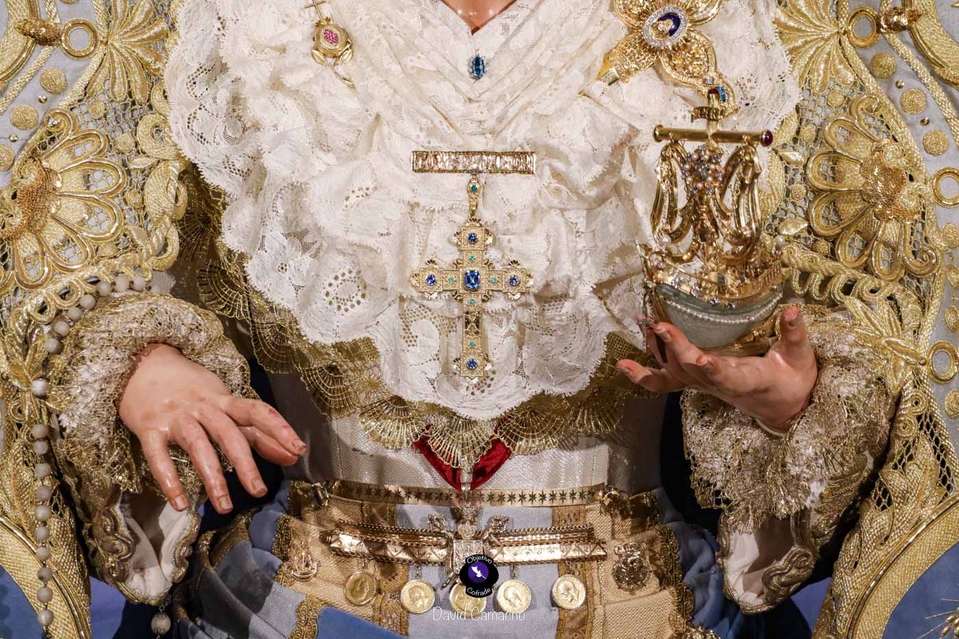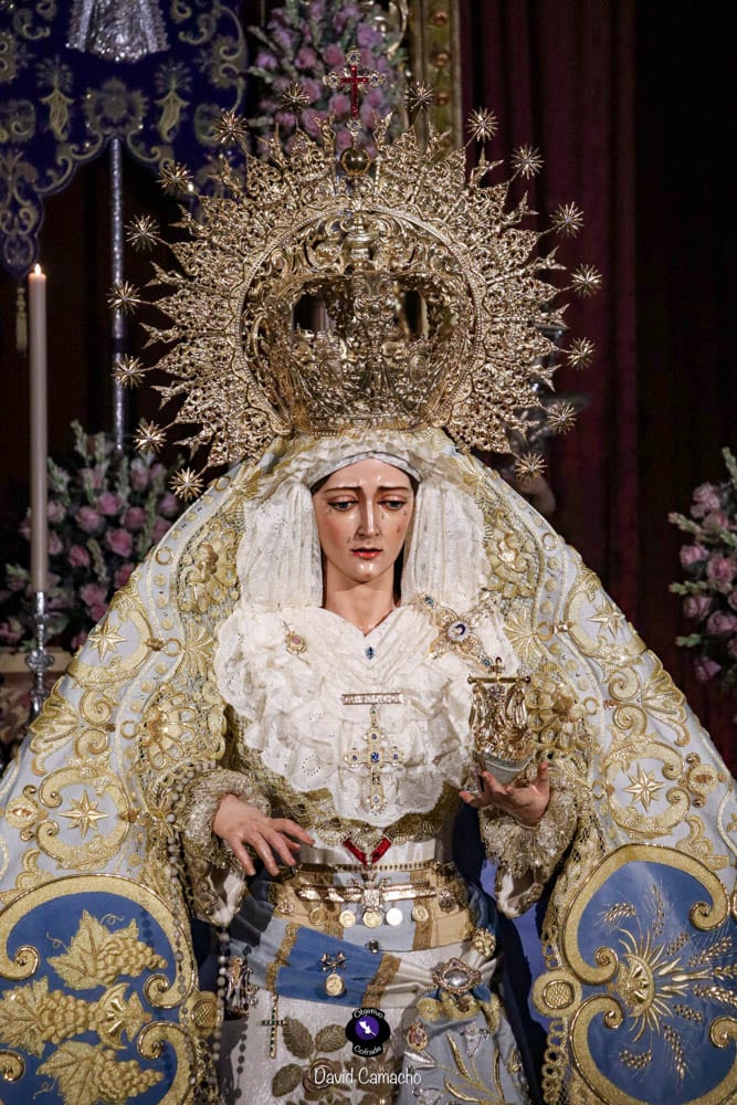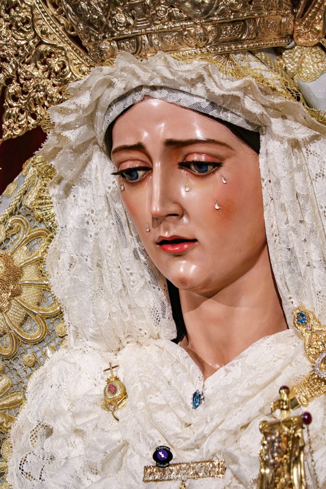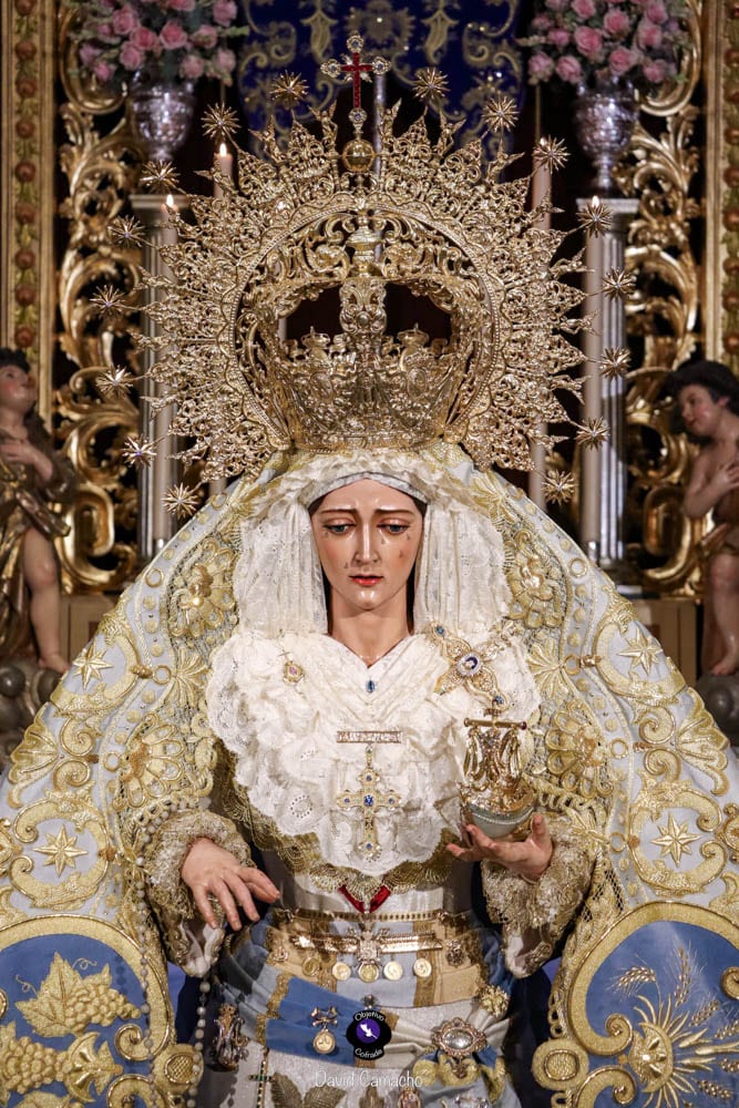 El culto se abrió en la tarde del viernes tras la celebración de la misa de hermandad, momento en el que se permitió también a los fotógrafos captar las primeras estampas de la dolorosa vestida de Reina y entronizada en un altar dispuesto con esmero por el equipo de priostía. La Virgen luce en esta ocasión un nuevo manto de salida, además de un tocado compuesto por mantilla de blonda de seda española, puñetas de encaje de bolillos en hilo de oro y un fajín bordado a realce en tejidos nobles.