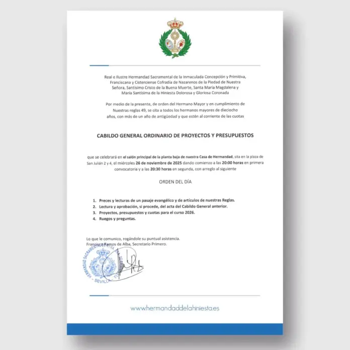 La⁢ Hermandad de la​ Hiniesta ha citado a todos sus hermanos​ mayores de 18 años, con más de un año⁤ de antigüedad y‌ al corriente de las cuotas, a Cabildo General Ordinario de Proyectos y Presupuestos⁢ el ⁤miércoles 26 de noviembre de⁤ 2025, a las 20:00 horas en primera⁤ convocatoria y a las 20:30 horas en segunda, en la ‍Casa Hermandad.