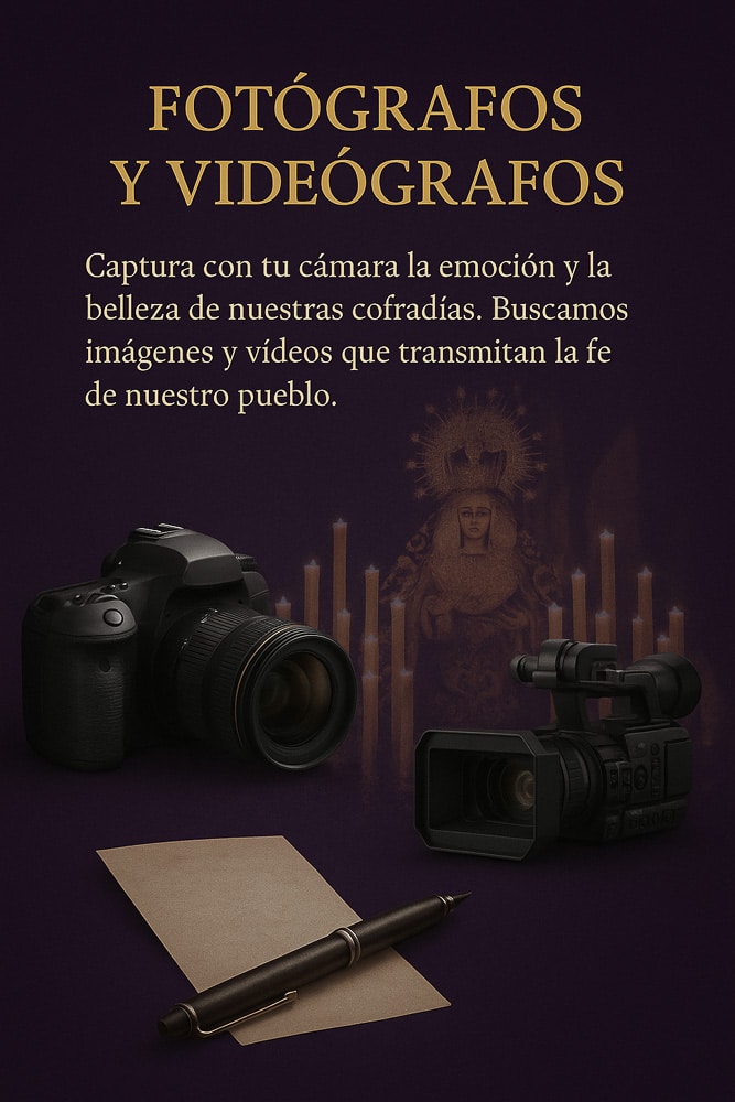 Si quieres colaborar como fotógrafo, videografo, redactor o aportar tus ideas para hacer crecer nuestra comunidad cofrade, rellena el siguiente formulario y cuéntanos más sobre ti.