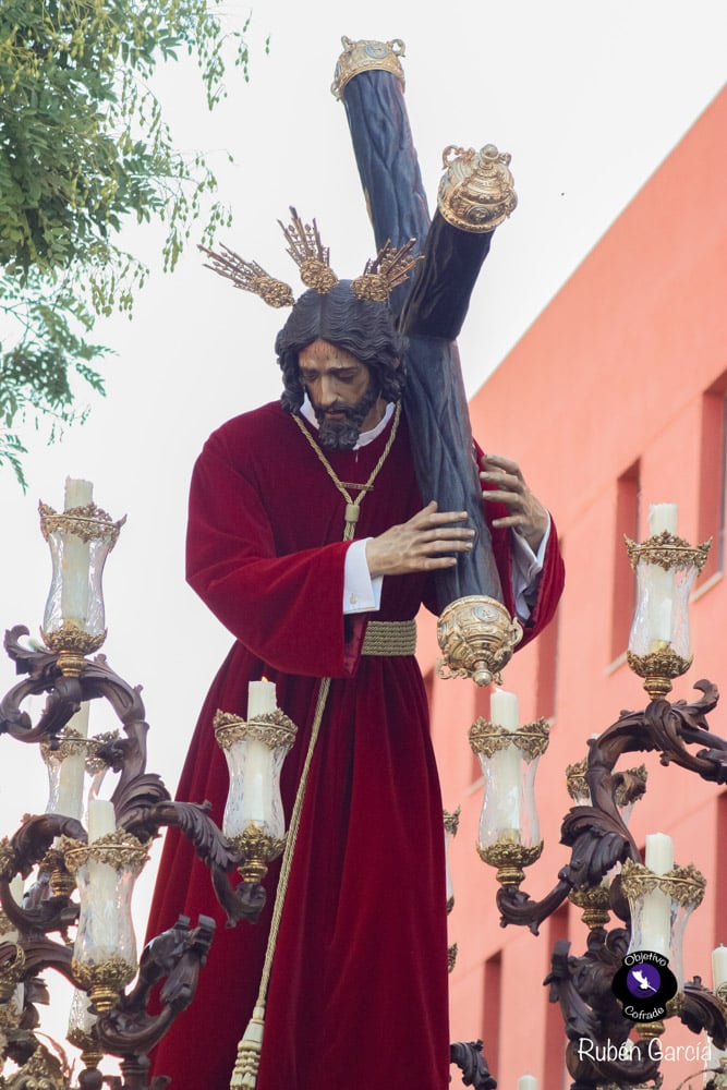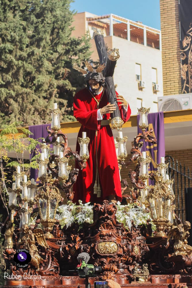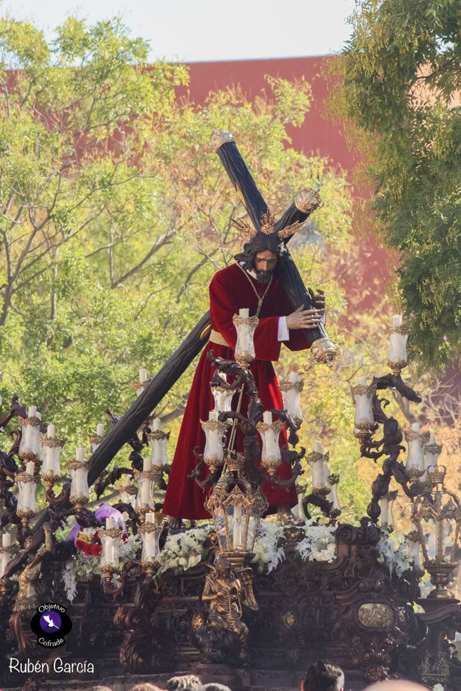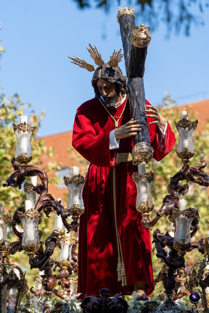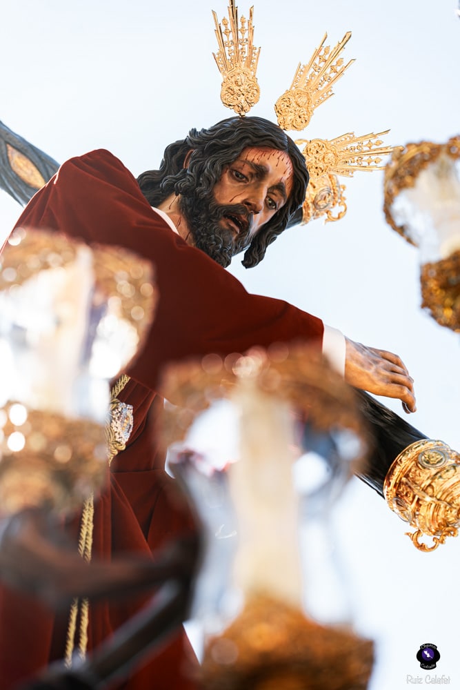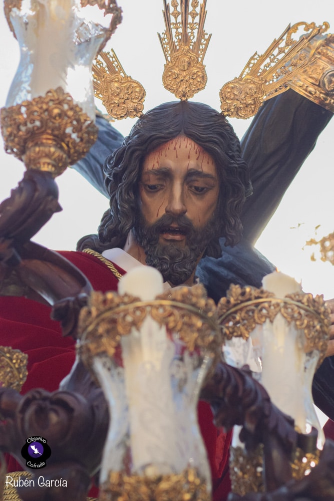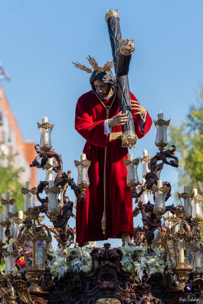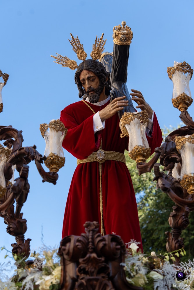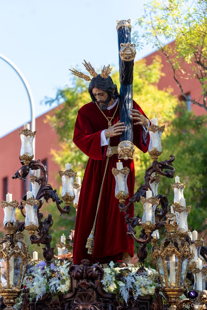 Para esta jornada tan especial, el Señor del Divino Perdón procesionó sobre el paso cedido por la Hermandad del Cerro del Águila, una soberbia obra de Francisco Verdugo tallada en madera de cedro en 2019, de estilo barroco y elegante presencia. La imagen, revestida con una nueva túnica, ofrecía una estampa serena y sobrecogedora, caminando en solitario, como en sus primeros años de vida corporativa.