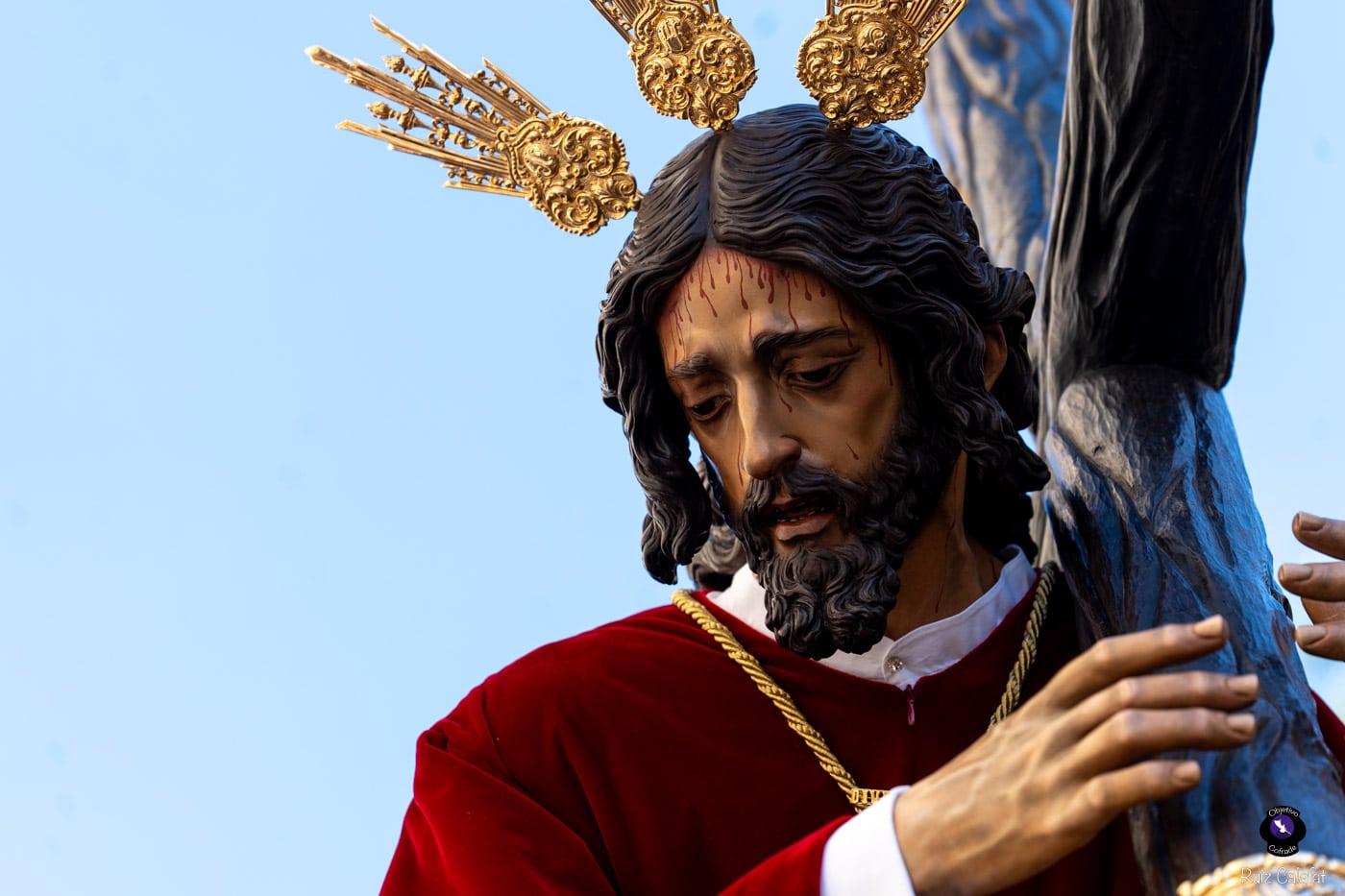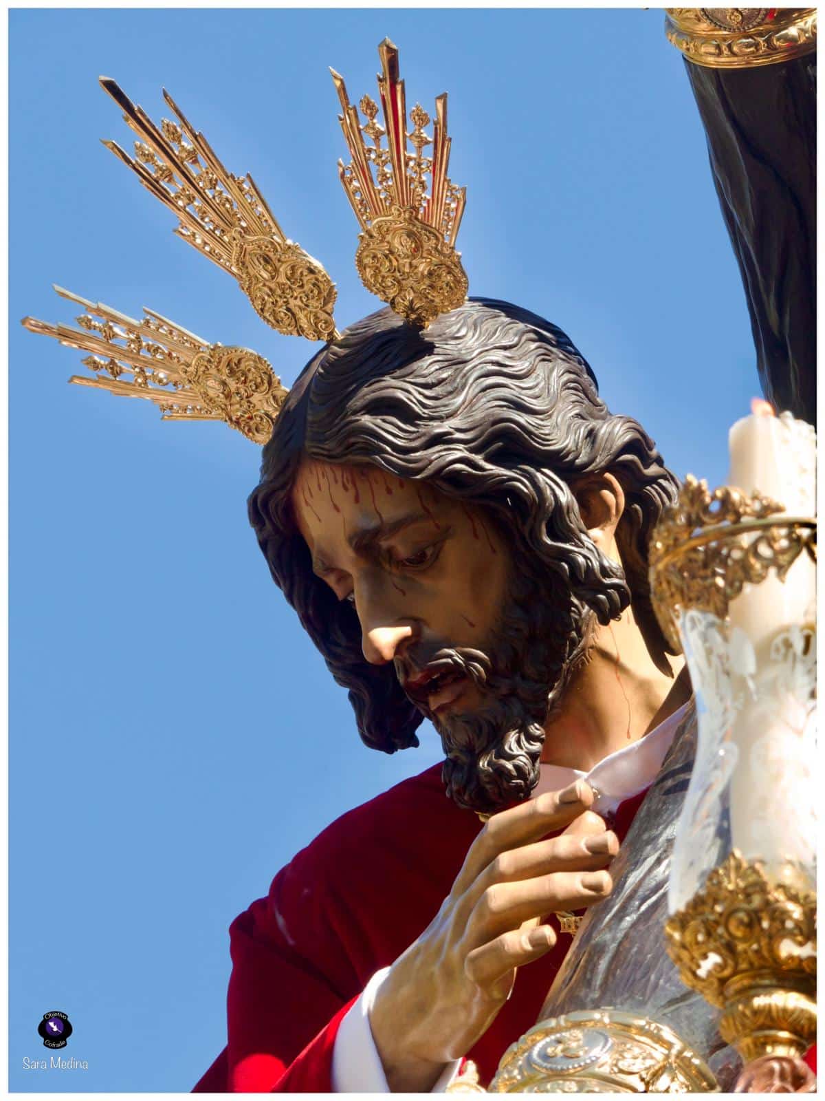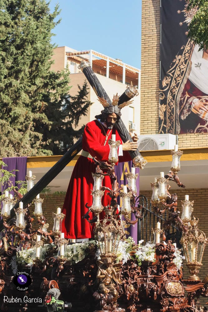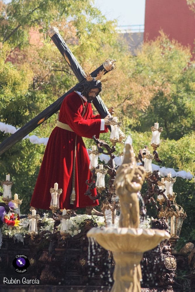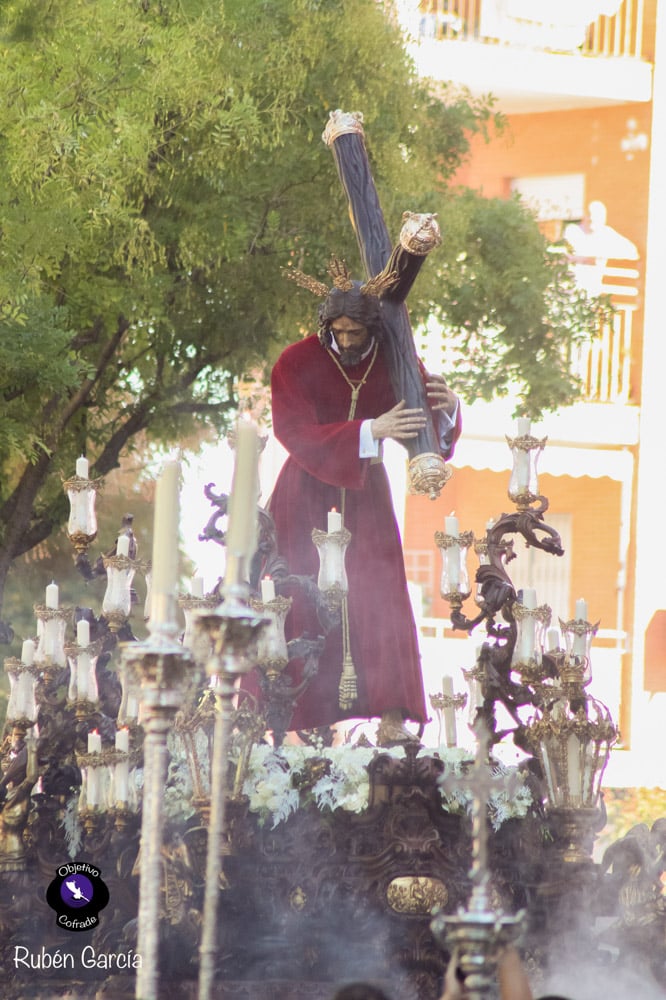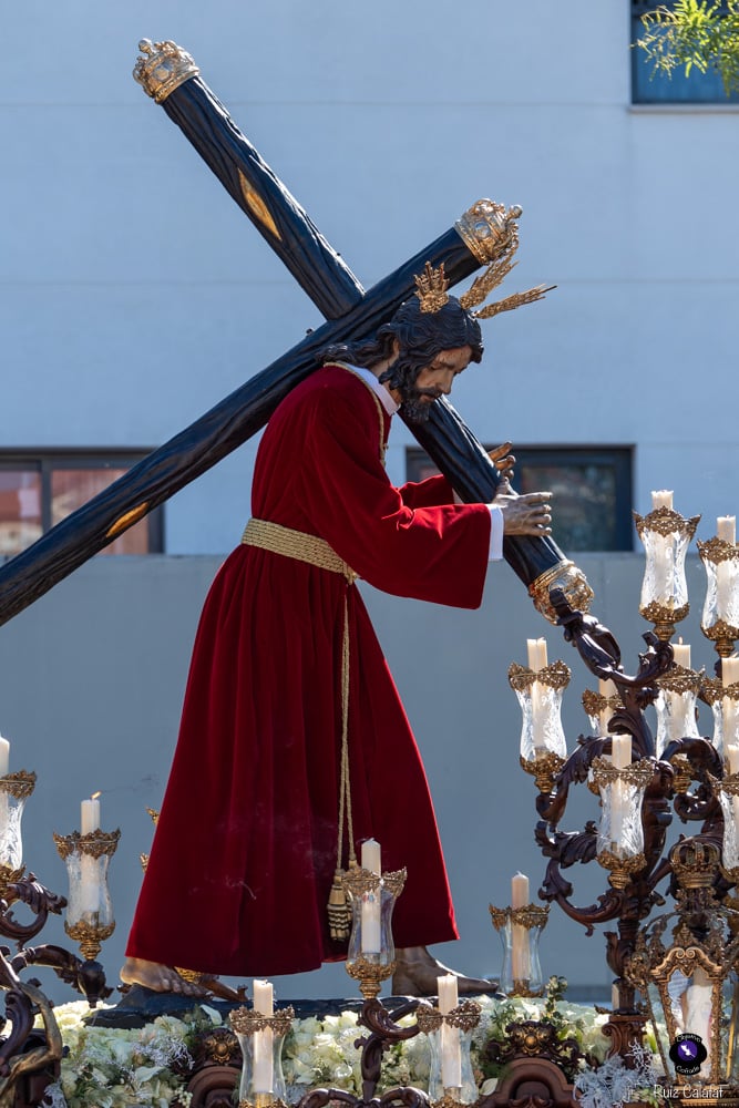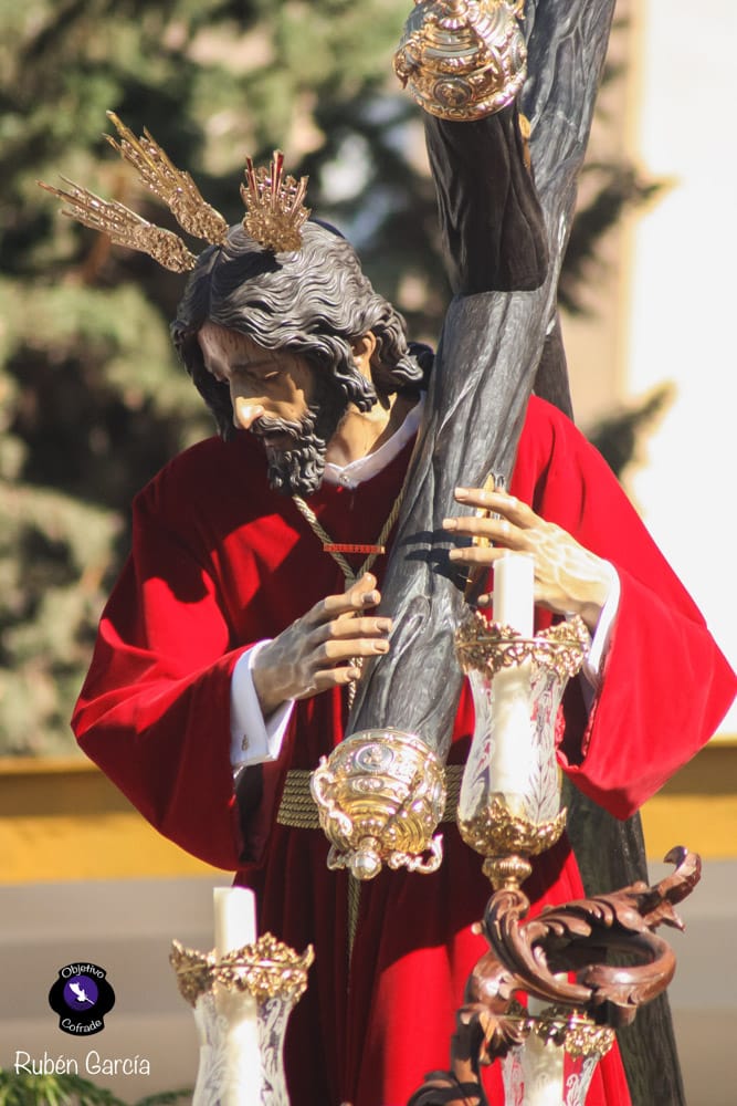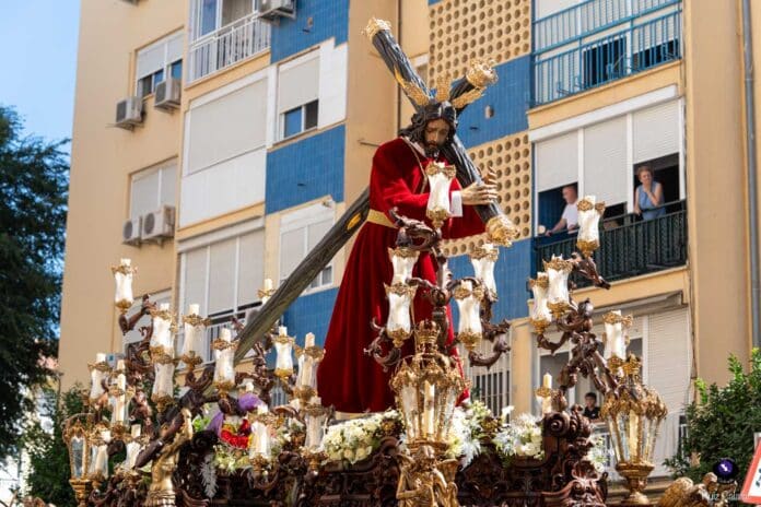 Para esta jornada tan especial, el Señor del Divino Perdón procesionó sobre el paso cedido por la Hermandad del Cerro del Águila, una soberbia obra de Francisco Verdugo tallada en madera de cedro en 2019, de estilo barroco y elegante presencia. La imagen, revestida con una nueva túnica, ofrecía una estampa serena y sobrecogedora, caminando en solitario, como en sus primeros años de vida corporativa.