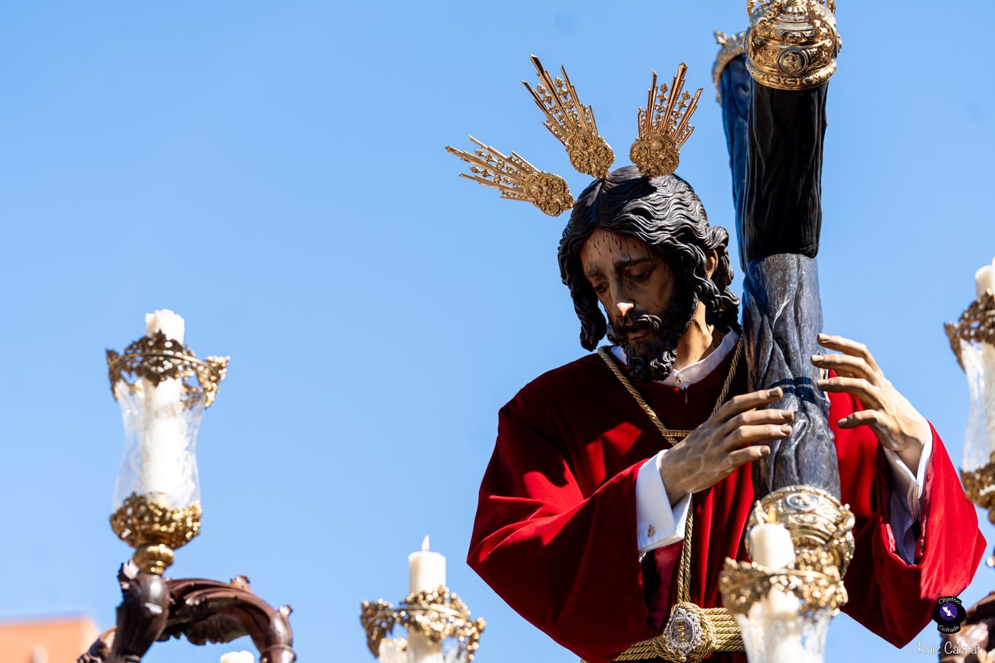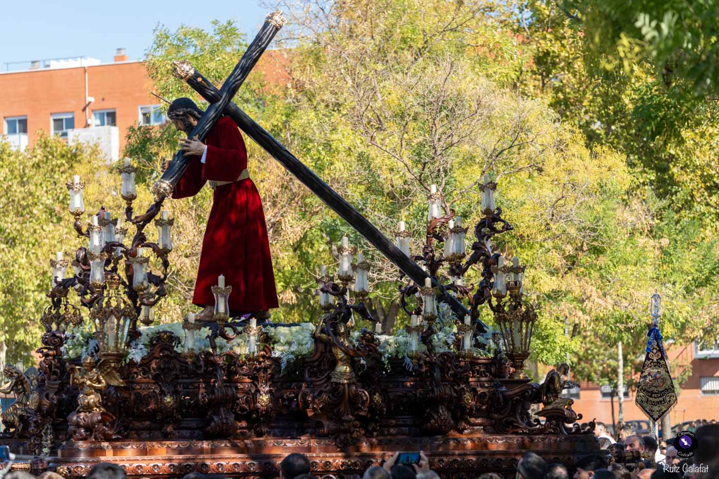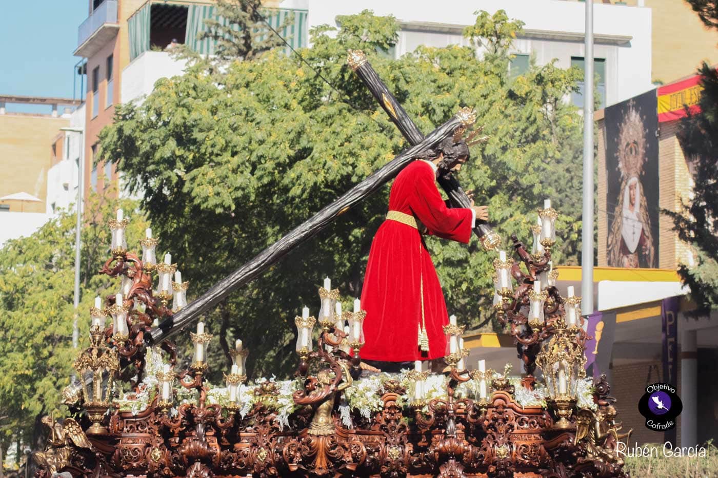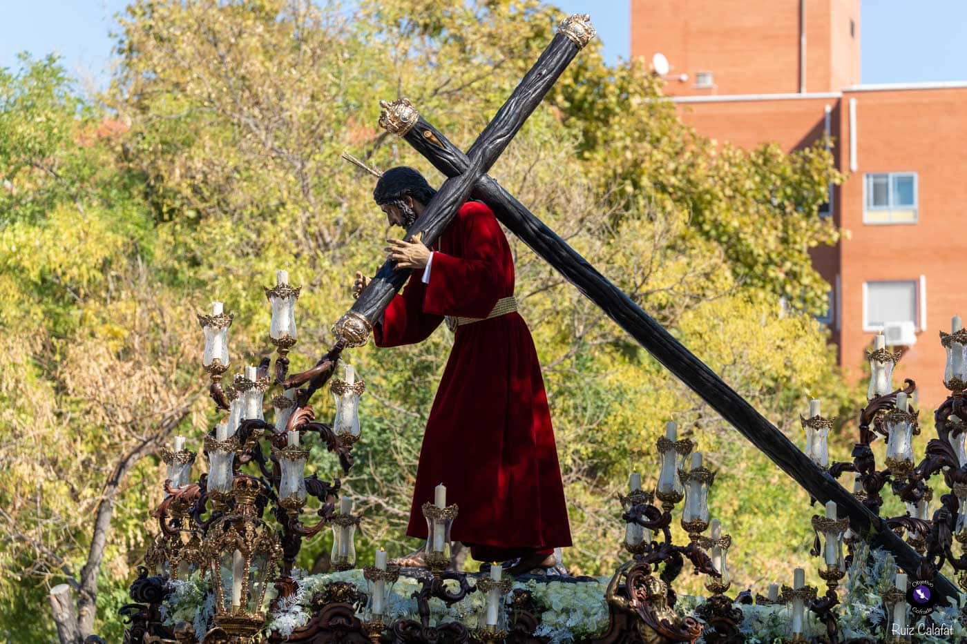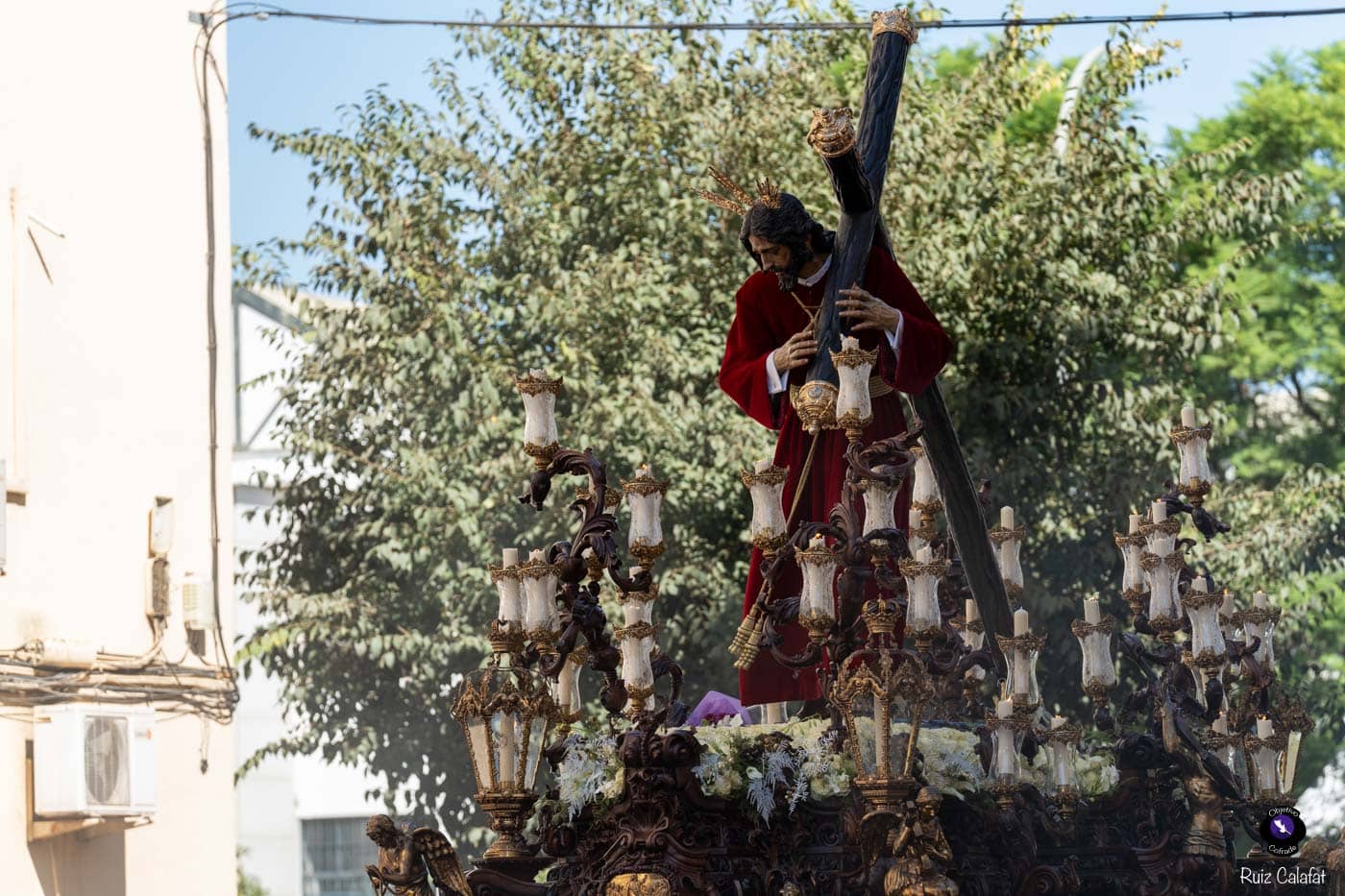 Para esta jornada tan especial, el Señor del Divino Perdón procesionó sobre el paso cedido por la Hermandad del Cerro del Águila, una soberbia obra de Francisco Verdugo tallada en madera de cedro en 2019, de estilo barroco y elegante presencia. La imagen, revestida con una nueva túnica, ofrecía una estampa serena y sobrecogedora, caminando en solitario, como en sus primeros años de vida corporativa.