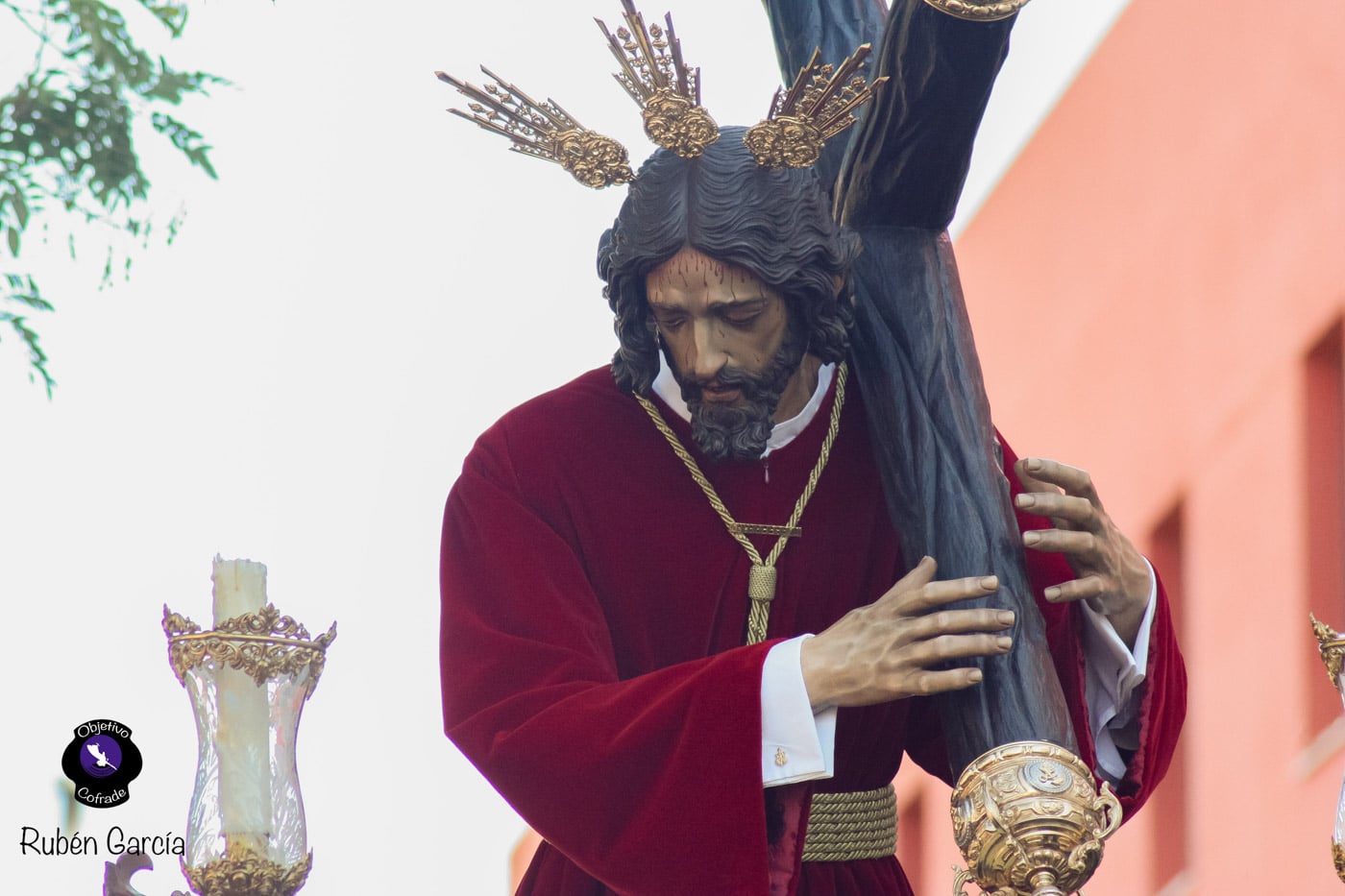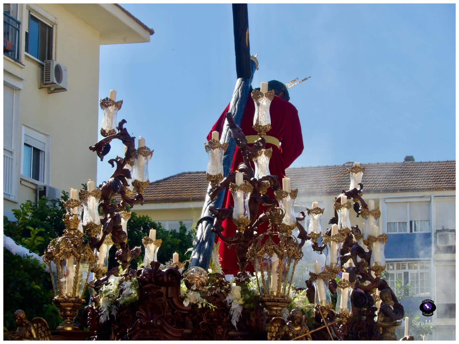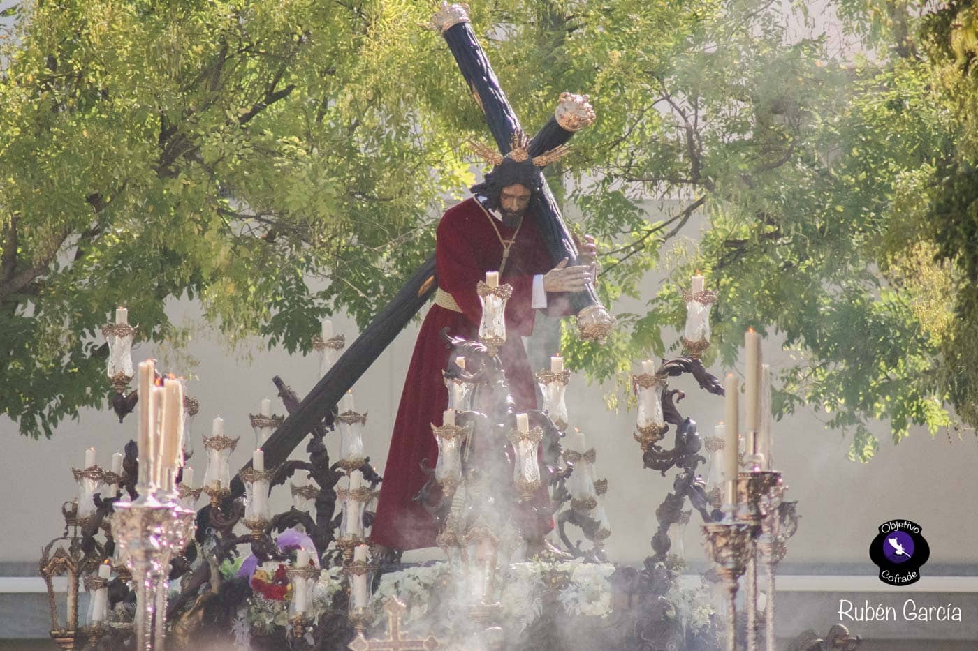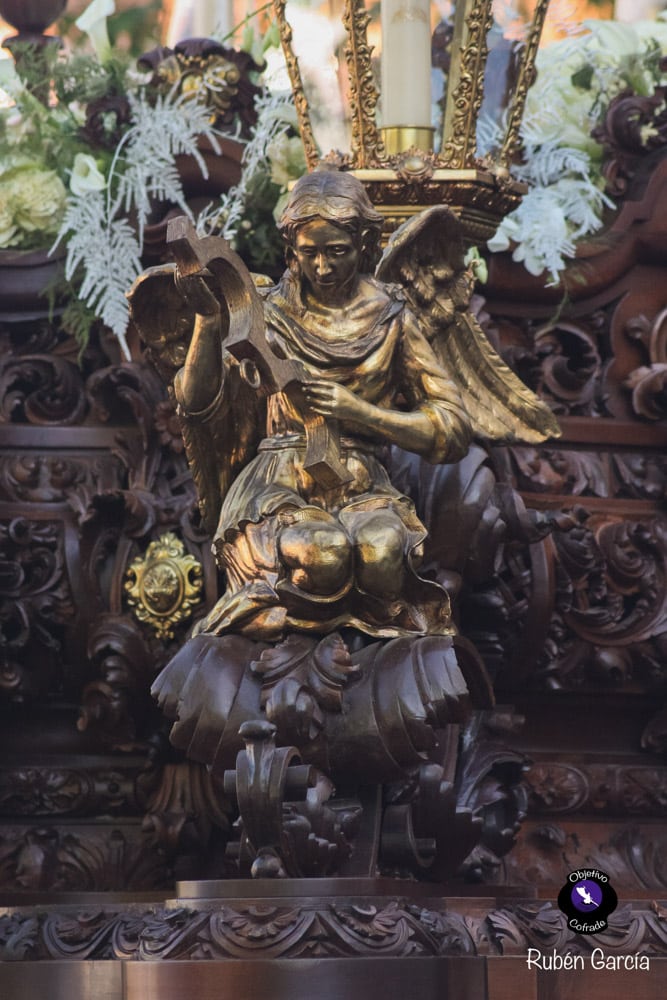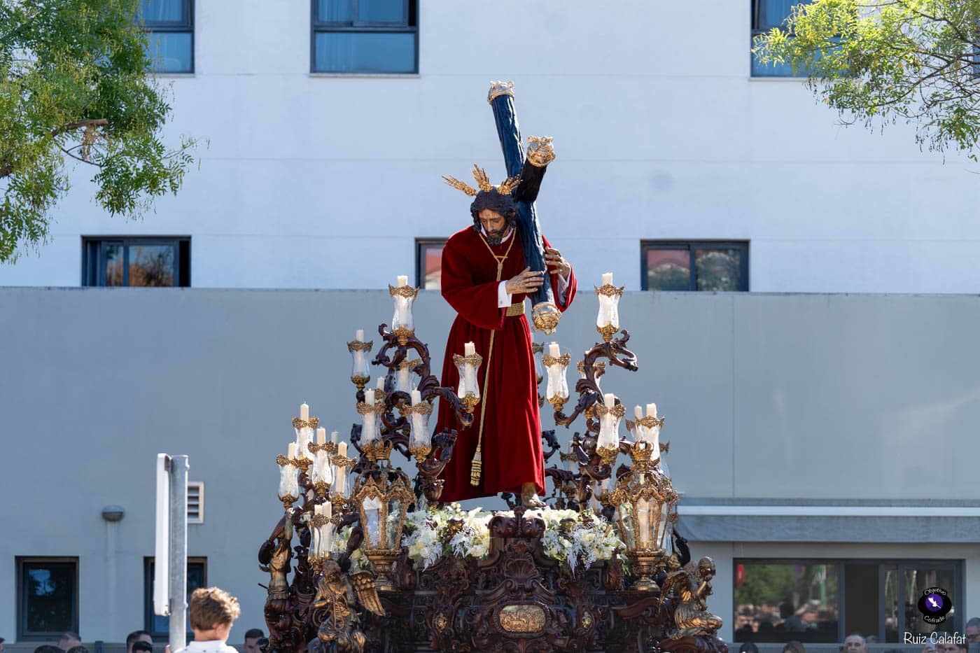 Para esta jornada tan especial, el Señor del Divino Perdón procesionó sobre el paso cedido por la Hermandad del Cerro del Águila, una soberbia obra de Francisco Verdugo tallada en madera de cedro en 2019, de estilo barroco y elegante presencia. La imagen, revestida con una nueva túnica, ofrecía una estampa serena y sobrecogedora, caminando en solitario, como en sus primeros años de vida corporativa.