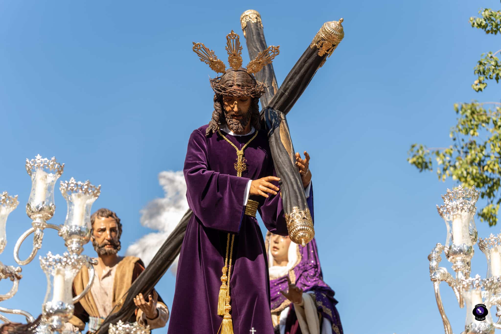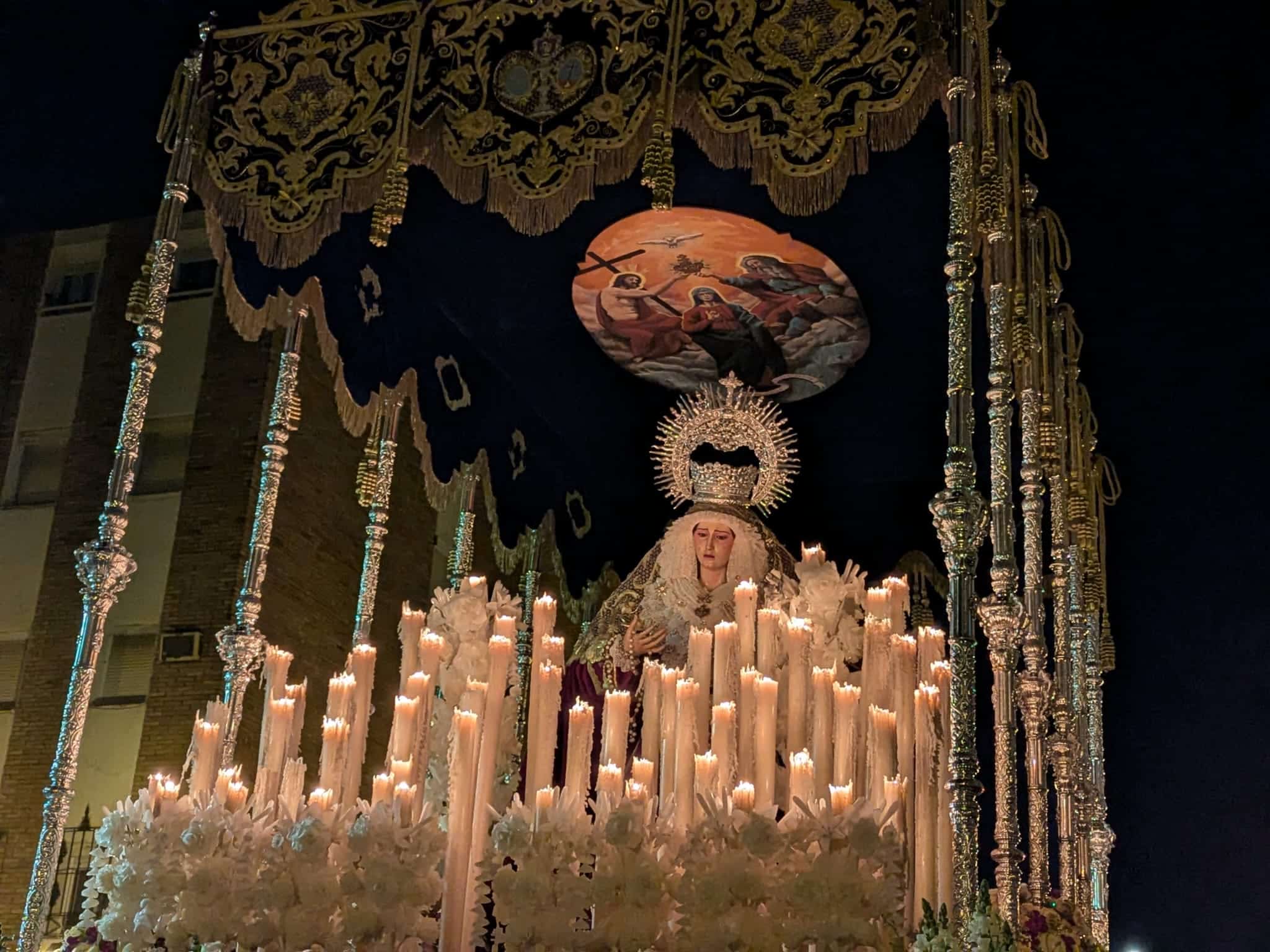 Uno de los puntos de mayor afluencia fue, sin duda, la Parroquia de la Milagrosa. Allí, la Hermandad de la Milagrosa volvió a dar una lección de elegancia. El paso de misterio de Nuestro Padre Jesús de la Esperanza en el Puente del Cedrón avanzó con su característica fuerza, mientras que María Santísima del Rosario lucía radiante en su palio, perfectamente preparada para su cita anual con Sevilla.