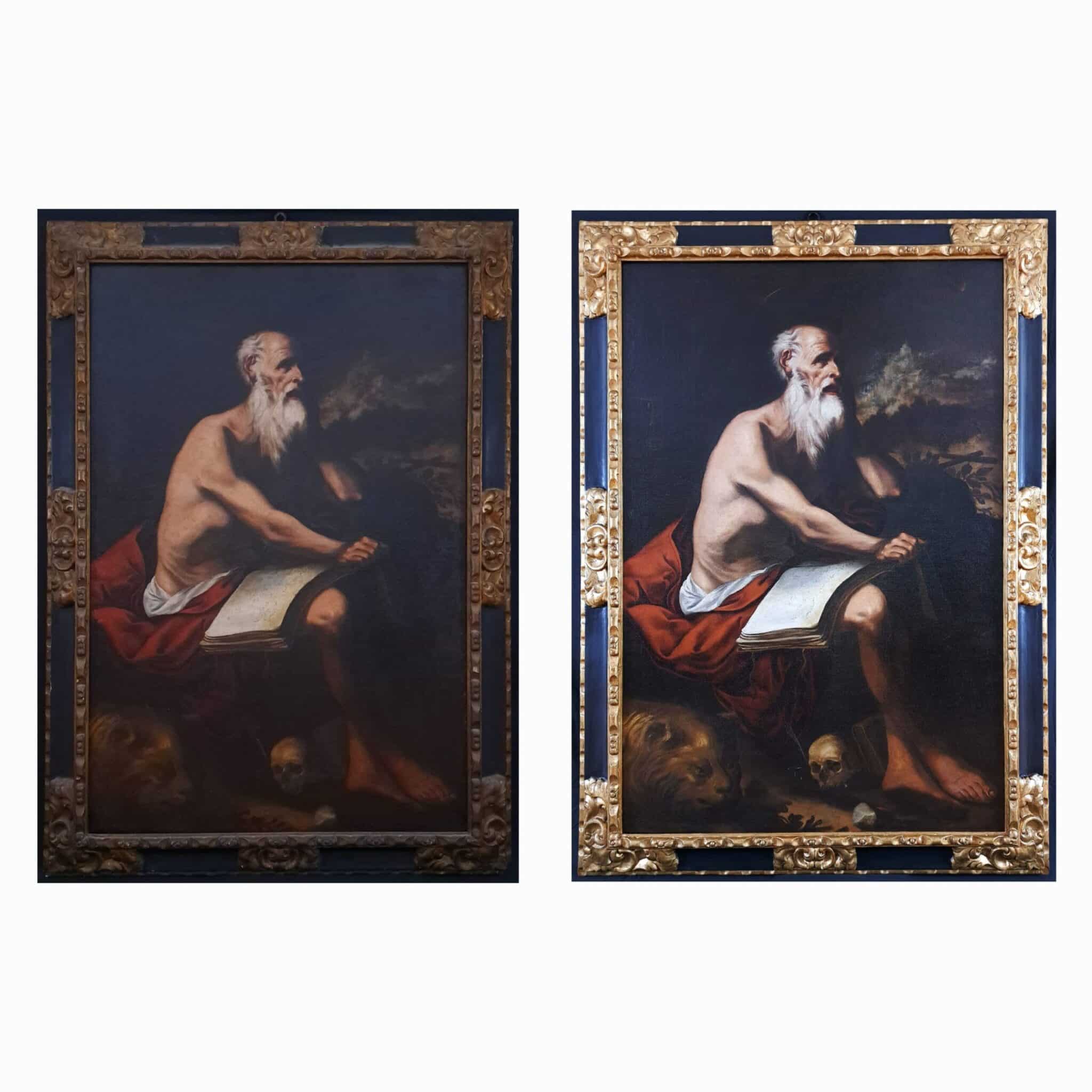 La meticulosa labor de Cardo Pacheco ha abarcado tanto el lienzo –de considerables dimensiones (177 x 127 cm)– como su marco, devolviendo la integridad física y estética a toda la pieza. El resultado es palpable: la pintura ha recuperado su luminosidad original y una riqueza cromática que permite apreciar de nuevo la intensa expresividad del santo en penitencia. Ahora es posible una lectura adecuada de la composición, lo que revaloriza significativamente su calidad artística, su significado devocional y su incuestionable valor histórico-patrimonial.