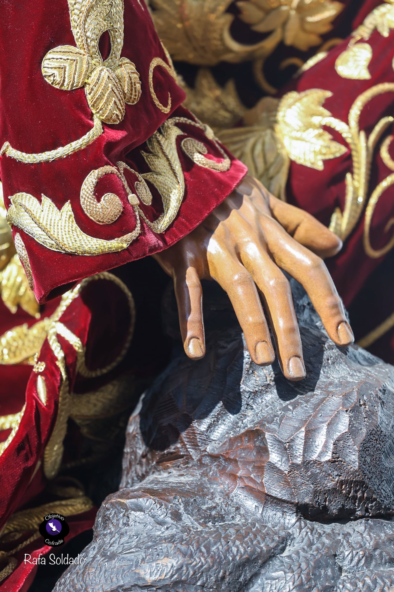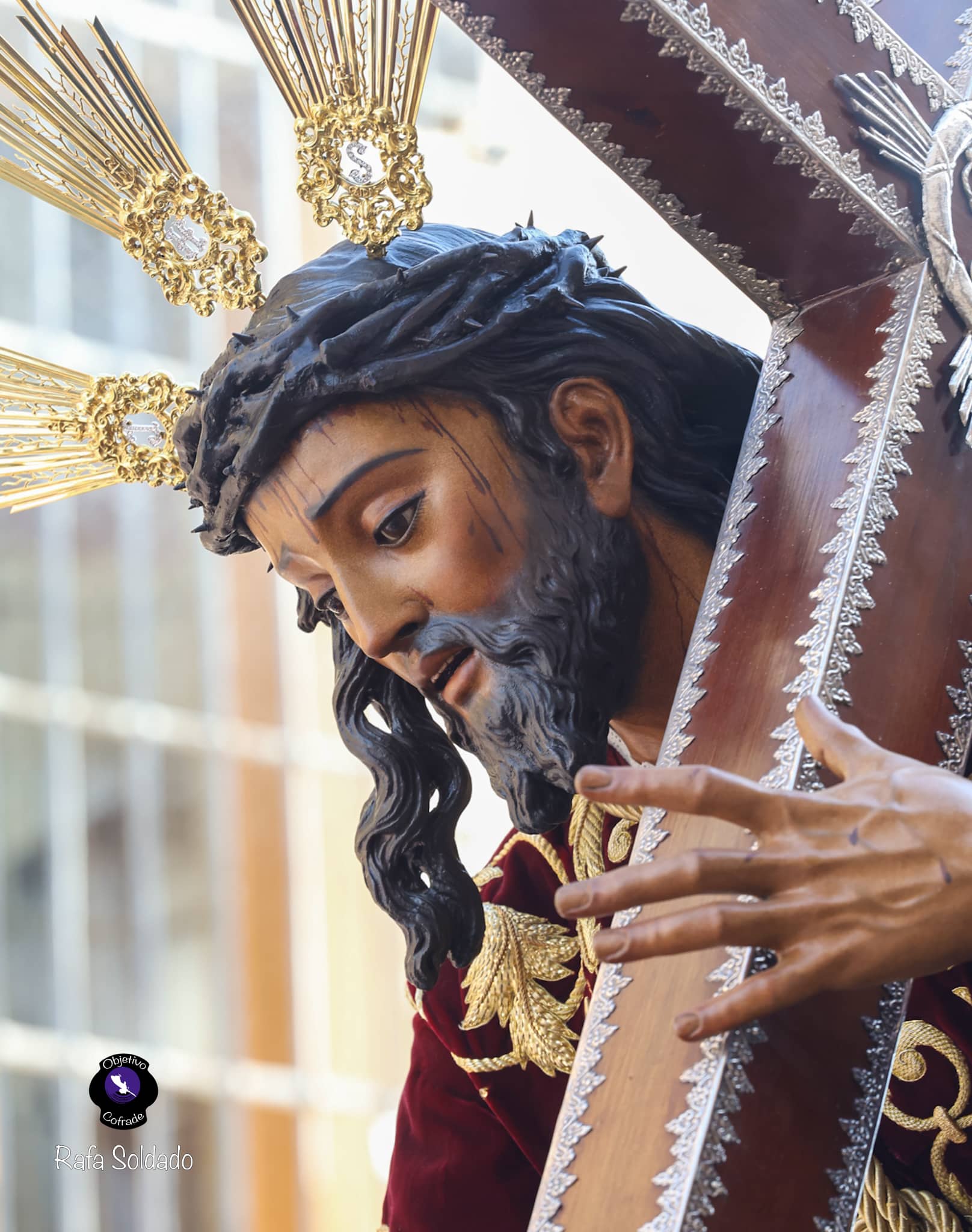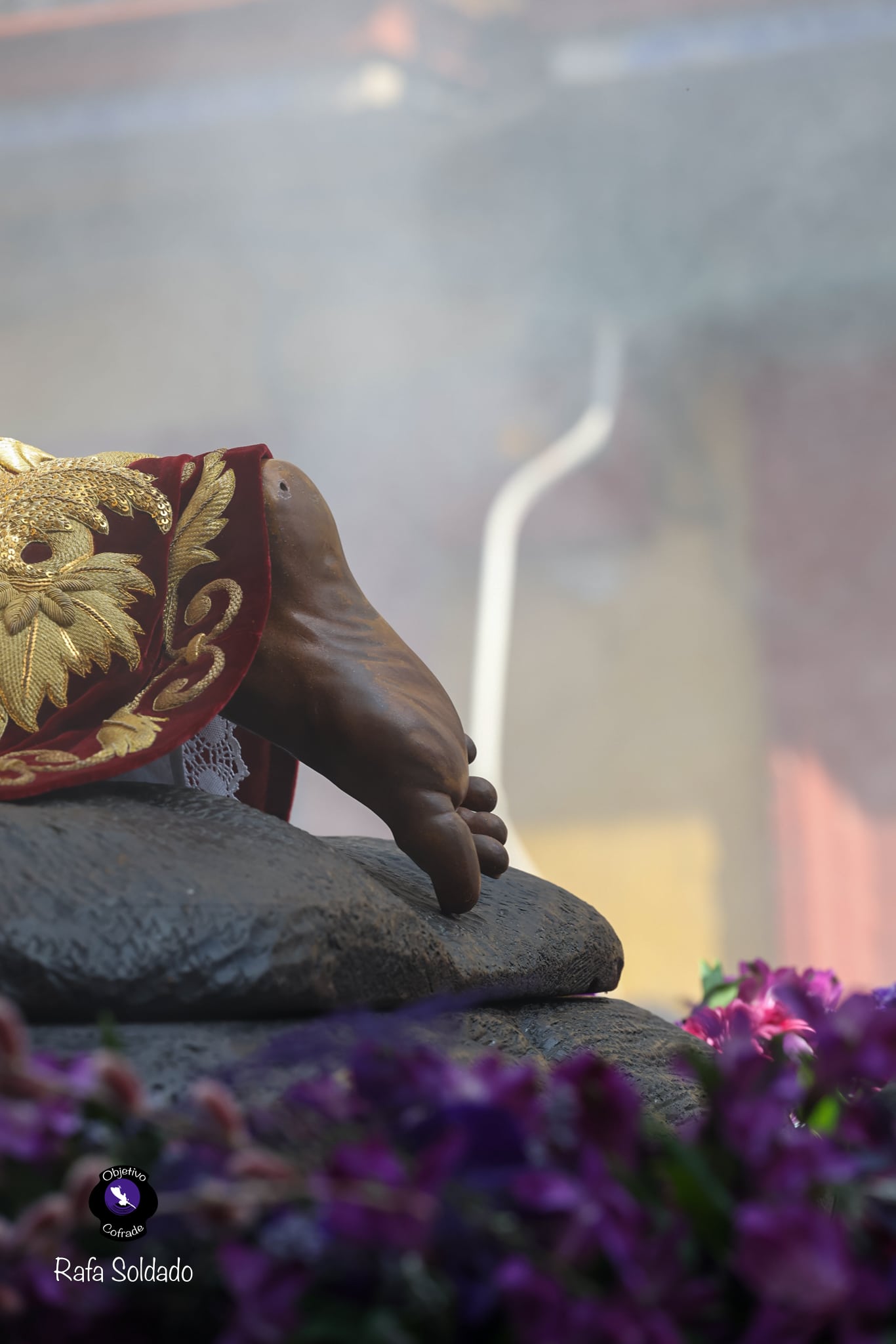 La salida desde la parroquia dejó imágenes de gran solemnidad. El Señor fue portado en andas por sus hermanos, en medio de una densa nube de incienso y con los sones de la Banda de Cornetas y Tambores San Juan Evangelista, formación propia de la hermandad, que acompañó musicalmente durante todo el recorrido.