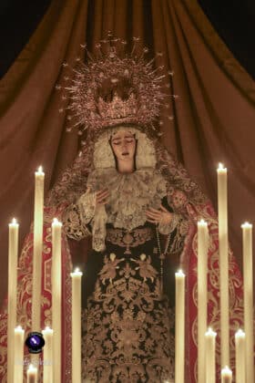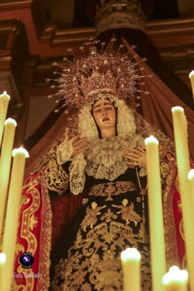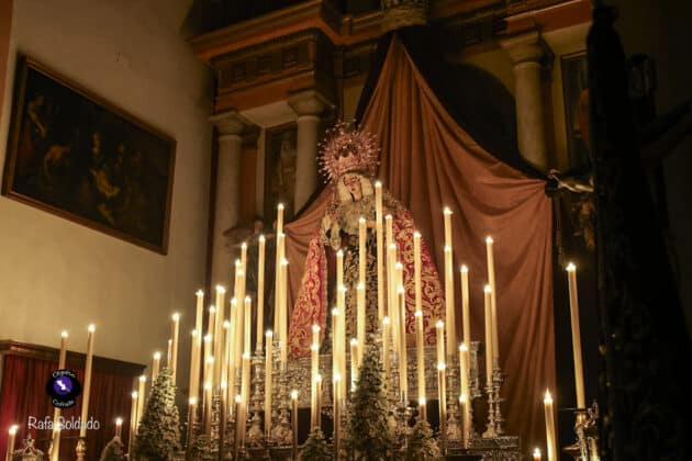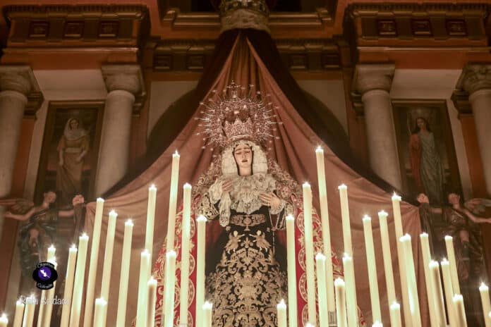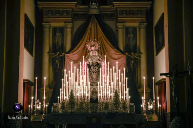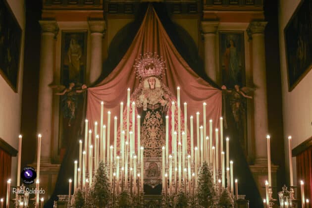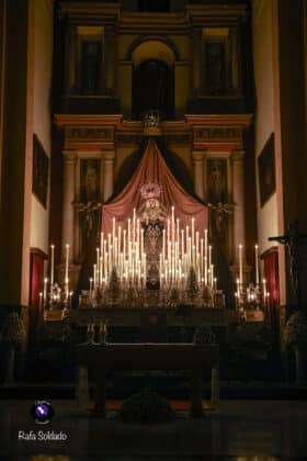 El altar dispuesto para este triduo ha vuelto a poner de relieve el cuidado y el gusto litúrgico de la corporación del Martes Santo. La Virgen de la Encarnación se presenta como eje central de un montaje sobrio y elegante, concebido para favorecer el recogimiento y la oración, con una iluminación que realza la imagen y refuerza el carácter mariano de estos días de devoción.