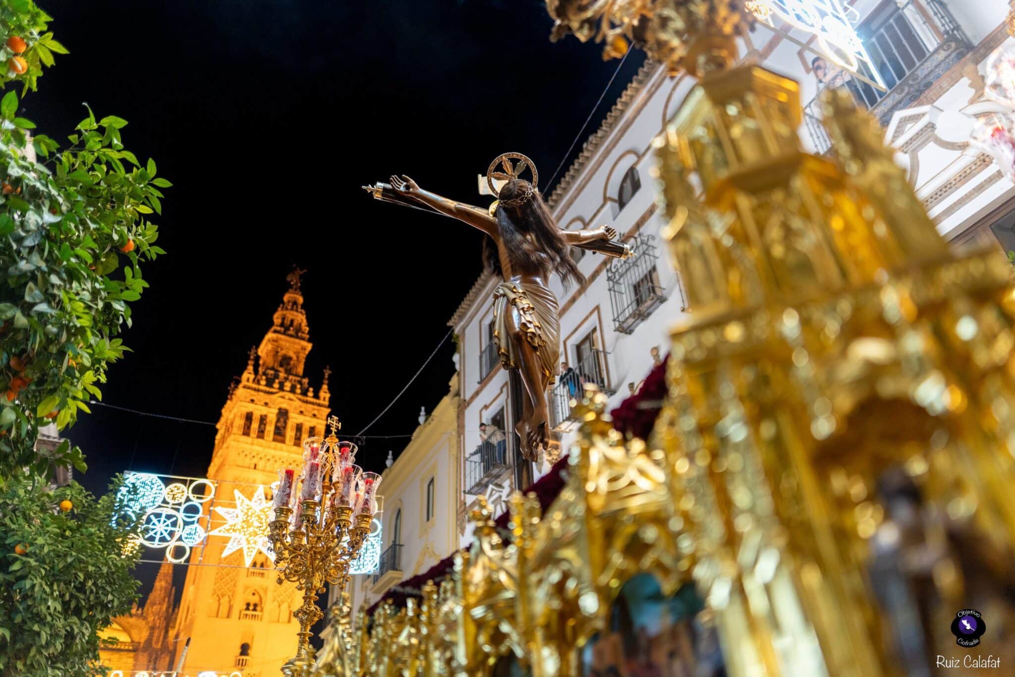 El itinerario condujo al Cristo de San Agustín por calles emblemáticas como Mateos Gago, iluminadas por las luces navideñas, creando una postal inolvidable. El bullicio propio de estas fechas se mezcló con el recogimiento de los devotos que seguían al crucificado. Al llegar al barrio de Santa Cruz, la maniobra en la estrecha calle Fabiola, ejecutada magistralmente por los capataces Villanueva, recordó las tradicionales chicotás de San Bernardo cada Miércoles Santo.
