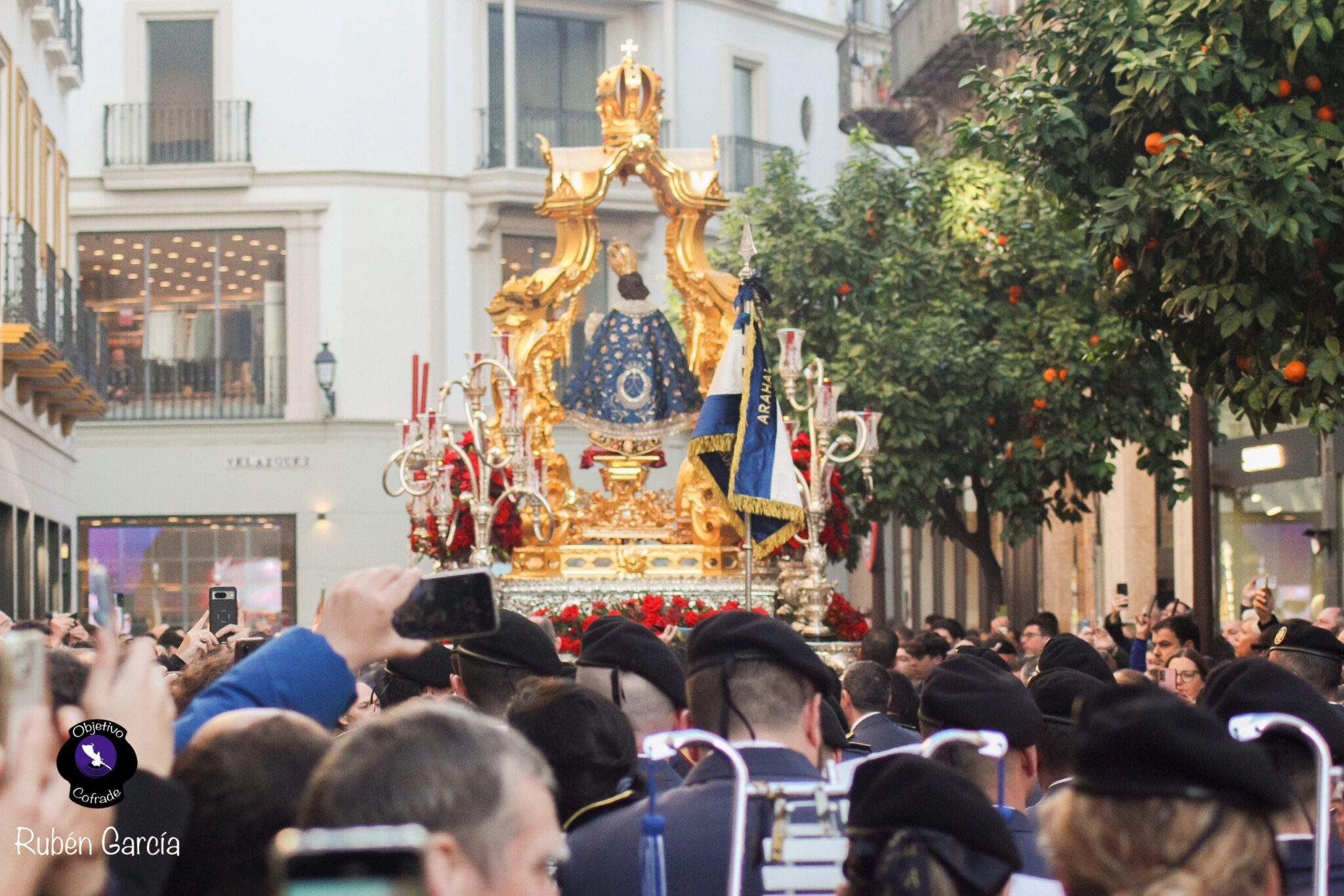 El paso lució un cuidado exorno floral, con una composición de rosas, astromelias, claveles, gerberas y crisantemos, entre otros, obra de Añil Boutique Floral. El recorrido de la procesión incluyó calles emblemáticas del centro de Sevilla, como la plaza de la Campana, Sierpes, Cerrajería, plaza del Salvador, Álvarez Quintero y plaza de San Francisco, antes de regresar al templo a las 21:30 horas.