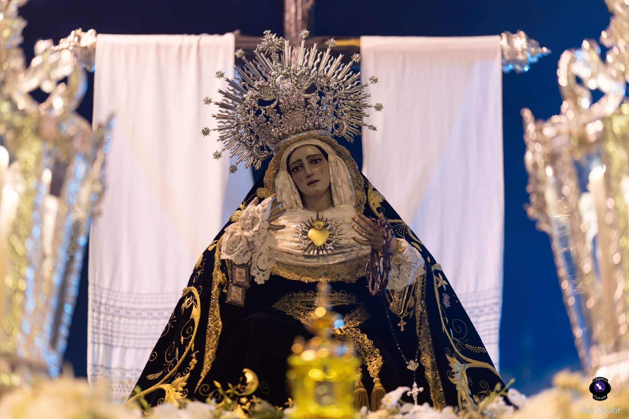La Virgen de los Dolores lució una nueva corona de plata de ley, obra de los talleres de Orfebrería Bernet, en un estilo rococó, y portó la Medalla de la Ciudad, impuesta el pasado 27 de septiembre. Vestida con saya y manto negro bordados en oro por Antonio Araujo Luna, la talla fue obra del imaginero Manuel Pineda Calderón en 1954, y reformada en 1964 para su postura actual.