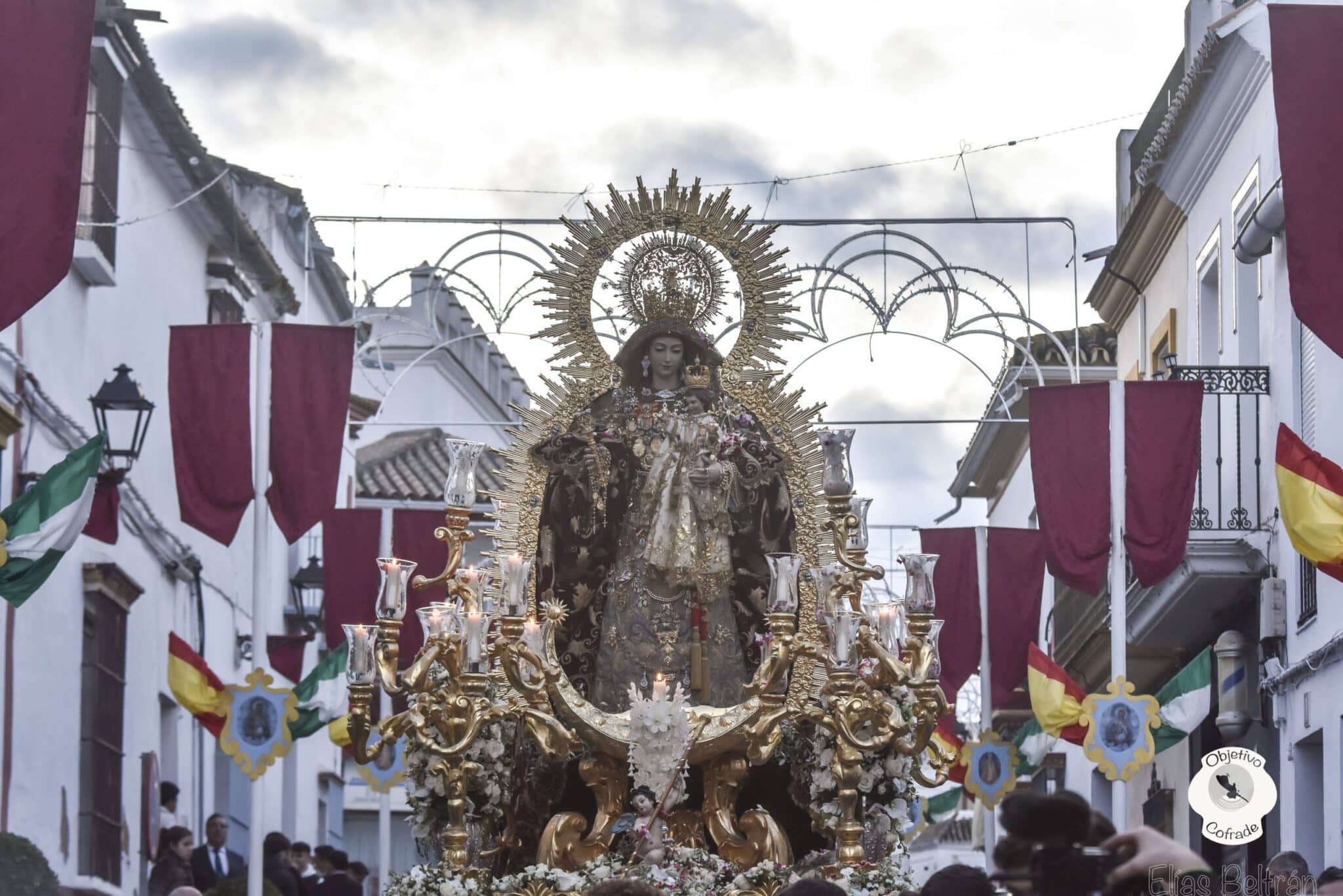 Ataviada con esmero por su vestidor y el equipo de camareras, la imagen lució enjoyada con las ofrendas de sus fieles y estrenó un tocado de blonda de oro antigua, donado por el Mayordomo de las Fiestas, Rafael Delgado Polvillo, y su familia. Este encaje, adquirido en el Anticuario Jacobo Linde, realzó aún más la belleza de la Virgen en su paso procesional, exornado con un exquisito conjunto floral compuesto por orquídeas cymbidium, rosas vendela, rosas spray, claveles chinos, miniclavel, hipericum, flor de cera, pitosporino y esparragueras.