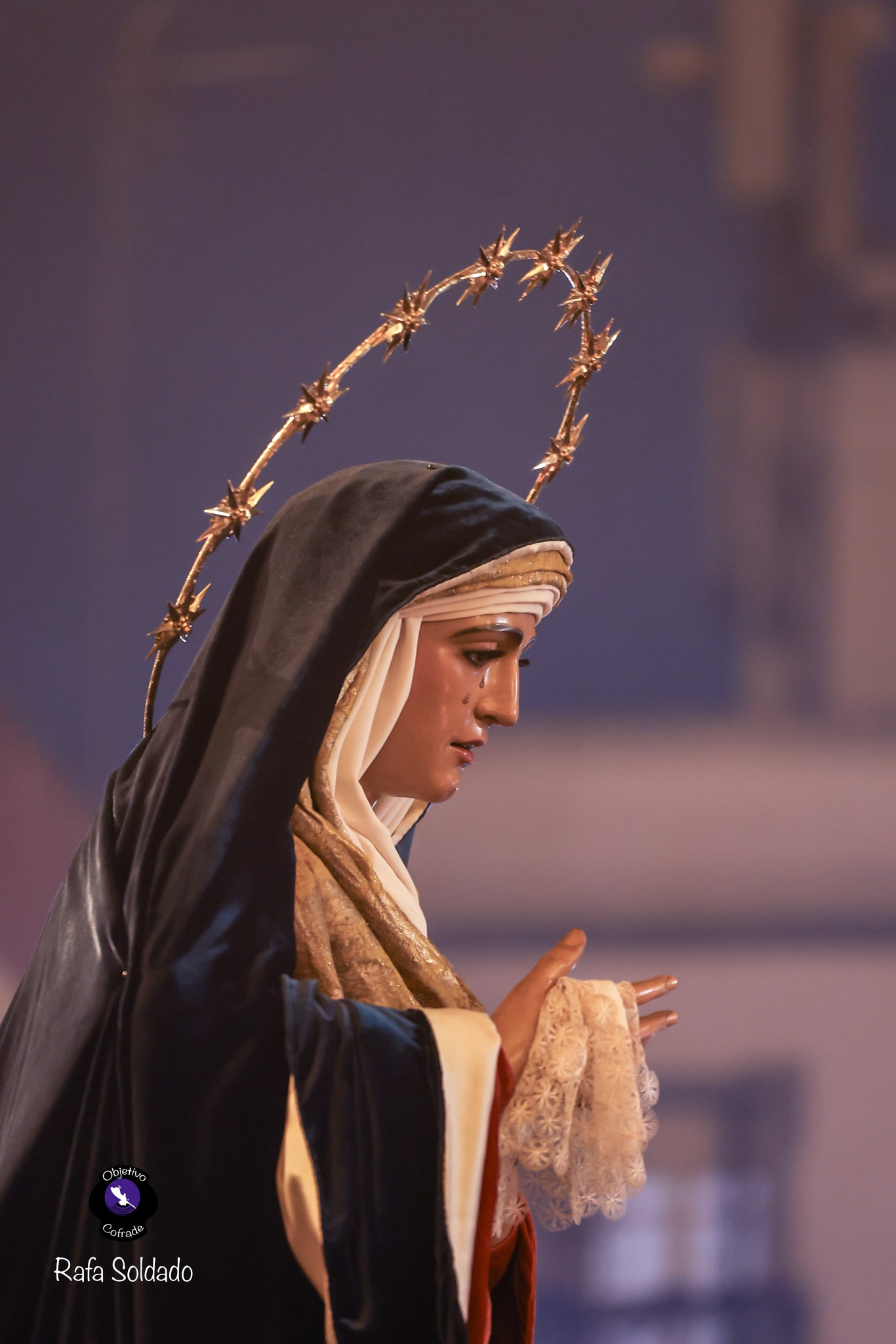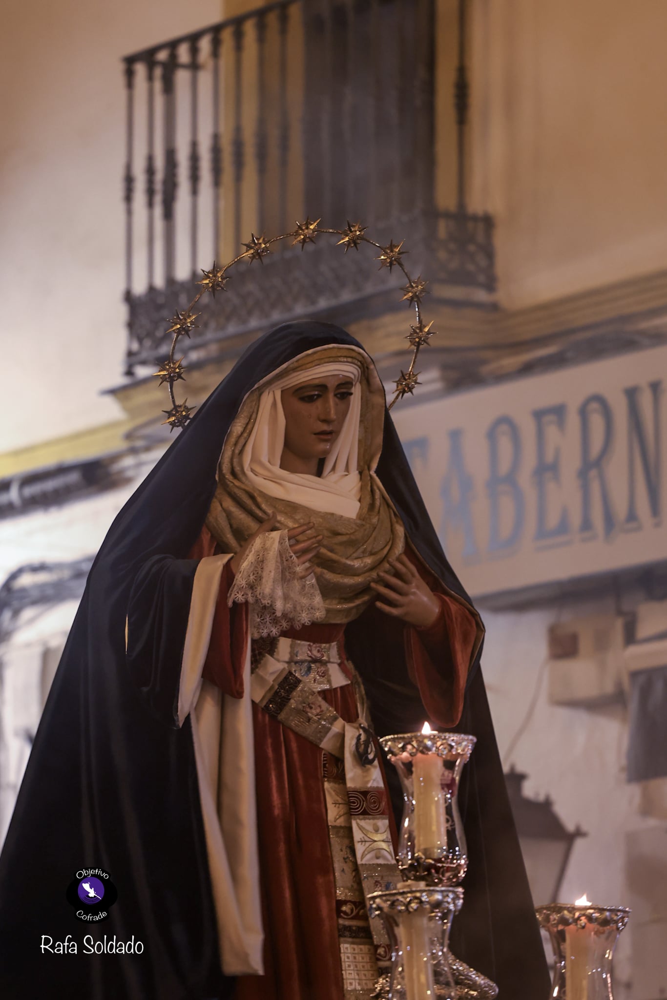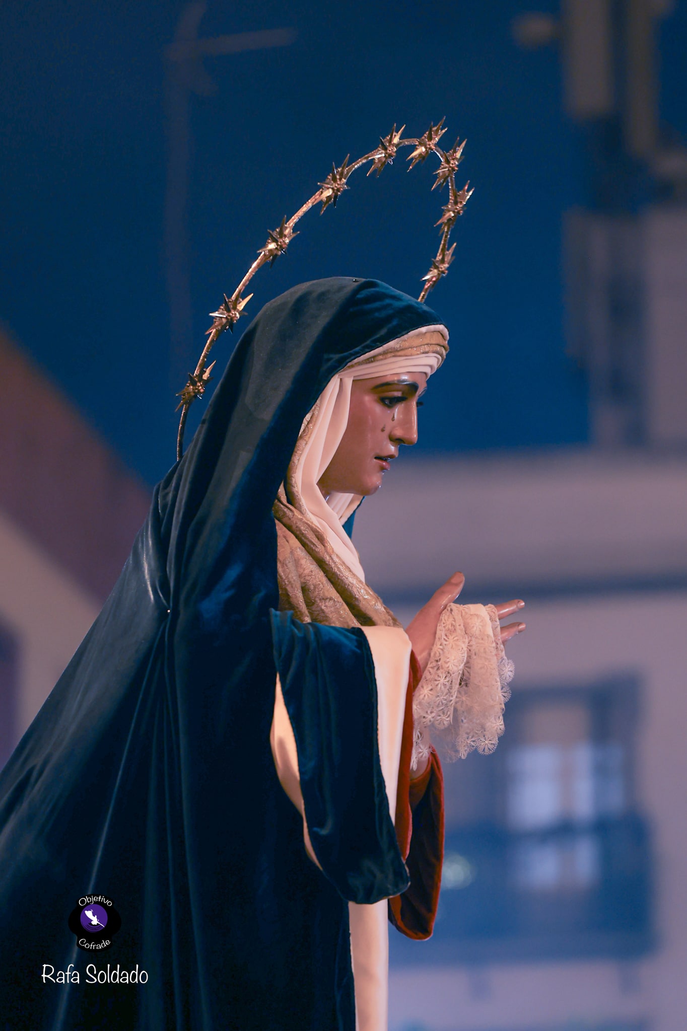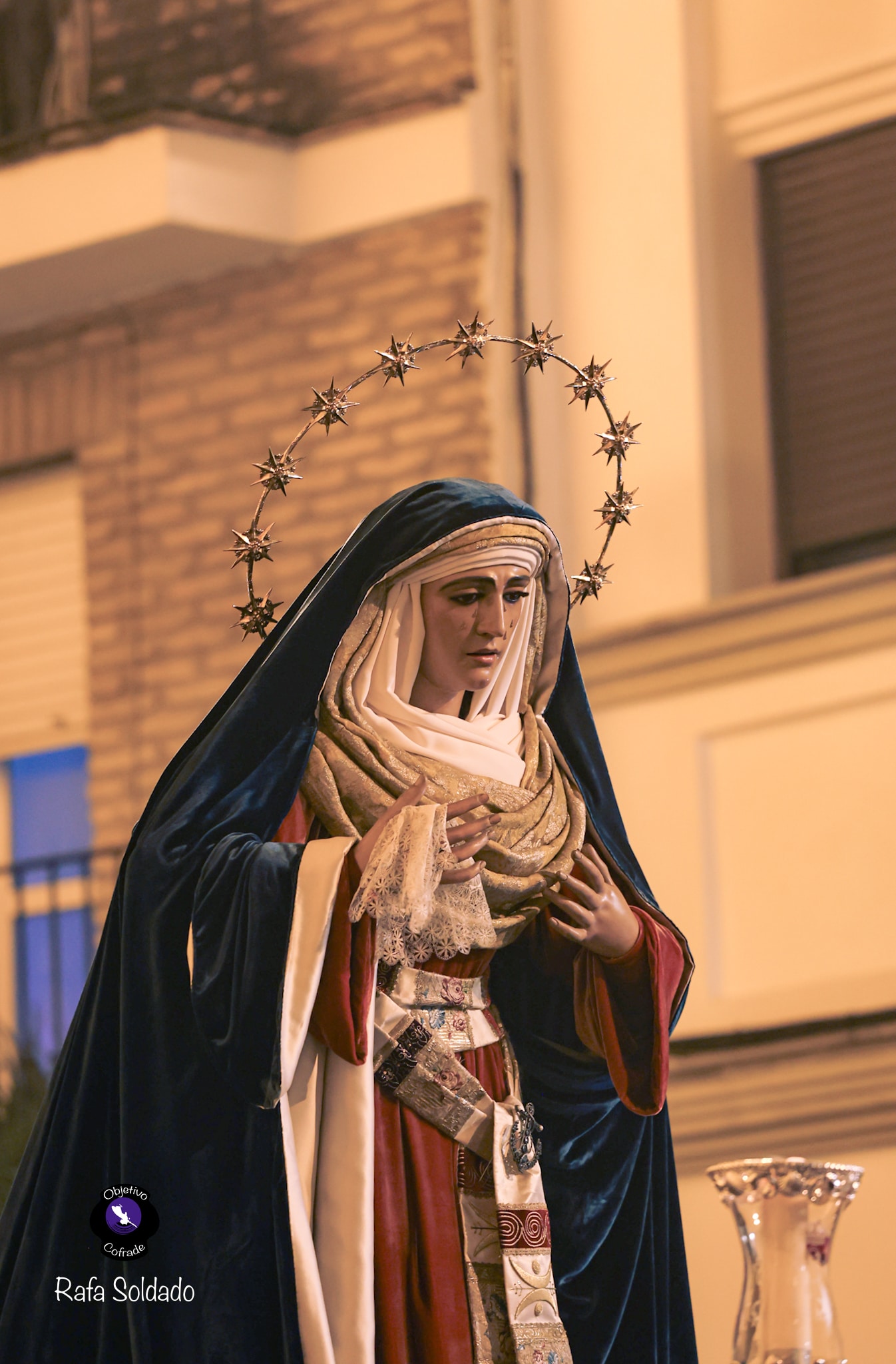 Para esta ocasión, la dolorosa se presentó vestida con indumentaria de estilo hebreo, acorde con el tiempo litúrgico. Lucía saya de terciopelo rojo y manto azul, conjunto estrenado en 2021, acompañado por un tocado confeccionado en raso de seda con brocado italiano de finales del siglo XVIII. Completaba su atuendo el fajín bordado por Julián Torres en 2014, pieza donada por un grupo de hermanos.