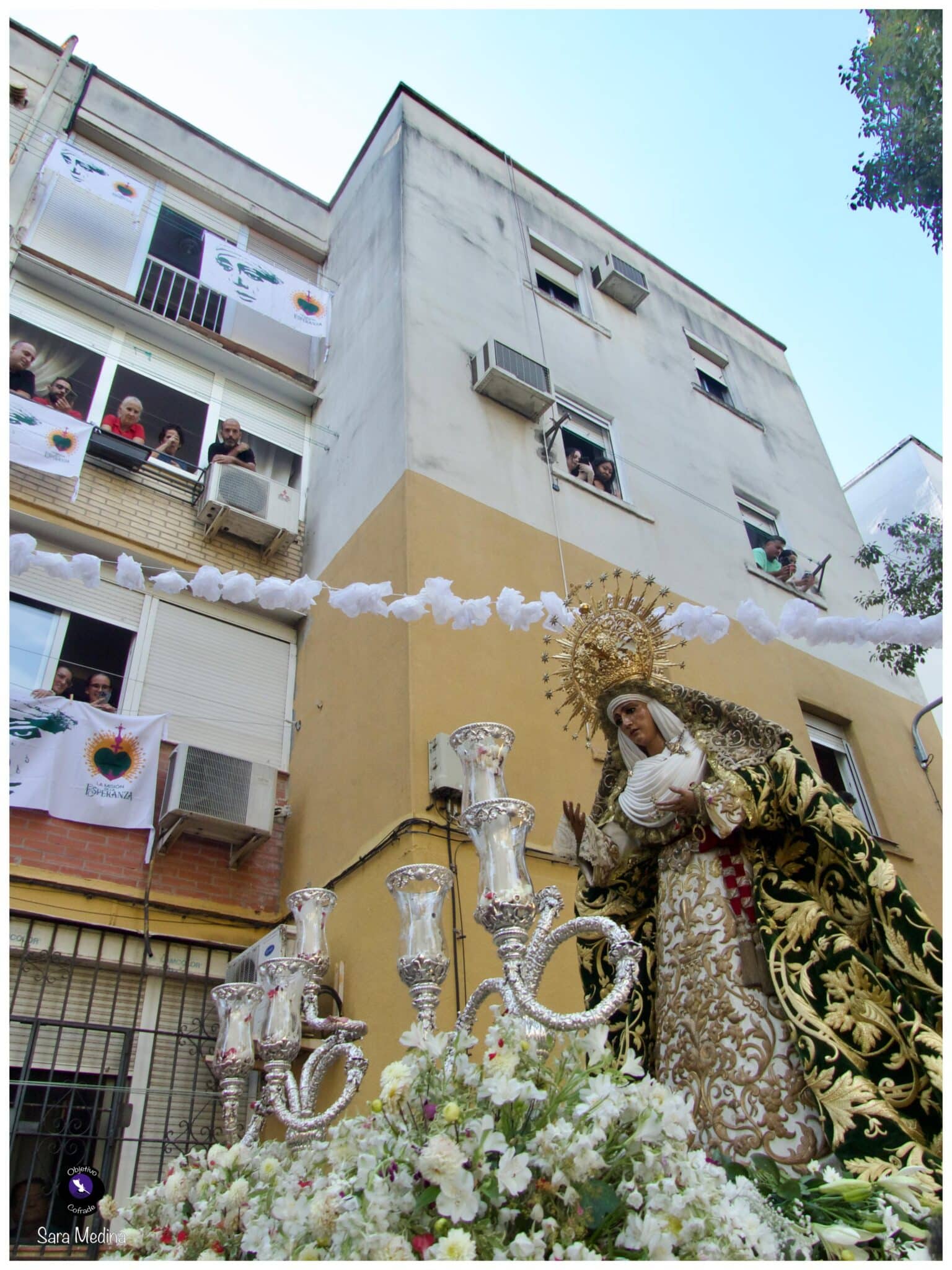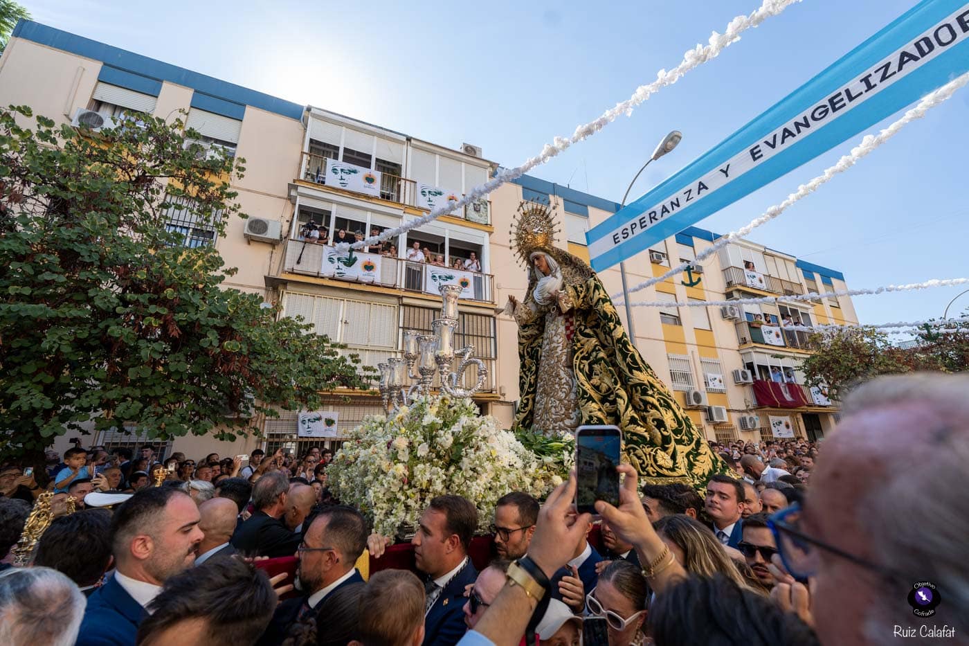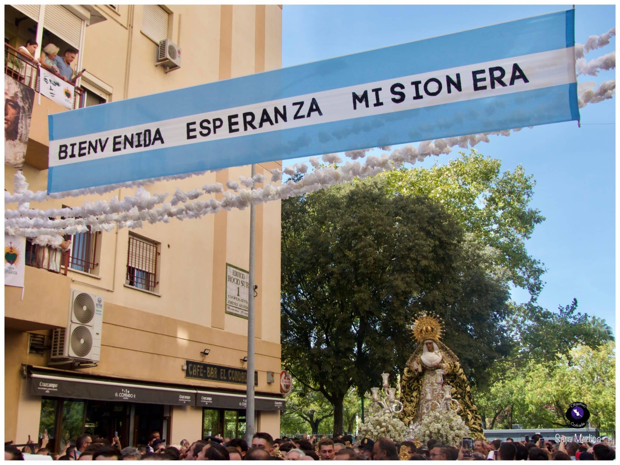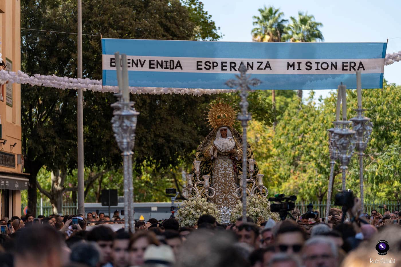 Sevilla, 6 de octubre de 2025. — La jornada del sábado quedará grabada en la memoria de Triana y de toda Sevilla. La Virgen de la Esperanza cruzó el corazón de la ciudad para llegar al barrio de las 3.000 Viviendas, donde permanecerá durante los próximos días dentro de la denominada Misión de la Esperanza.