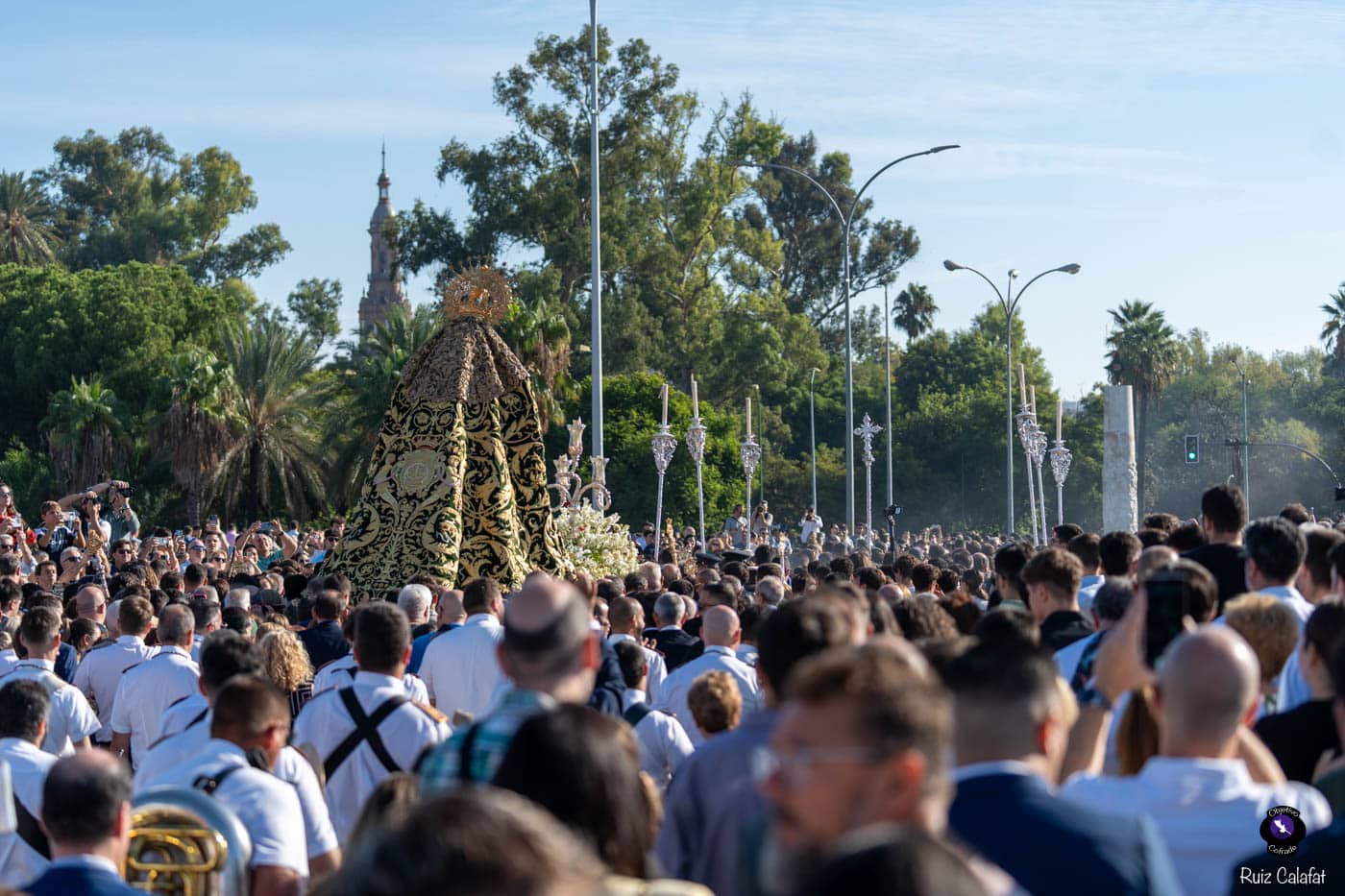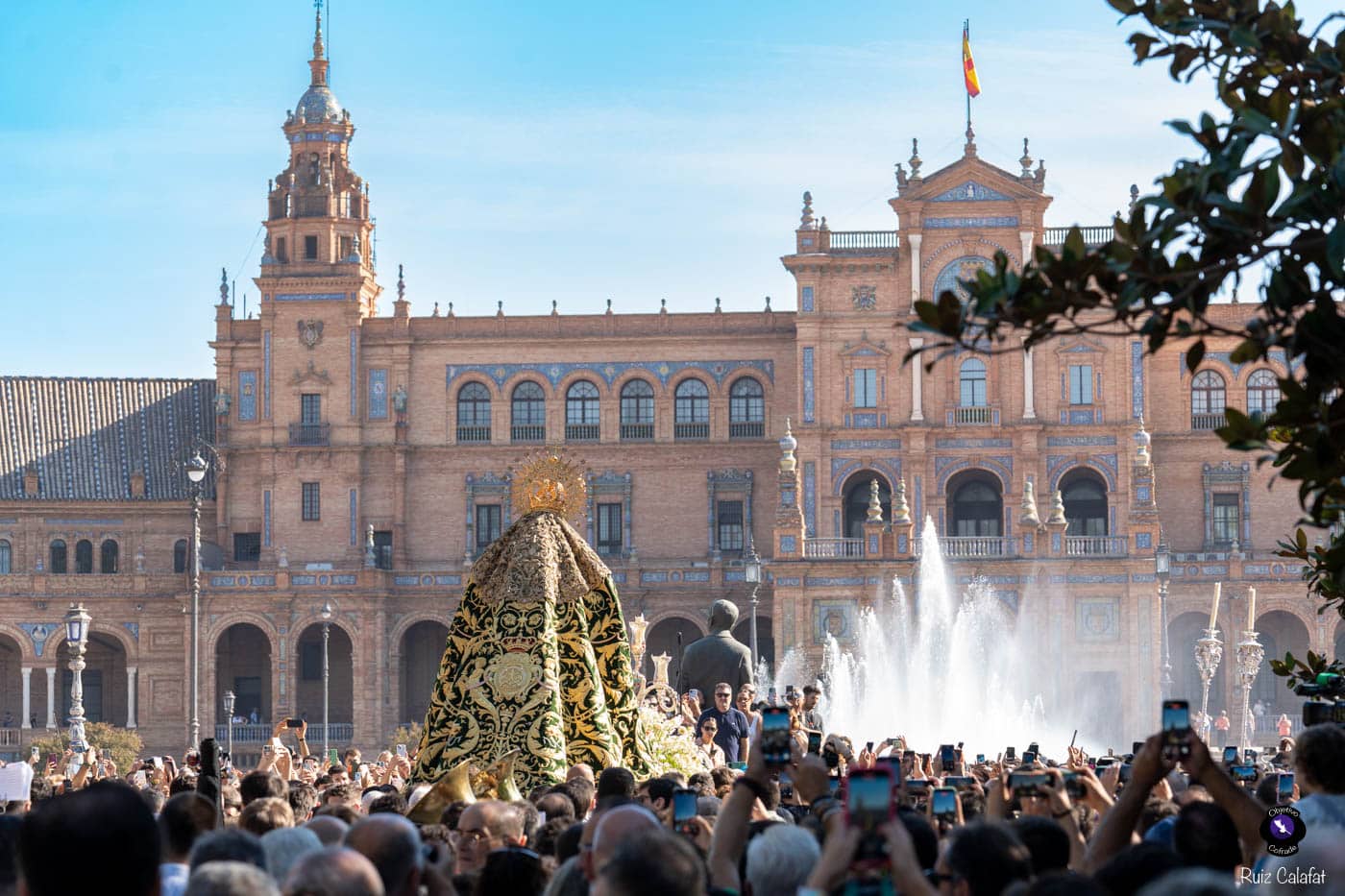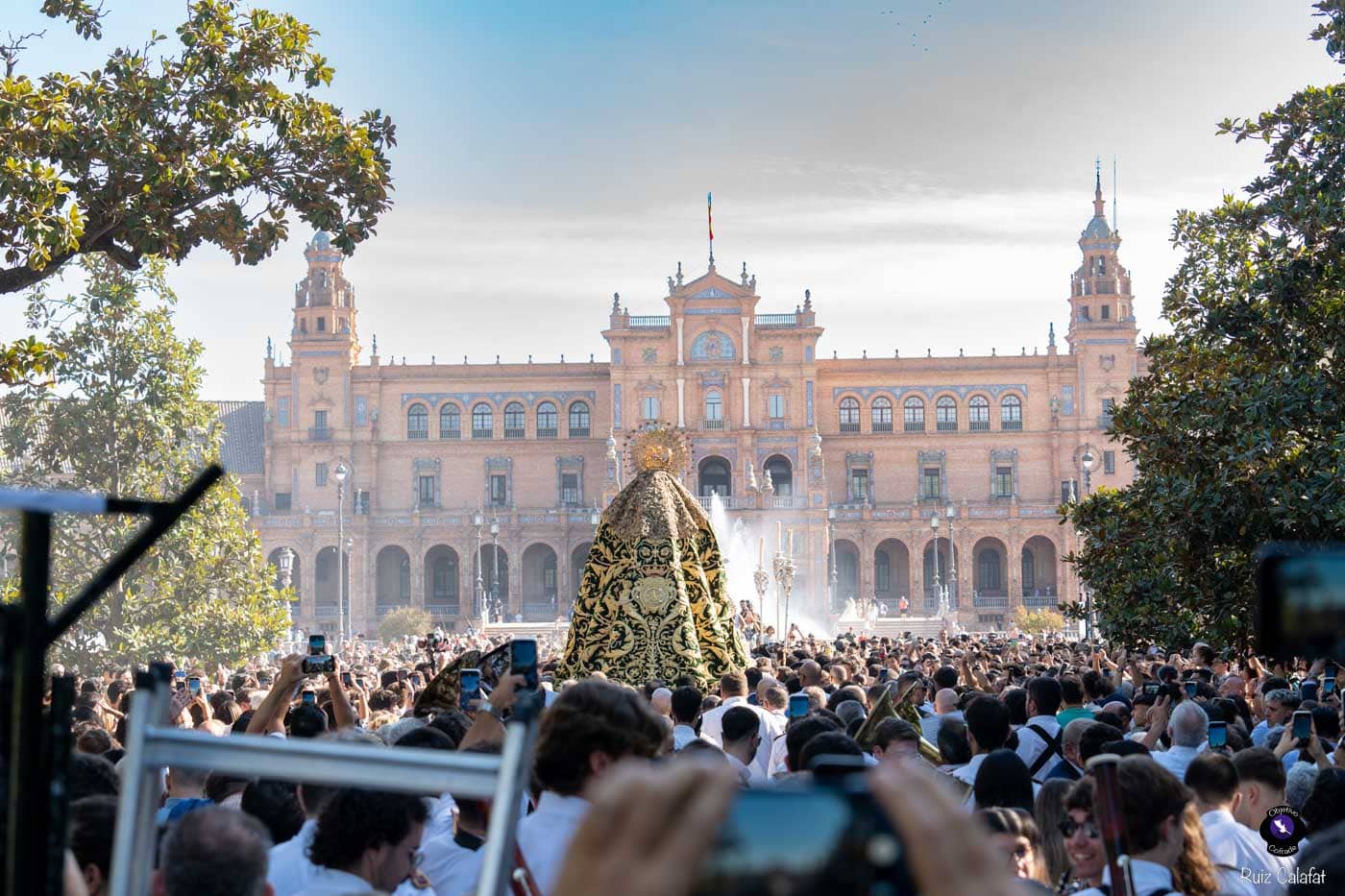 El tránsito por el Parque de María Luisa y la Plaza de España regaló imágenes de gran belleza, con la Virgen enmarcada por los árboles otoñales y el reflejo de los azulejos sevillanos. En cada punto, el silencio se imponía para dejar paso a las oraciones y al sonido de las cornetas que rompían el aire de la mañana.