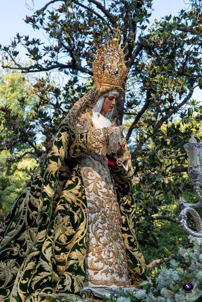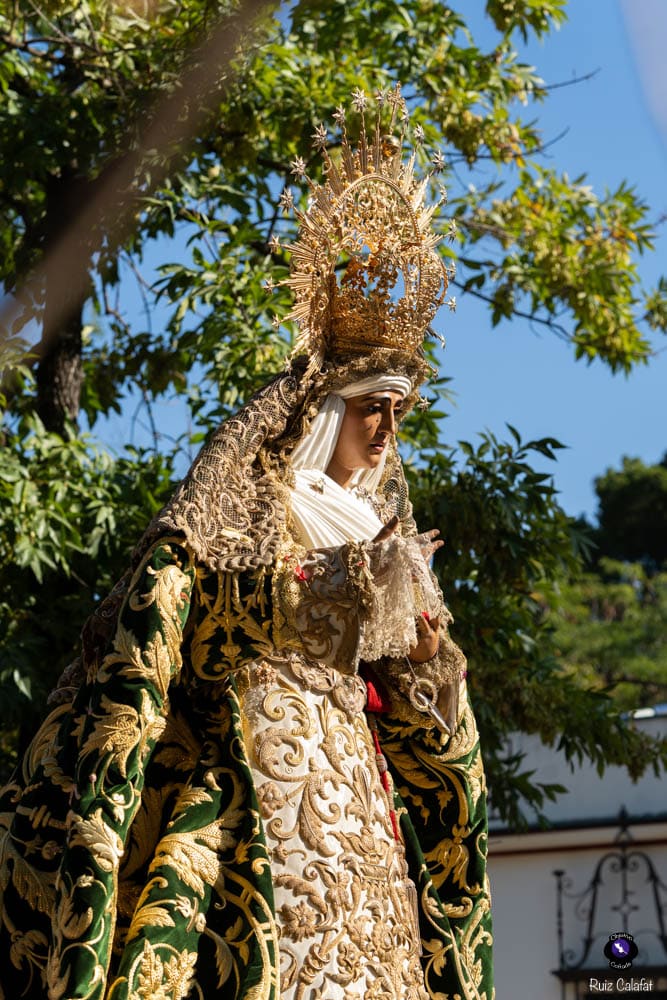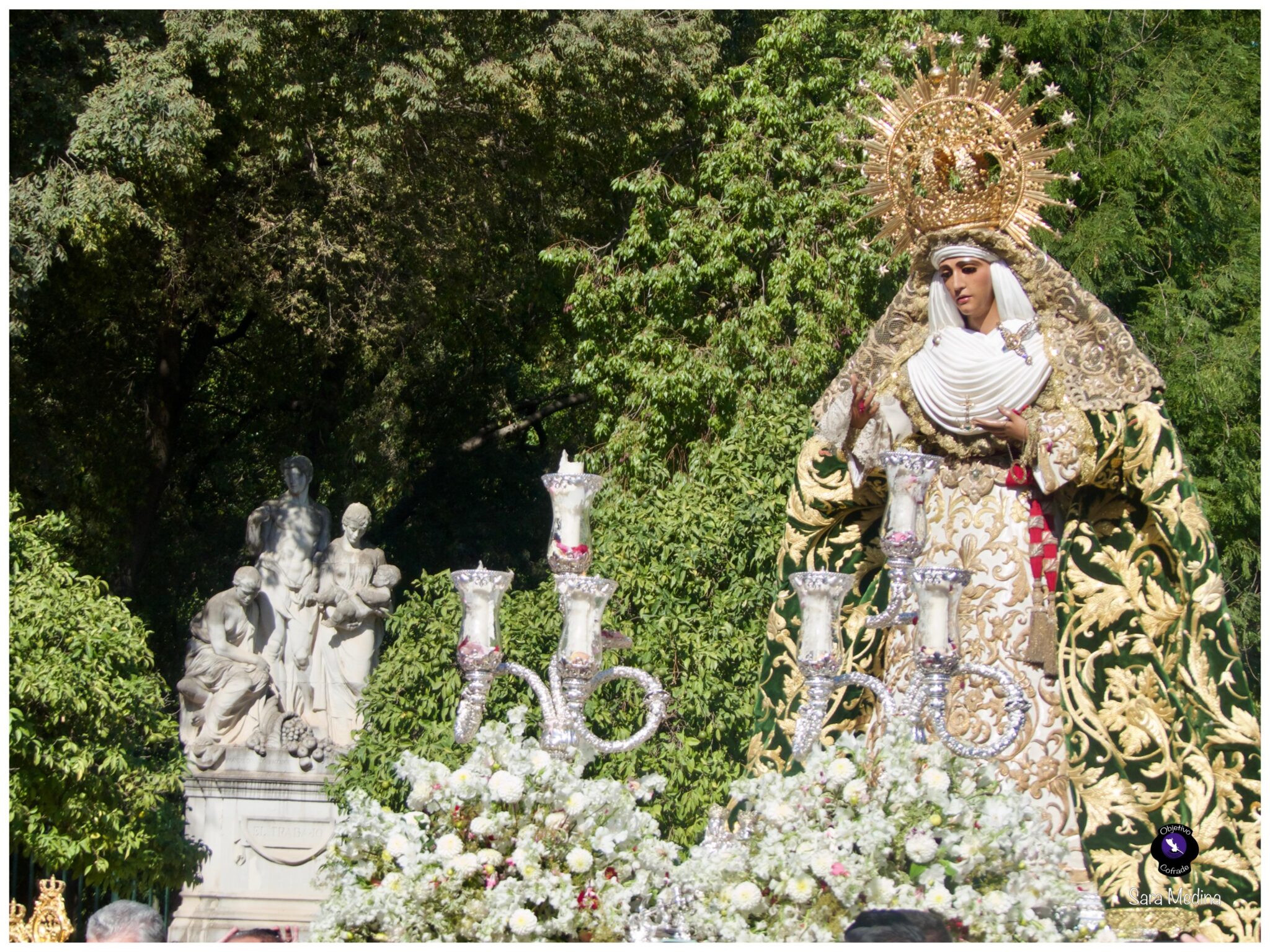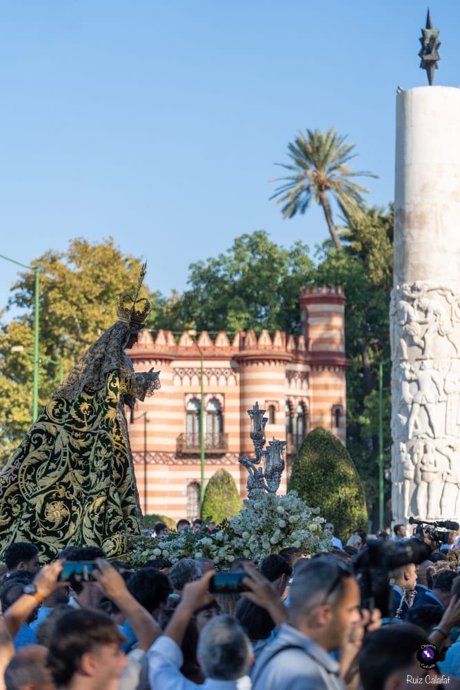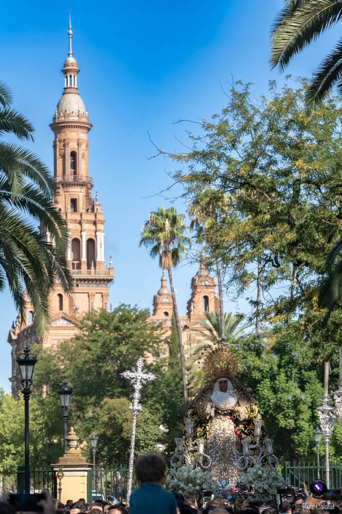 El tránsito por el Parque de María Luisa y la Plaza de España regaló imágenes de gran belleza, con la Virgen enmarcada por los árboles otoñales y el reflejo de los azulejos sevillanos. En cada punto, el silencio se imponía para dejar paso a las oraciones y al sonido de las cornetas que rompían el aire de la mañana.