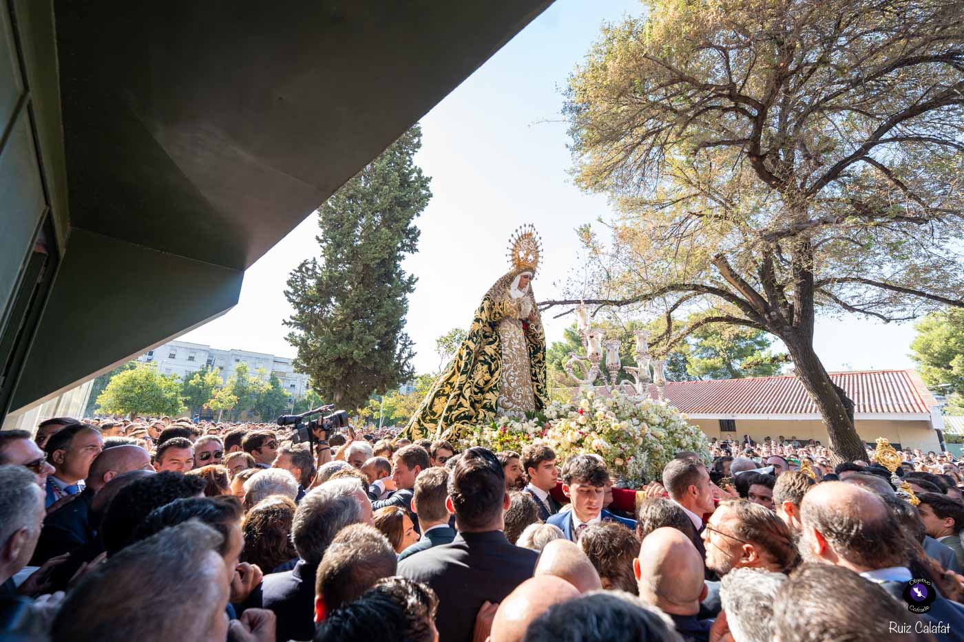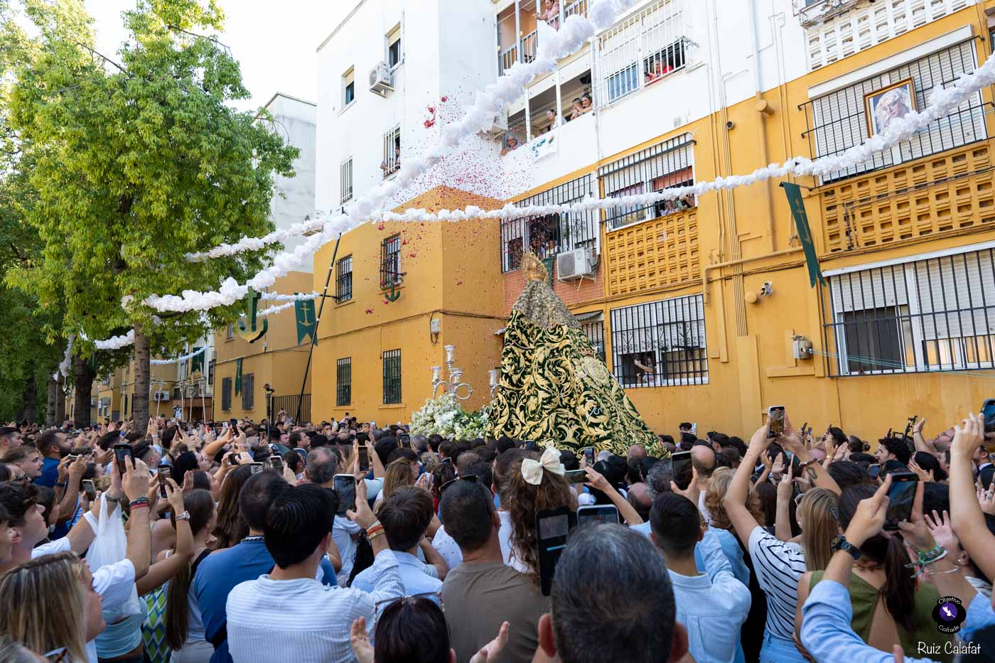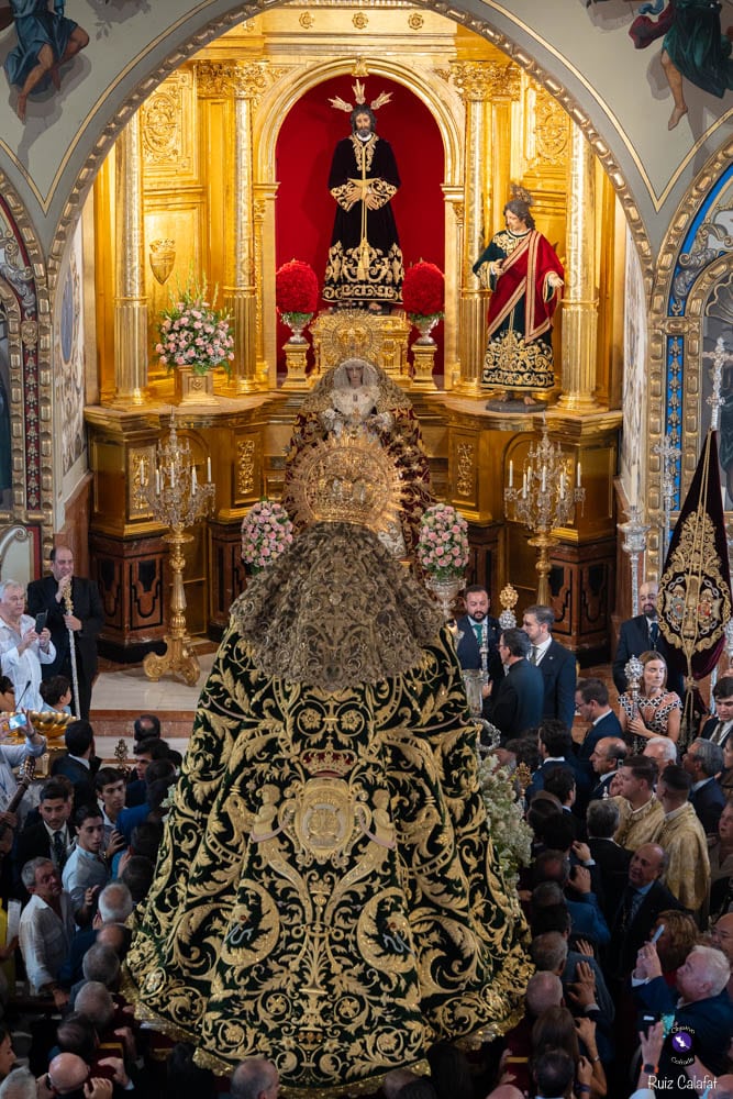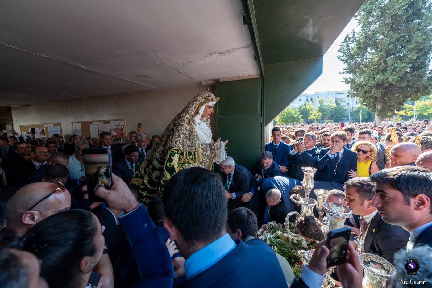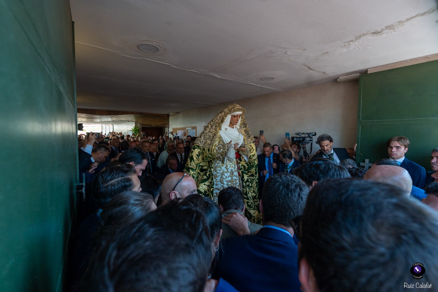 Fue necesario retirar la corona de la imagen para facilitar su entrada, gesto que se vivió con profundo respeto y recogimiento, rompiendo en aplausos cuando le fue retirada la corona. Cuando el paso cruzó el umbral, se vivió otro largo aplauso, símbolo del cariño con el que todo un barrio acogía a la Virgen. Eran las cinco y ocho de la tarde cuando las puertas se cerraron tras la imagen, poniendo fin a un recorrido inolvidable.