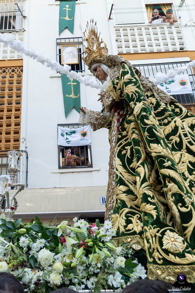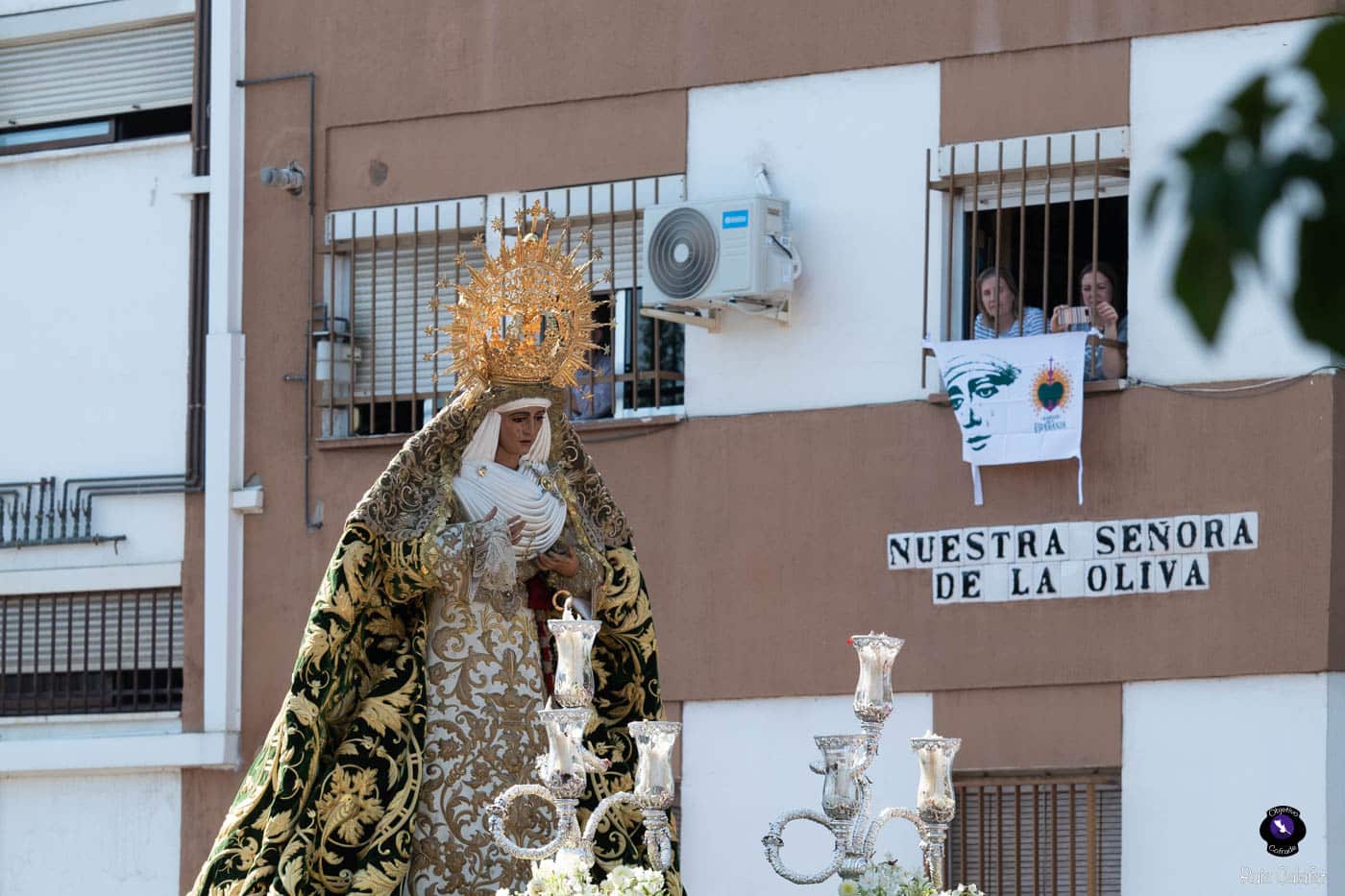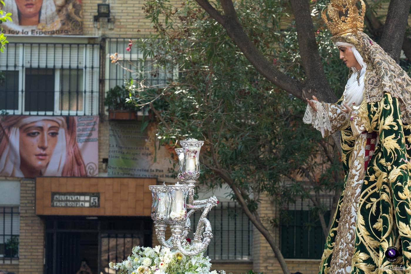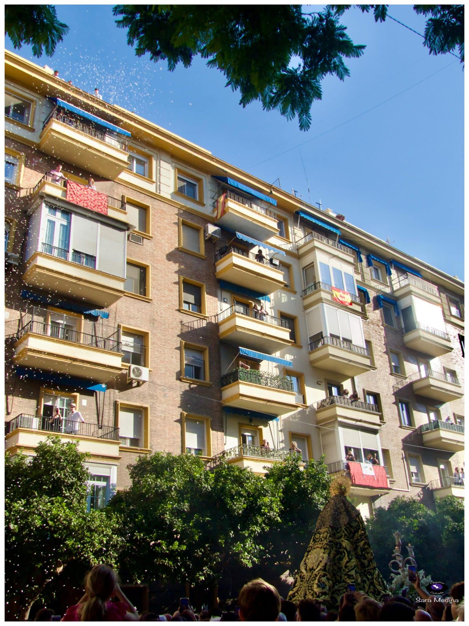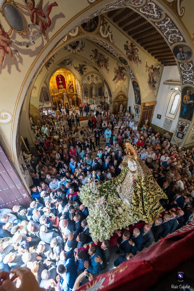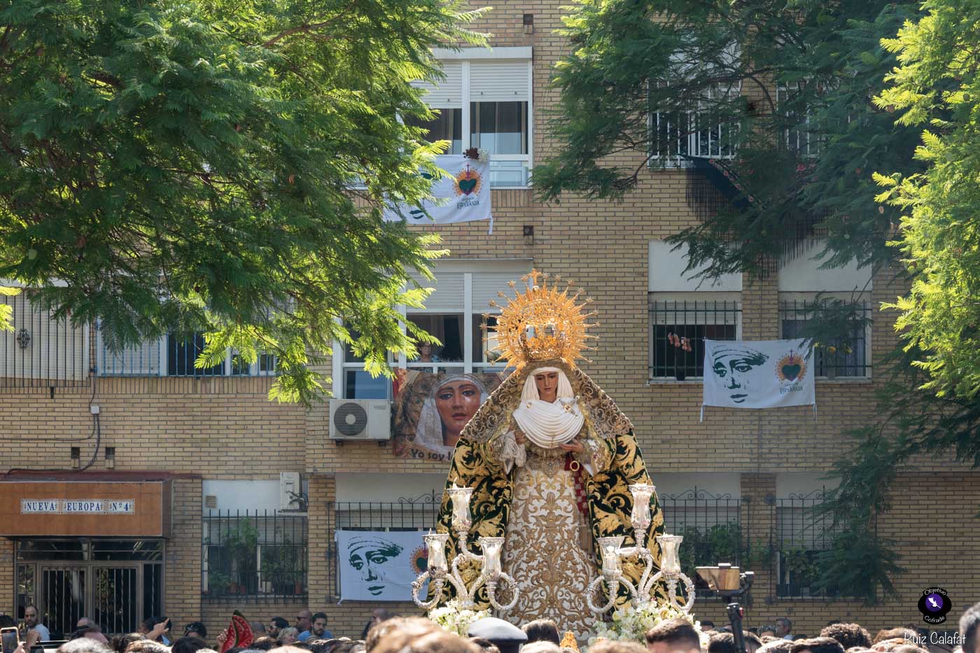 Fue necesario retirar la corona de la imagen para facilitar su entrada, gesto que se vivió con profundo respeto y recogimiento, rompiendo en aplausos cuando le fue retirada la corona. Cuando el paso cruzó el umbral, se vivió otro largo aplauso, símbolo del cariño con el que todo un barrio acogía a la Virgen. Eran las cinco y ocho de la tarde cuando las puertas se cerraron tras la imagen, poniendo fin a un recorrido inolvidable.