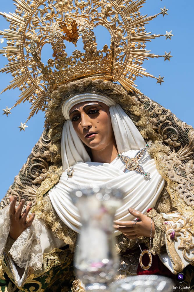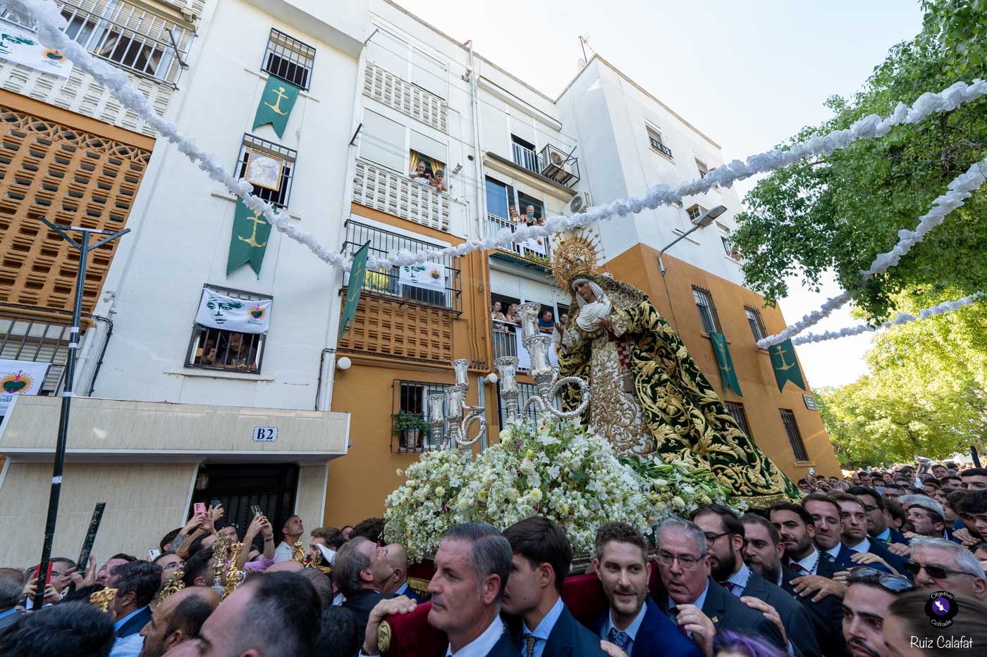 La Esperanza avanzó por las calles de su barrio, entre balcones engalanados, mientras sonaban marchas que acompañaban su caminar por Pureza, Betis y Asunción. La salida hacia el Puente de los Remedios marcó uno de los primeros momentos intensos de la jornada, con cientos de fieles saludando su paso y arrojando pétalos desde la ribera del Guadalquivir.