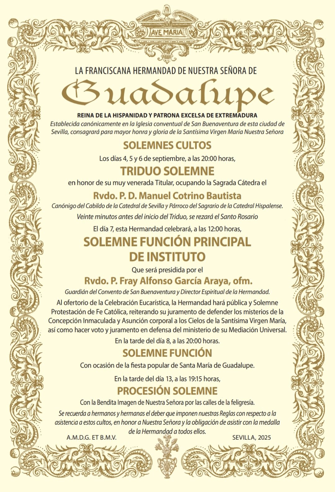 La Franciscana Hermandad de Nuestra Señora de Guadalupe, Reina de la Hispanidad y Patrona Excelsa de Extremadura, establecida canónicamente en la Iglesia Conventual de San Buenaventura de Sevilla, anuncia la celebración de sus solemnes cultos anuales en honor de su Amantísima Titular durante el mes de septiembre.