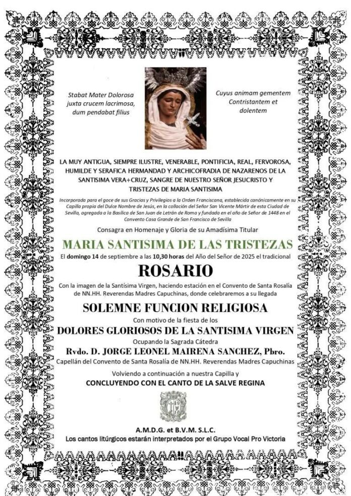 La Muy Antigua, Siempre Ilustre, Venerable, Pontificia, Real, Fervorosa, Humilde y Seráfica Hermandad y Archicofradía de Nazarenos de la Santísima Vera+Cruz, Sangre de Nuestro Señor Jesucristo y Tristezas de María Santísima, anunció los actos para la celebración de la festividad de los Dolores Gloriosos de la Santísima Virgen. El culto central tendrá lugar el próximo domingo 14 de septiembre con un tradicional Rosario y una Solemne Función Religiosa en el Convento de Santa Rosalía.