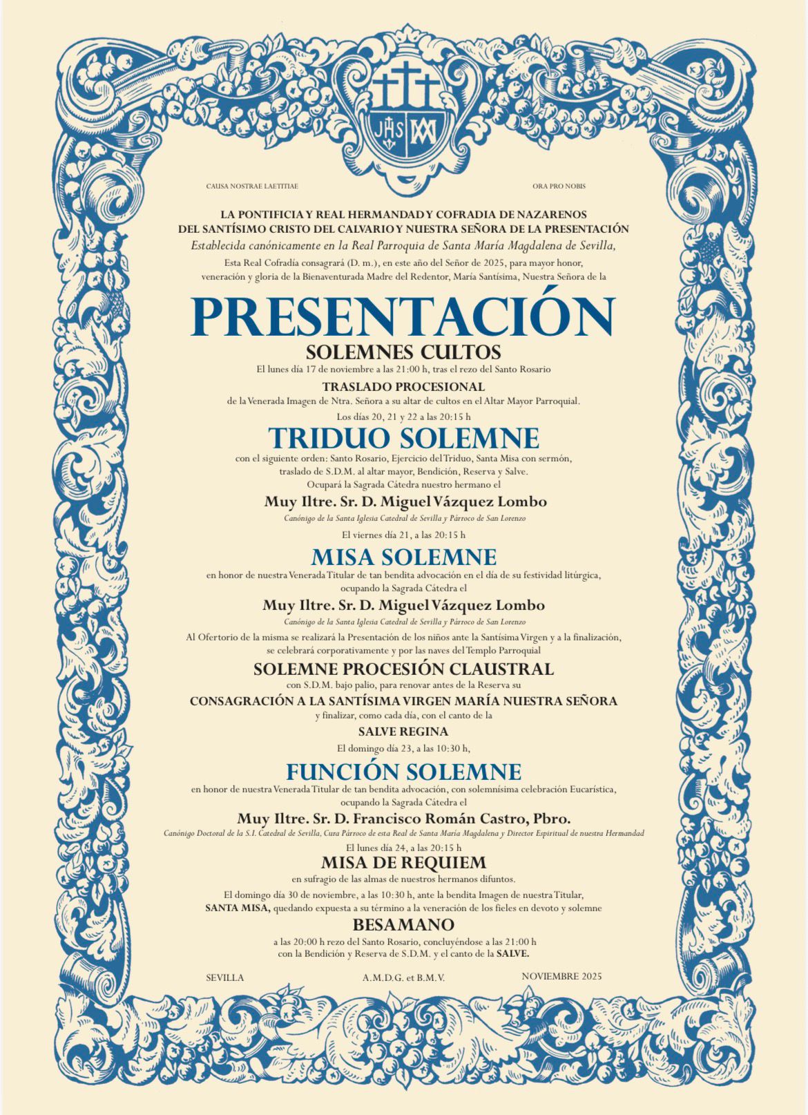 El domingo 23, a las 10:30 h, se celebrará la Función Solemne presidida por el Muy Iltre. Francisco Román Castro, párroco de la Magdalena y director espiritual de la hermandad.
