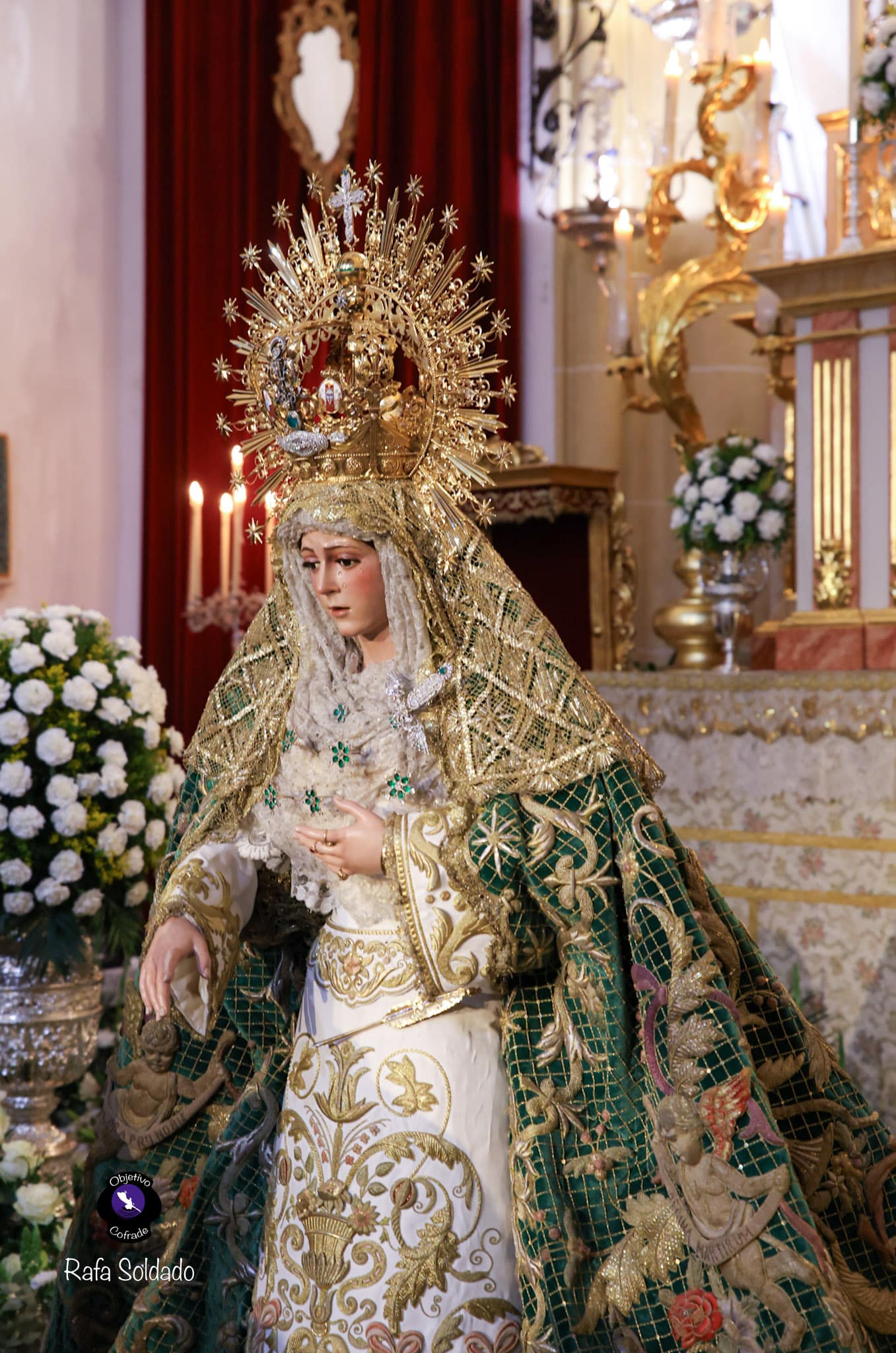 La Virgen se presenta con el histórico manto camaronero, obra de Rodríguez Ojeda y que este año conmemora su 125 aniversario, acompañado por la saya del arco y la réplica de la conocida toca de los rombos. Un conjunto que refuerza la lectura histórica y devocional de este besamanos conmemorativo.