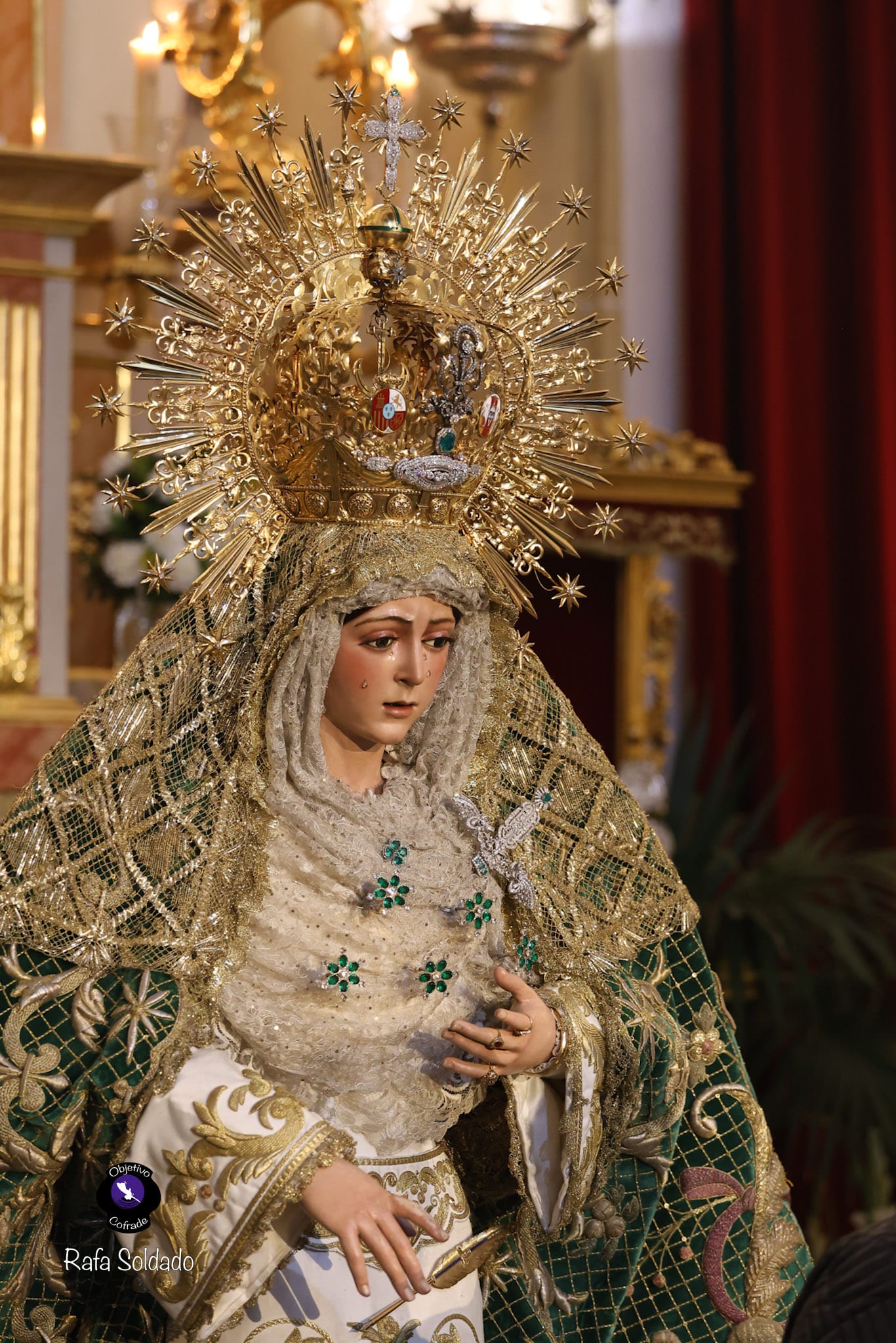 El conjunto, enmarcado por un rico cortinaje y con más de cuarenta puntos de luz, envuelve la imagen de la Santísima Virgen de la Esperanza en una atmósfera solemne y profundamente simbólica. El discurso litúrgico del altar se sitúa en torno a la Expectación de la Virgen, presentando a Cristo muerto en la Cruz bajo un dosel que remite a María como sagrario vivo de Jesús, ofrecido para la salvación del mundo.