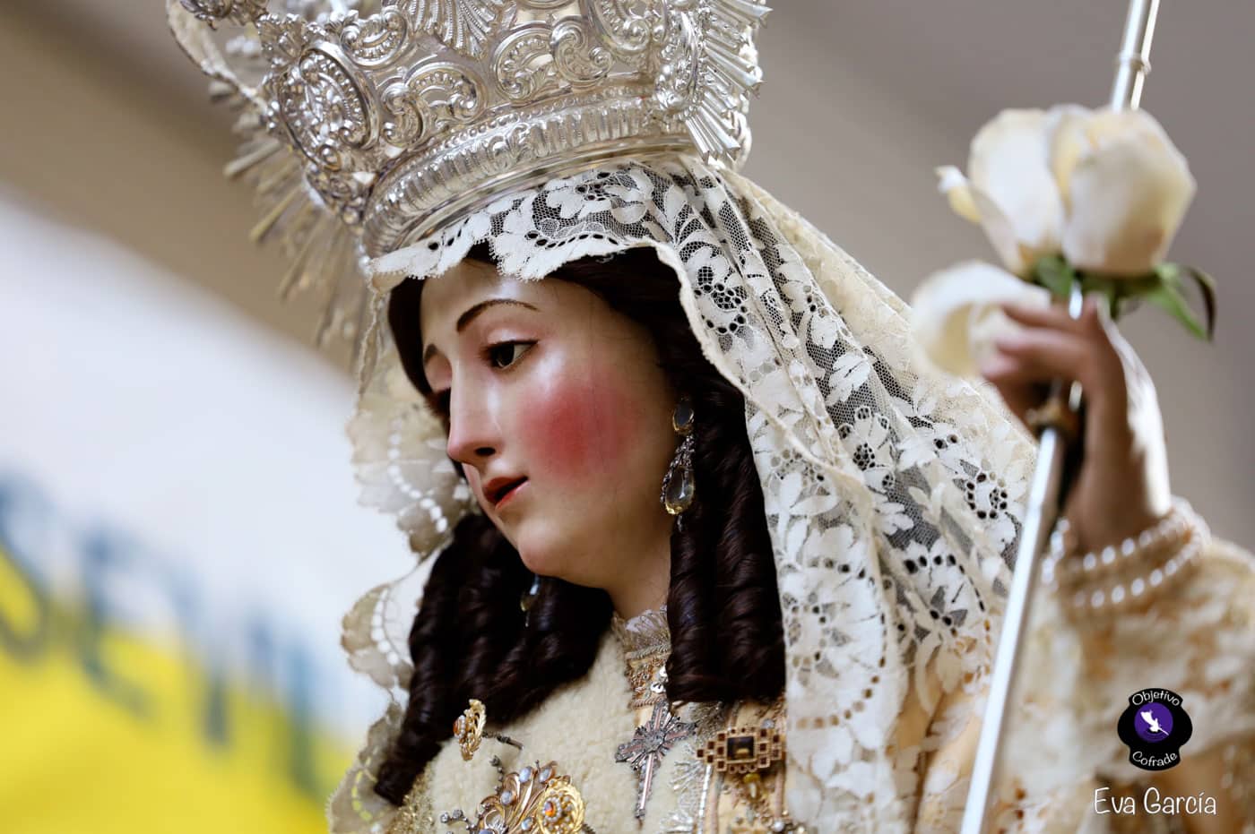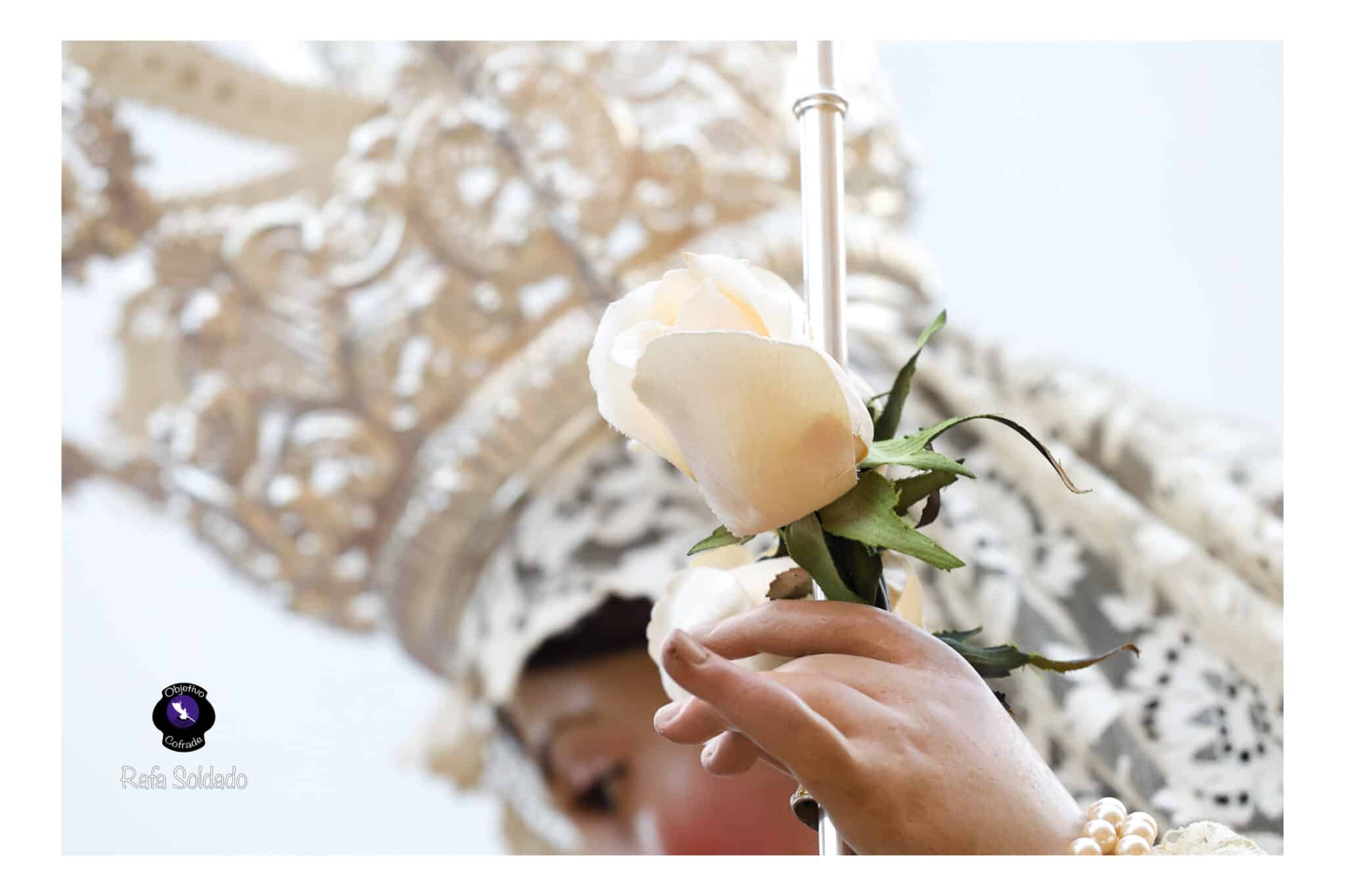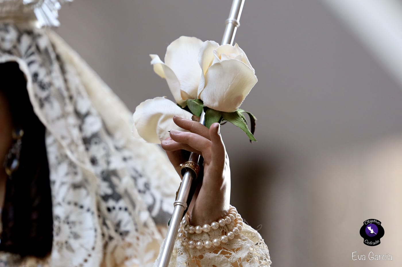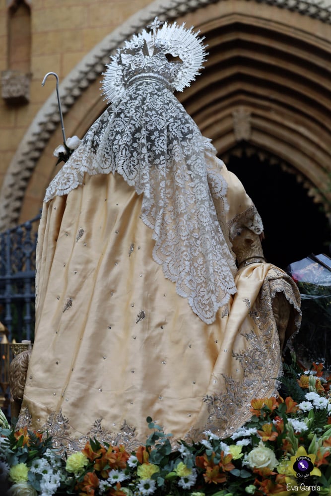 La Virgen, sobre andas, se encontraba ataviada con su saya de salida bordada en oro y manto blanco, lucía su corona y el rostrillo característico, y estaba acompañada de numerosos cirios que iluminaban el paso, mientras las flores blancas y rosadas completaban un conjunto