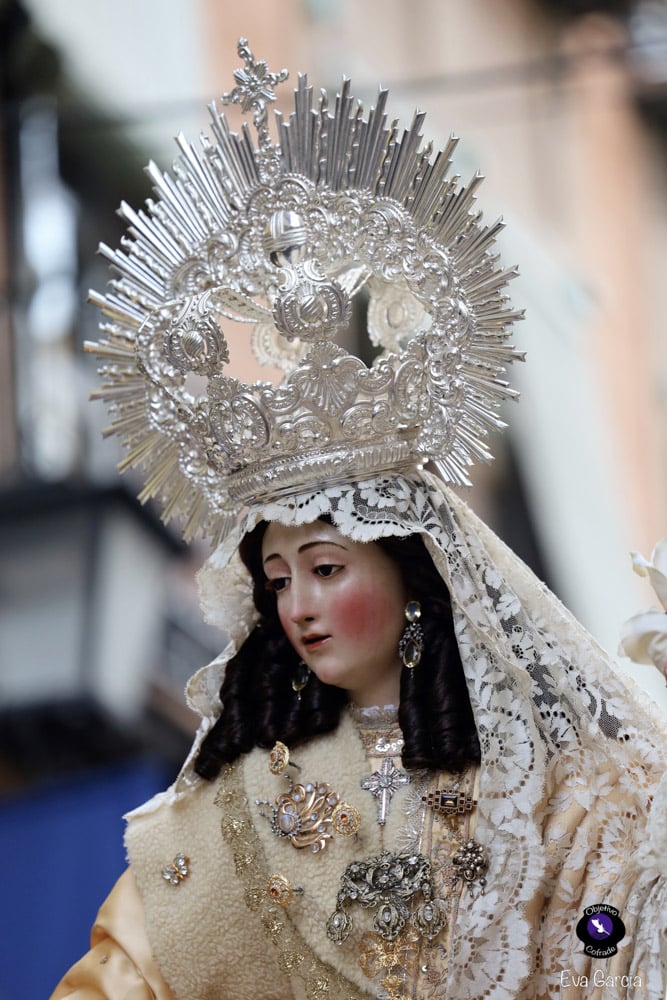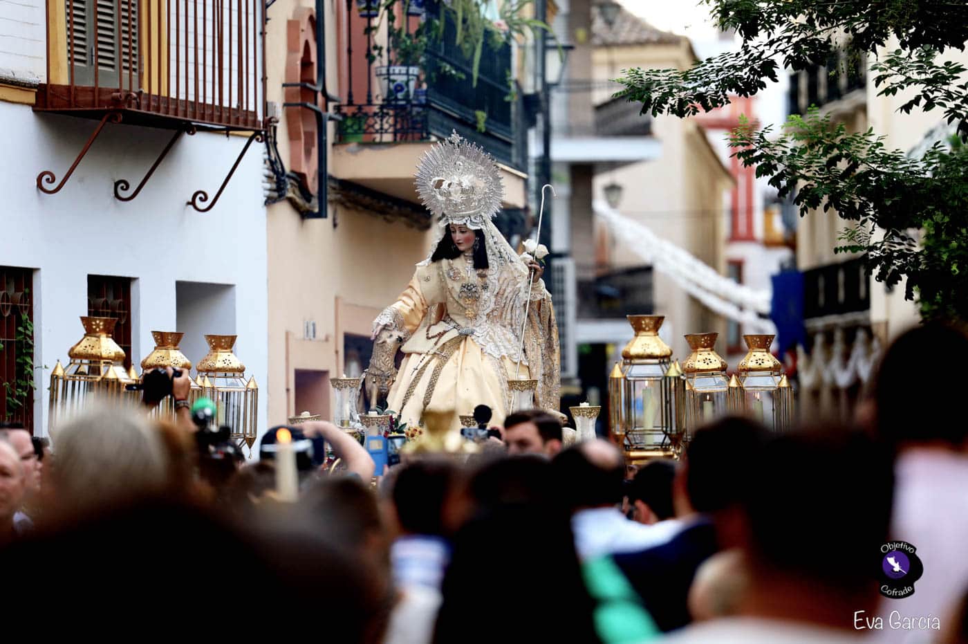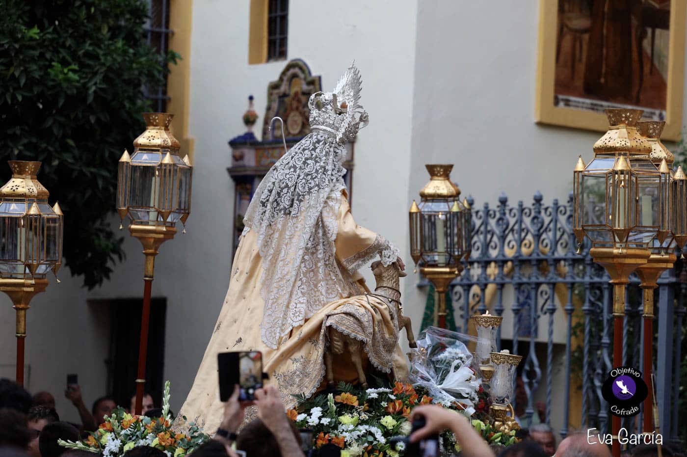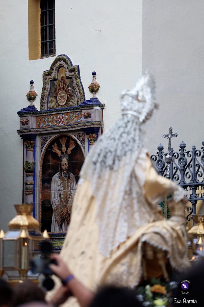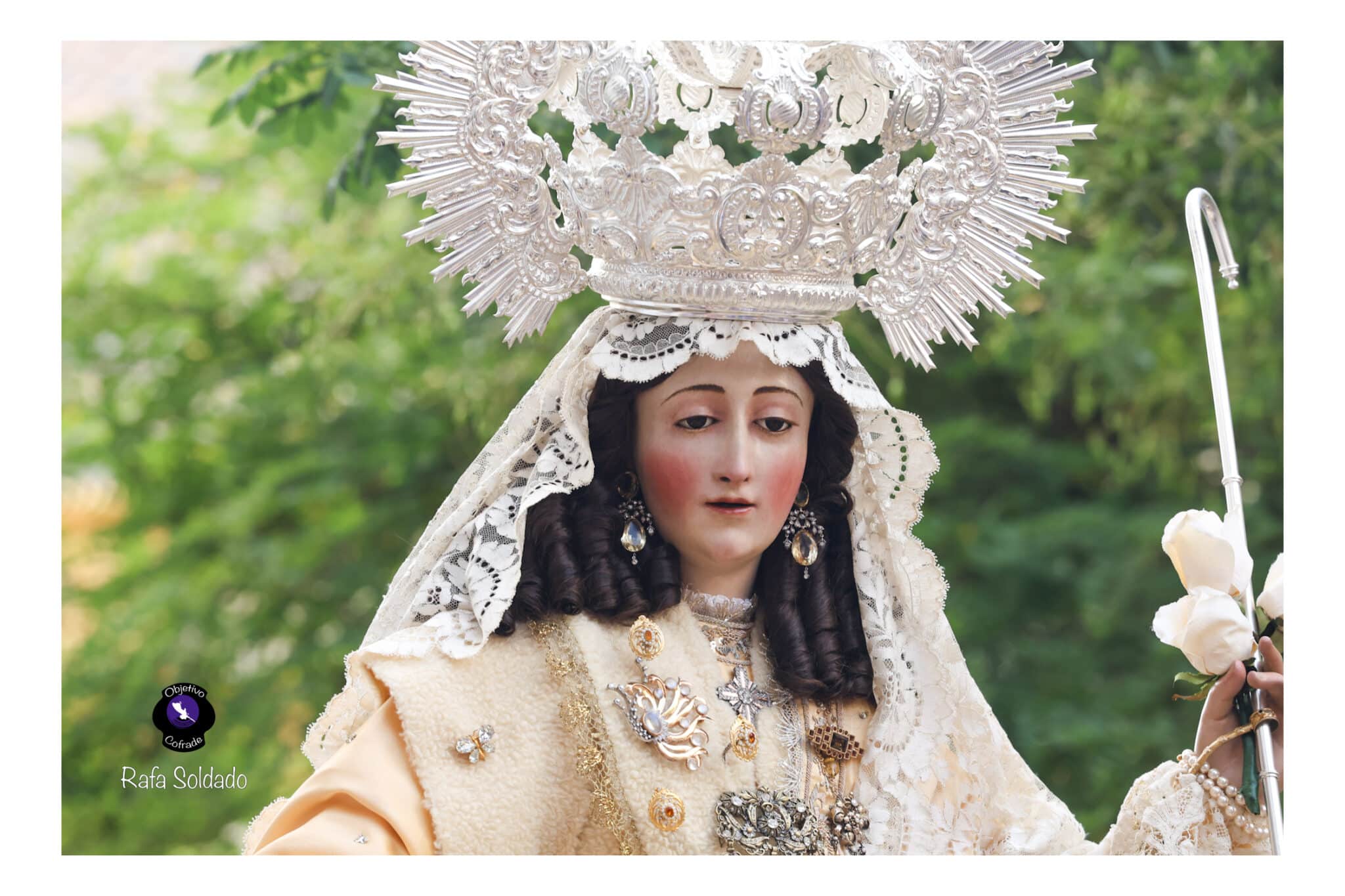 La Virgen, sobre andas, se encontraba ataviada con su saya de salida bordada en oro y manto blanco, lucía su corona y el rostrillo característico, y estaba acompañada de numerosos cirios que iluminaban el paso, mientras las flores blancas y rosadas completaban un conjunto
