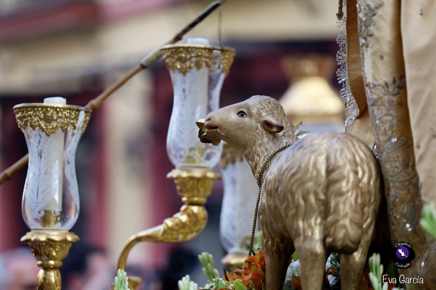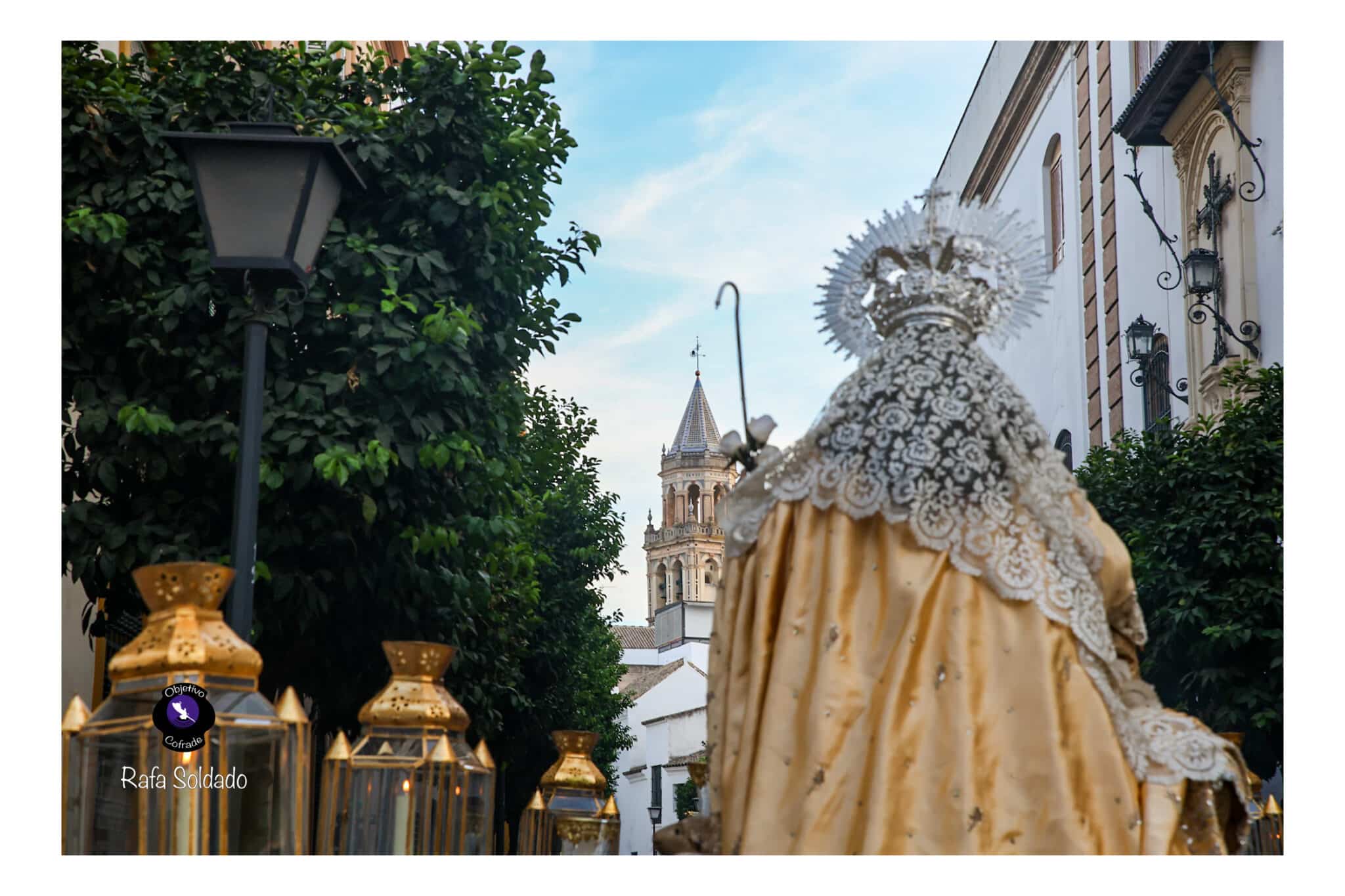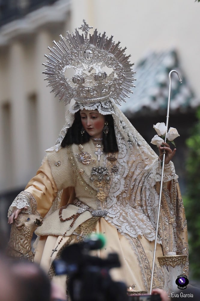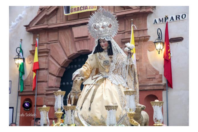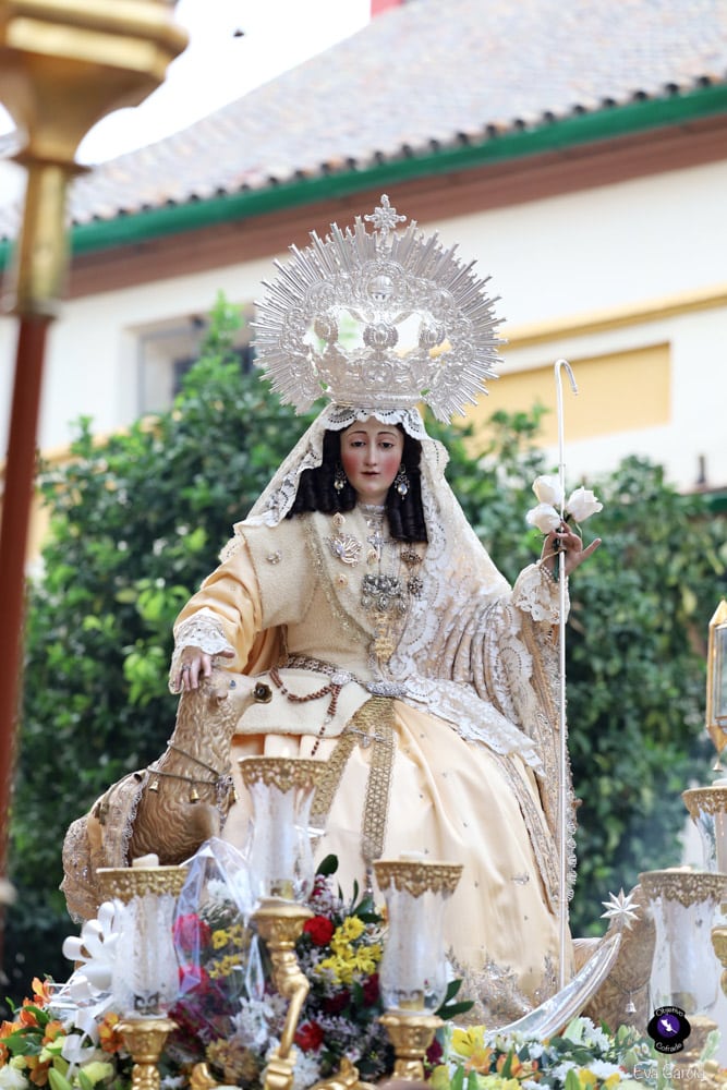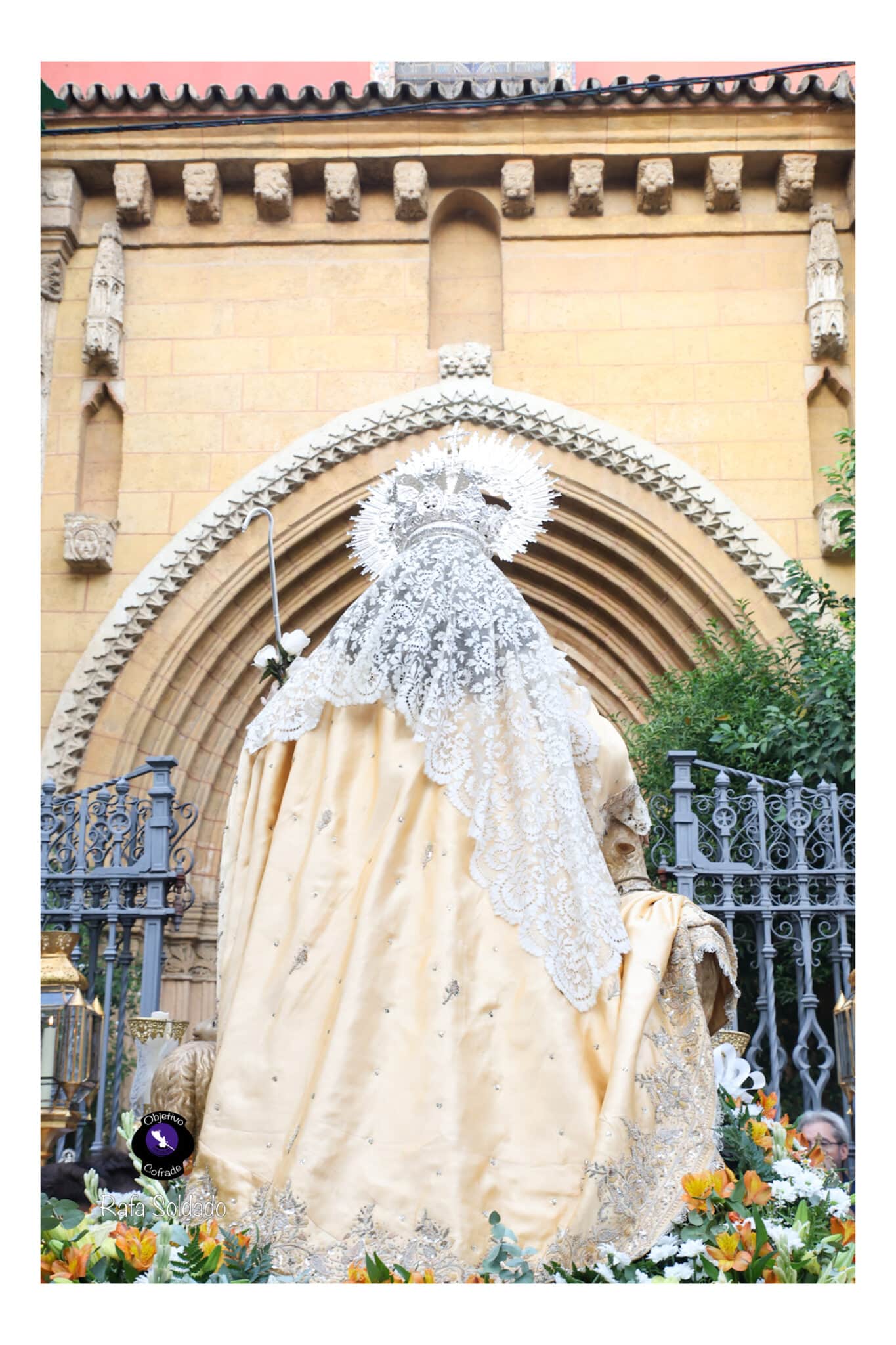 La Virgen, sobre andas, se encontraba ataviada con su saya de salida bordada en oro y manto blanco, lucía su corona y el rostrillo característico, y estaba acompañada de numerosos cirios que iluminaban el paso, mientras las flores blancas y rosadas completaban un conjunto