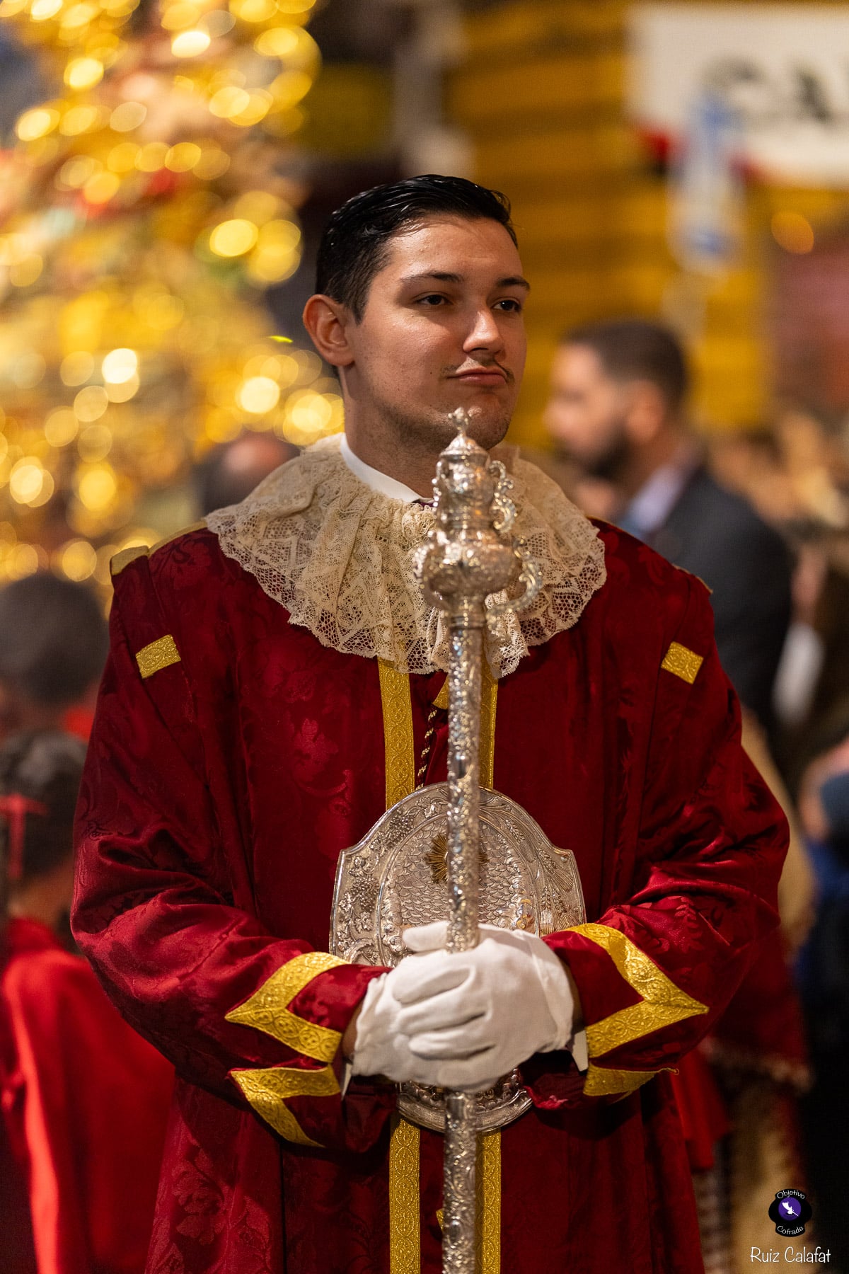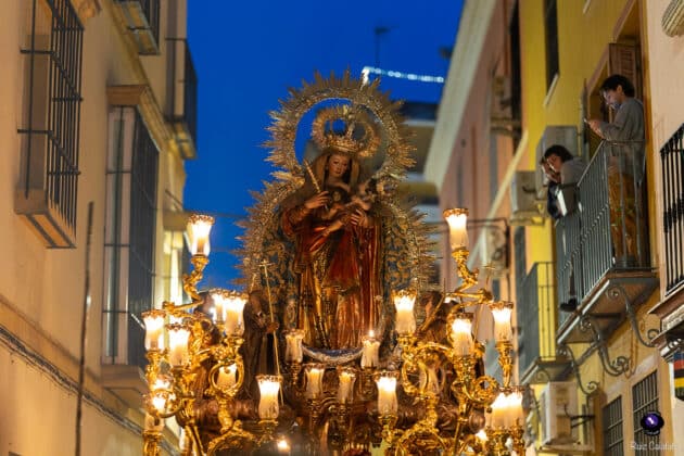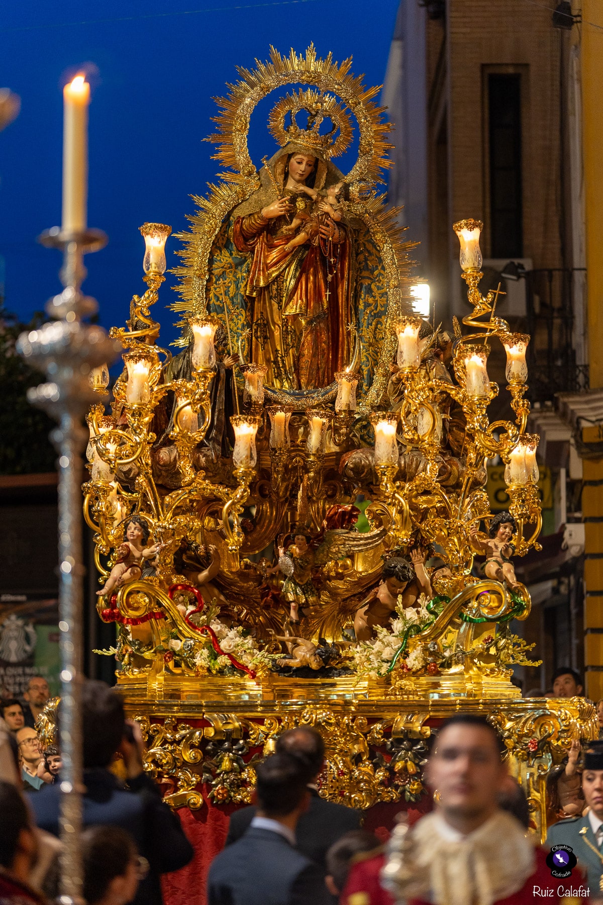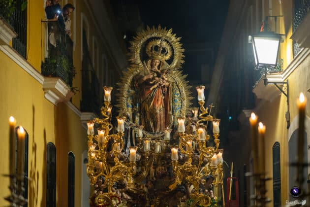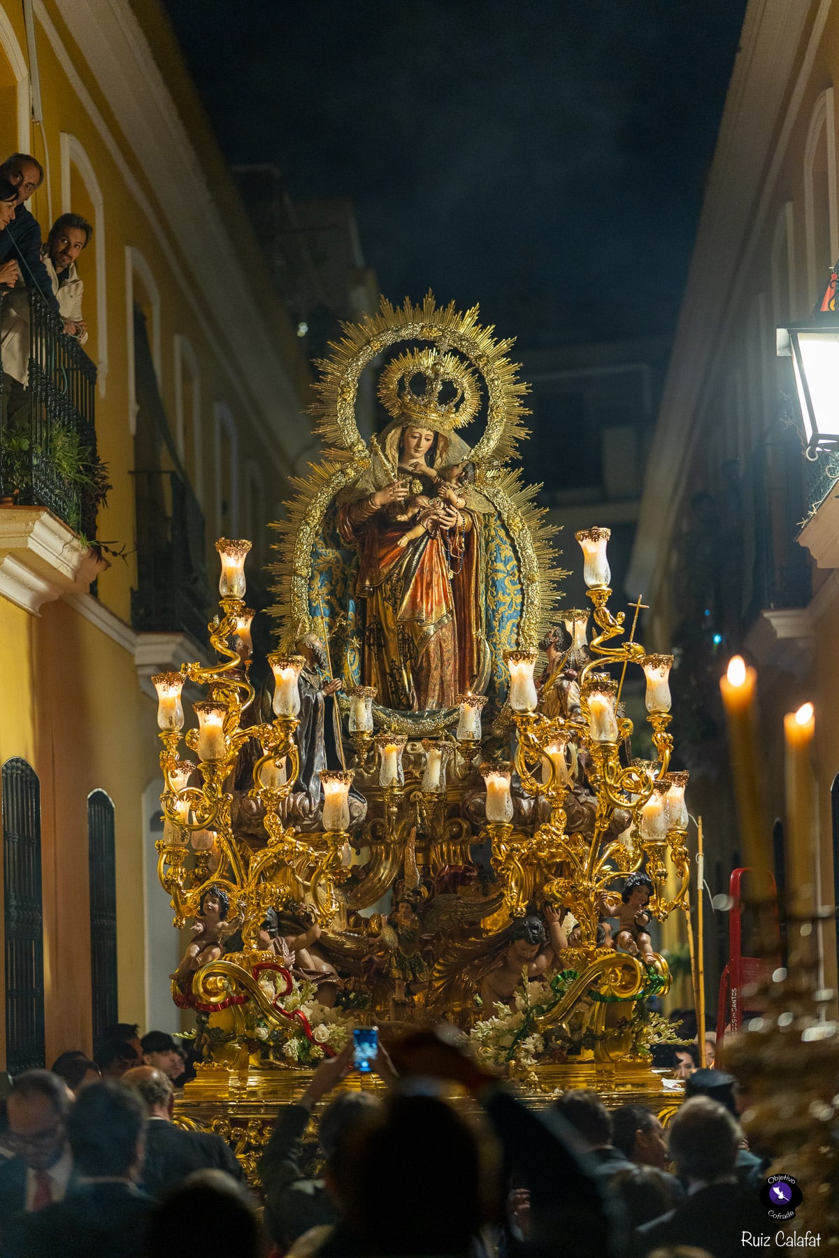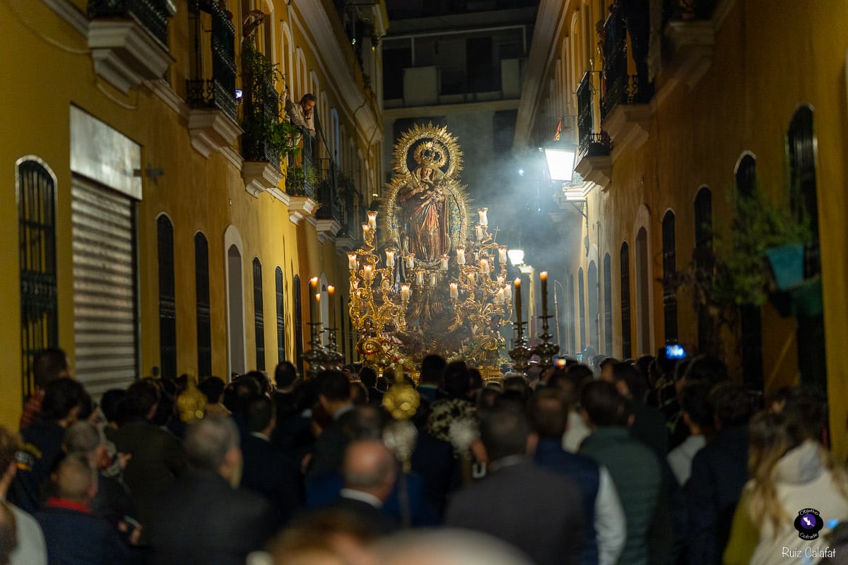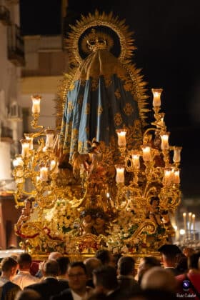 La Virgen lució el manto celeste bordado en oro y sedas en 1950 por las Hijas de la Caridad de Cádiz, una de las piezas más valiosas de su ajuar. Además, el paso estrenó el dorado completo de los respiraderos, realizado en el taller de Enrique Castellanos, completando la restauración de los candelabros culminada el pasado año.