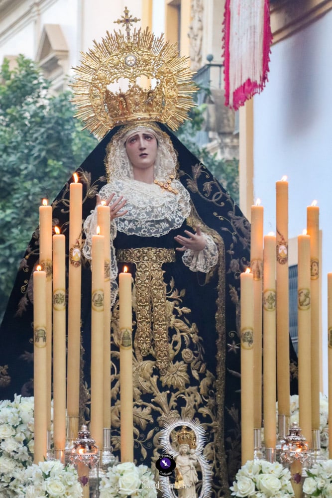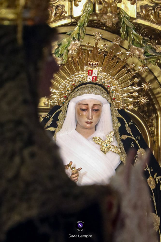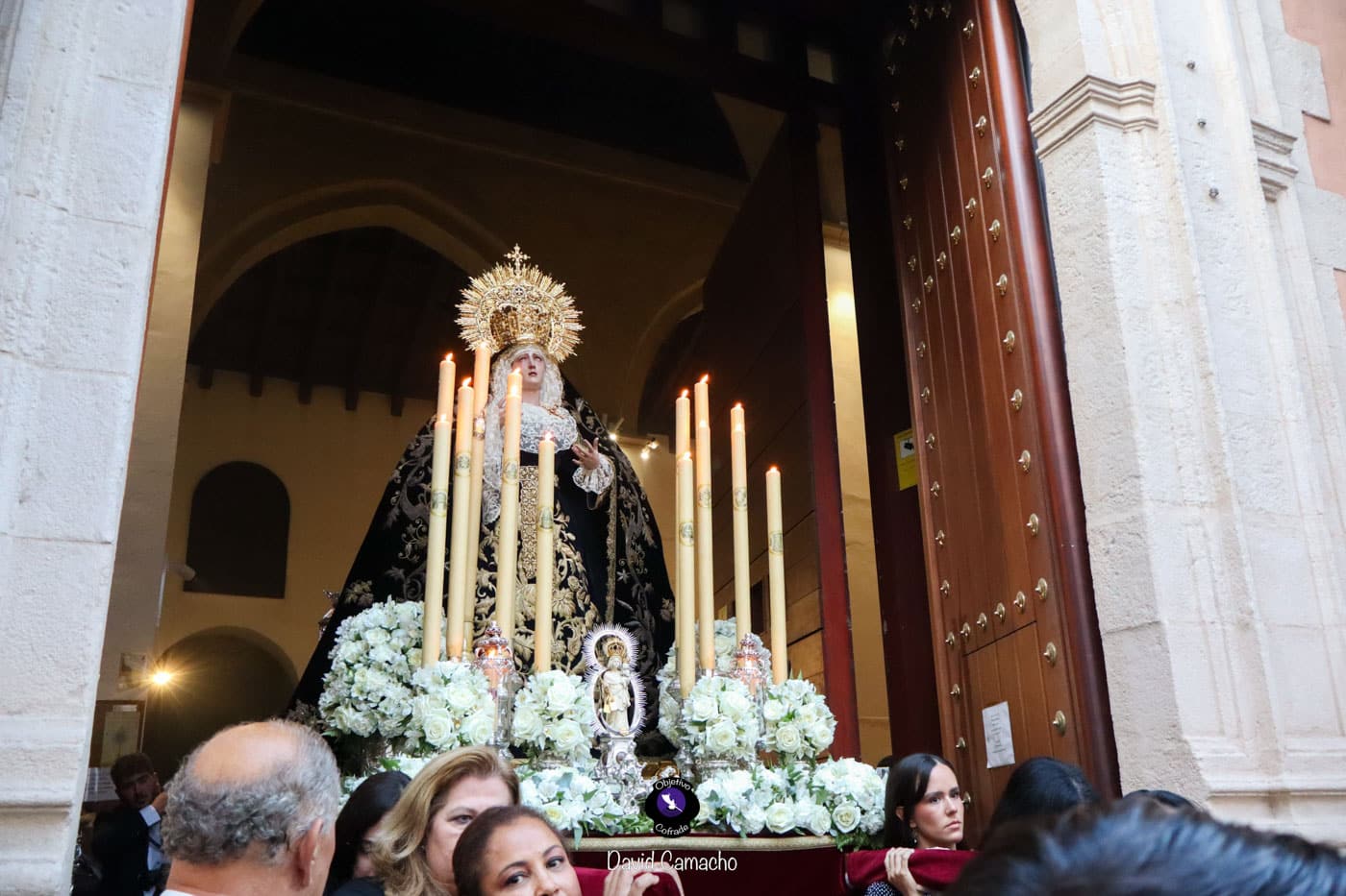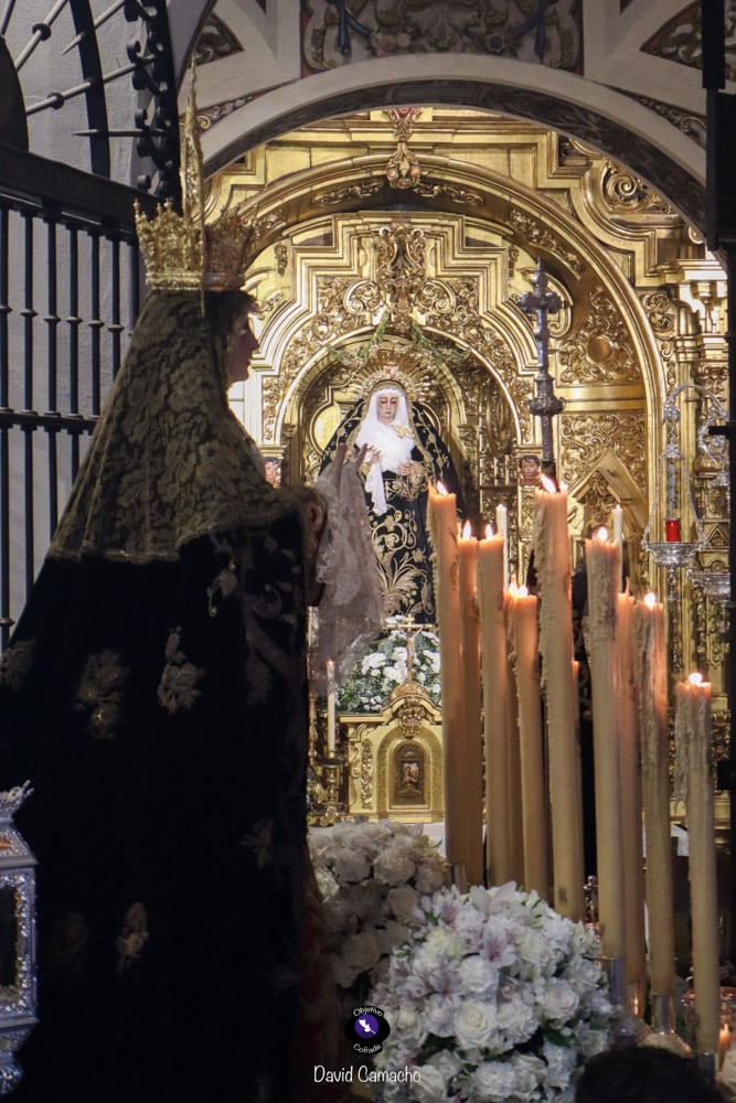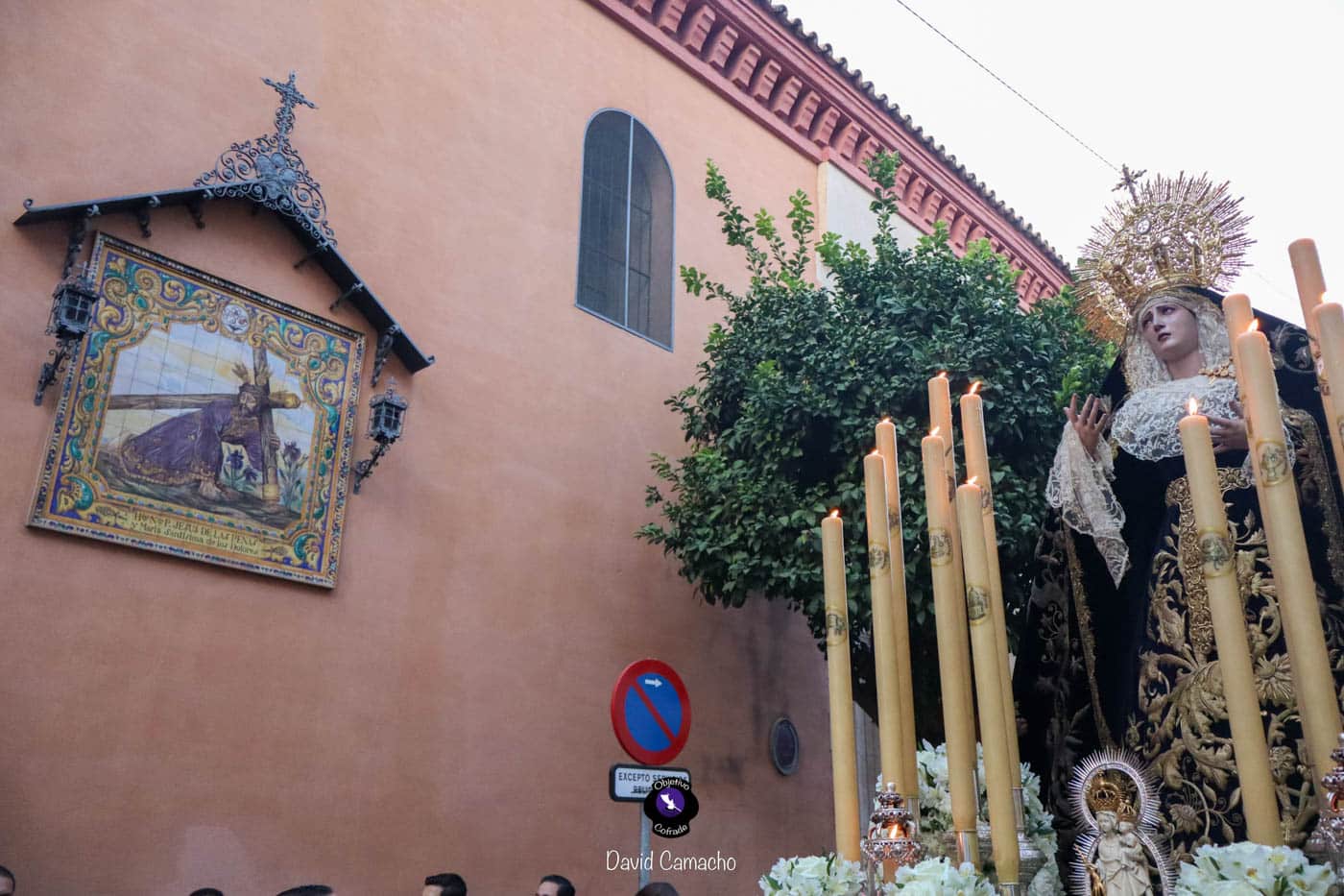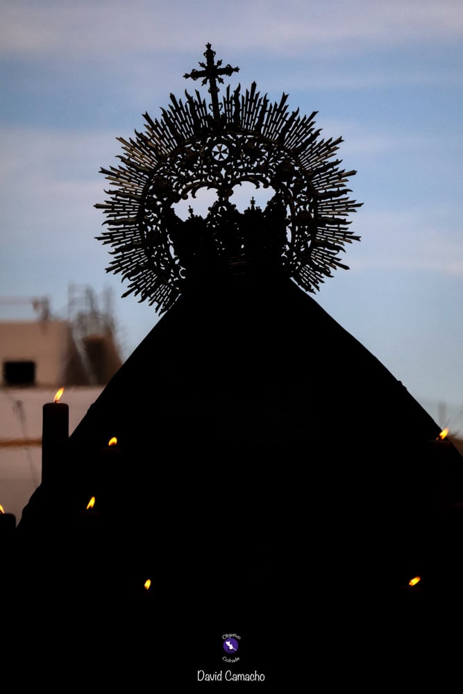 Pasadas las 21:30 horas, la Virgen llegó al convento de Santa Ana, donde fue recibida entre aplausos y oraciones por las hermanas carmelitas y los jóvenes de la hermandad. Una vez dentro del templo, se rezó la Corona Dolorosa, dando inicio a una noche de intensa devoción en un ambiente íntimo y sobrecogedor.