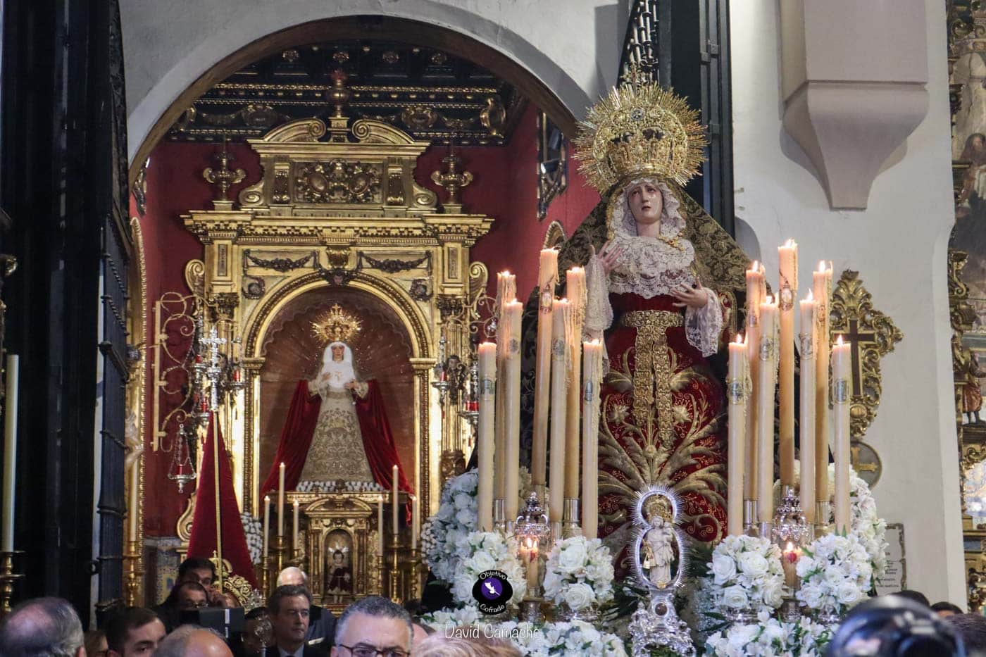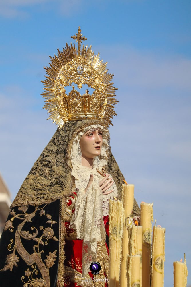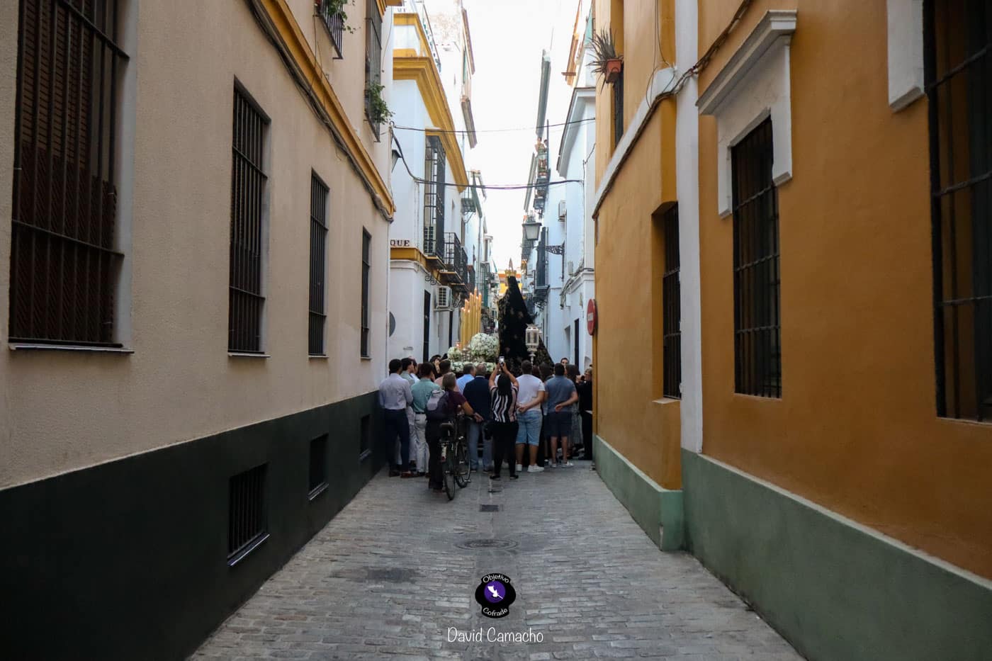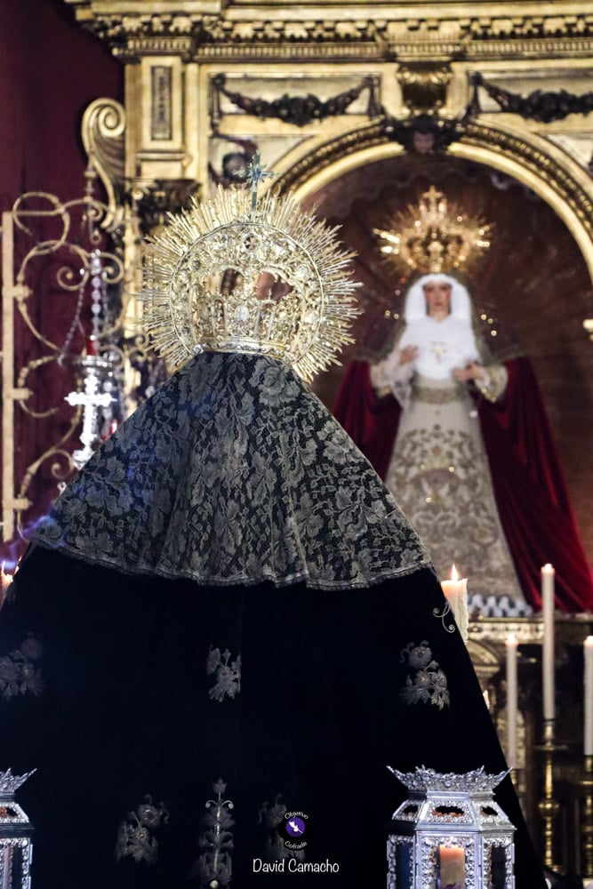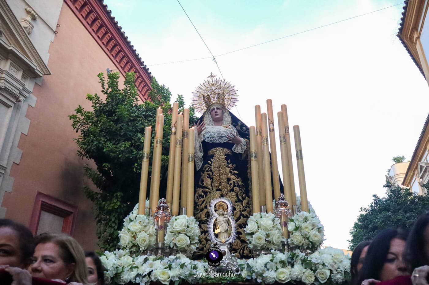 Pasadas las 21:30 horas, la Virgen llegó al convento de Santa Ana, donde fue recibida entre aplausos y oraciones por las hermanas carmelitas y los jóvenes de la hermandad. Una vez dentro del templo, se rezó la Corona Dolorosa, dando inicio a una noche de intensa devoción en un ambiente íntimo y sobrecogedor.