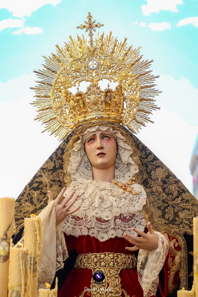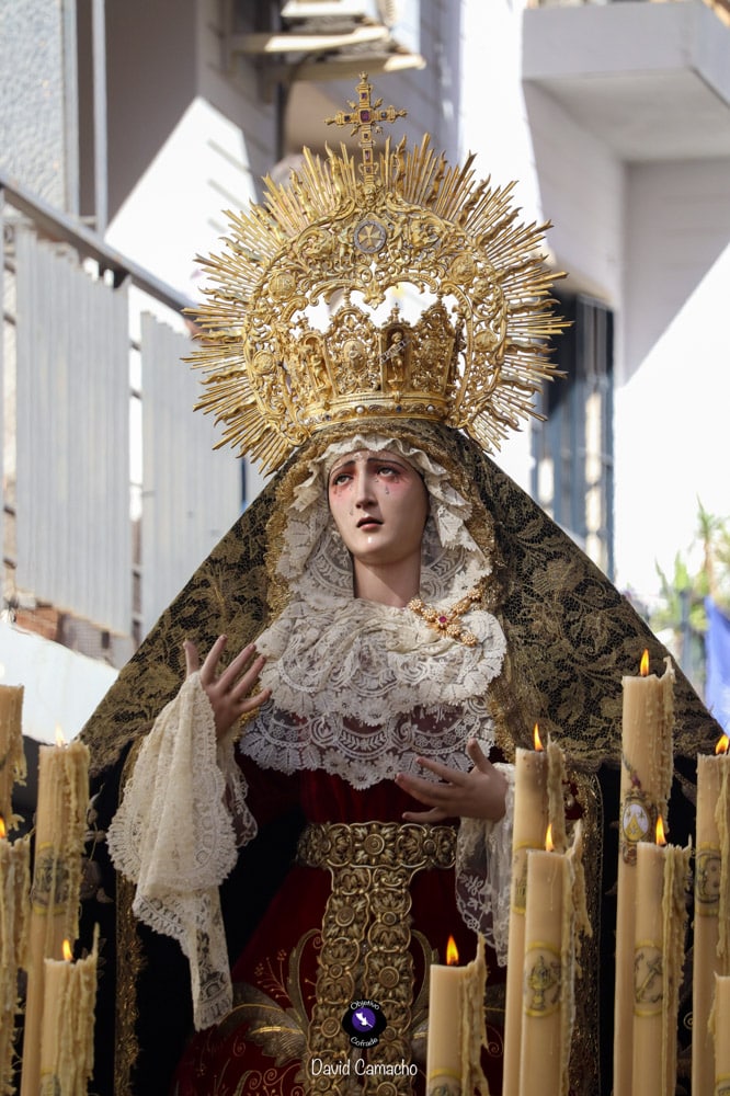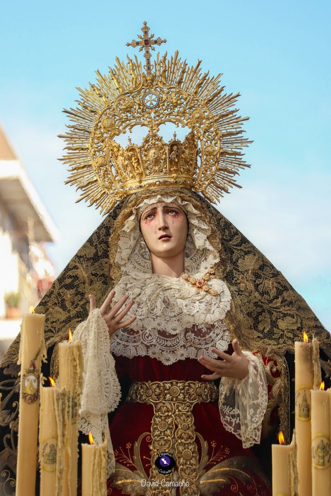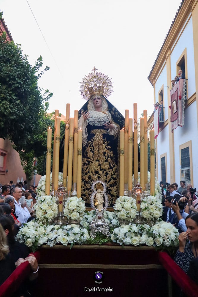 La imagen fue portada en andas cedidas por la Hermandad de los Panaderos, adornadas con una candelería diseñada y pintada por Manuel Jesús Blanco Mesa, donde figuraban motivos de las Letanías Lauretanas y los escudos carmelitanos. Para la ocasión, la Dolorosa lució el manto de Nuestra Señora del Mayor Dolor, cedido por la Hermandad de Las Aguas, y una cuidada disposición floral que realzaba la serenidad de su rostro.