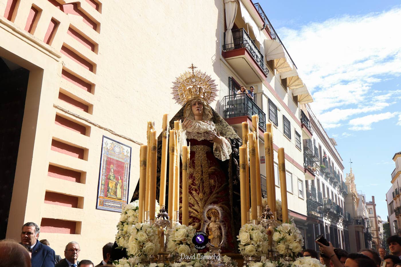 En su camino, la Virgen realizó visitas muy simbólicas: en la Parroquia de San Lorenzo, fue recibida por las hermandades del Carmen, la Soledad y el Dulce Nombre, momentos cargados de emoción y fraternidad. También pasó ante la capilla del Dulce Nombre de Jesús, donde la Hermandad de la Vera Cruz la recibió con oraciones y gestos de cariño, recordando la estrecha relación que ambas corporaciones mantienen como vecinas del Lunes Santo.