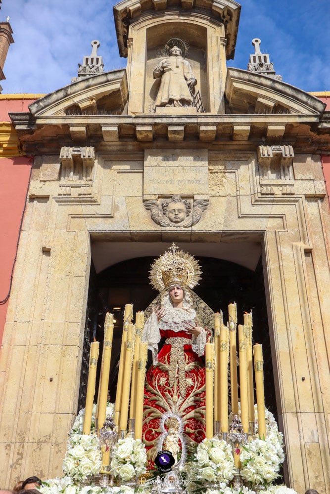 El tramo final por Miguel del Cid y la plaza Teresa Enríquez fue un auténtico clamor. Las colgaduras con letanías marianas decoraban los balcones y la casa hermandad mostraba una gran lona conmemorativa del aniversario. A las 14:15 horas, el paso de la Virgen se detenía en el presbiterio del altar mayor de San Vicente Mártir, poniendo fin a dos jornadas que quedarán escritas con letras de oro en la historia de la cofradía.