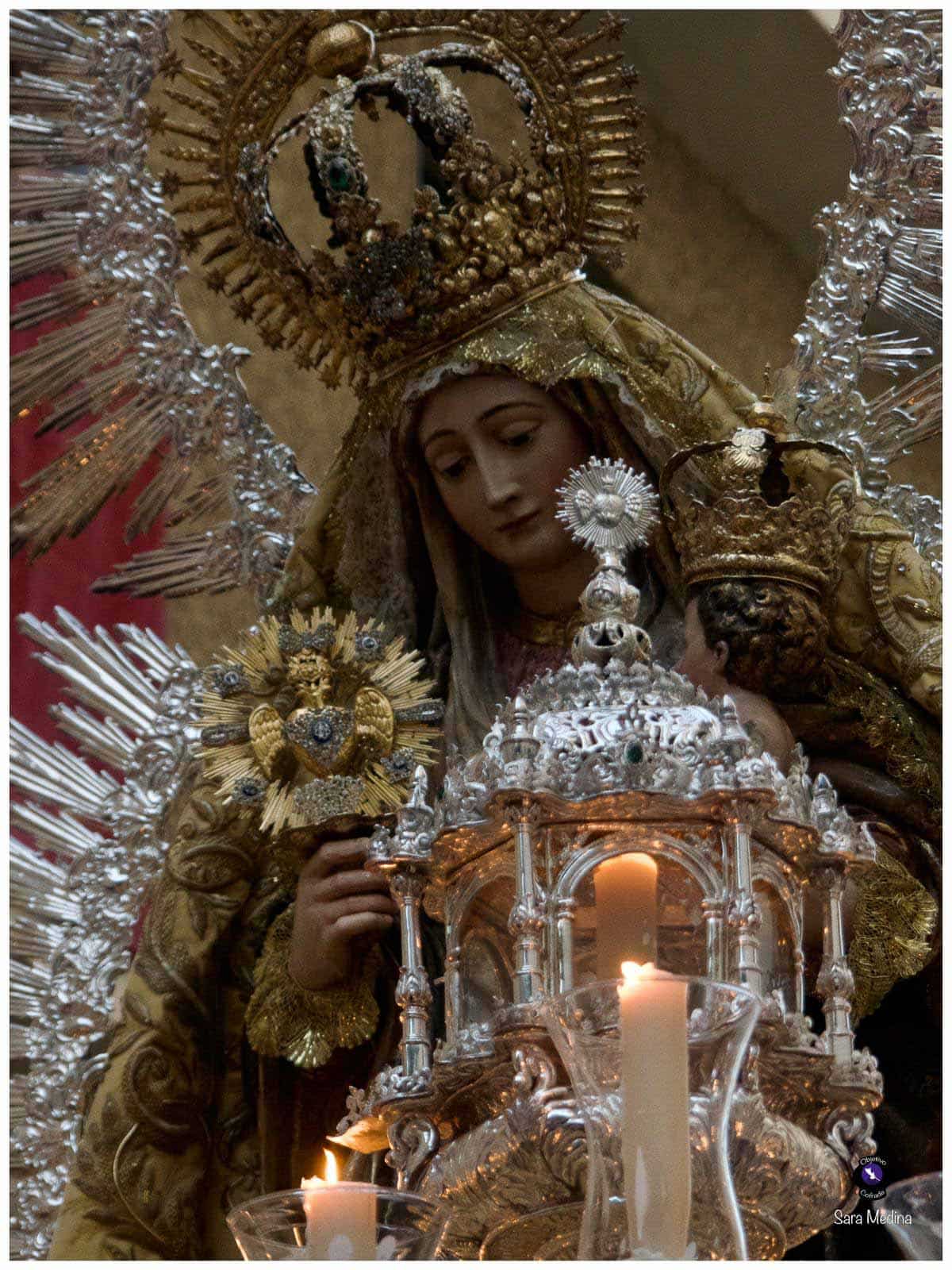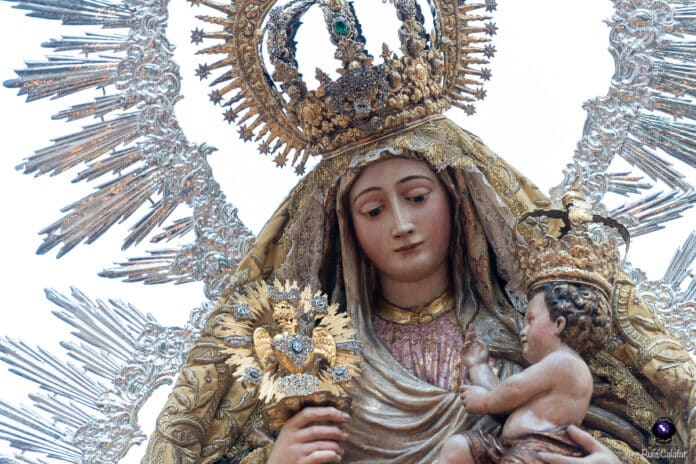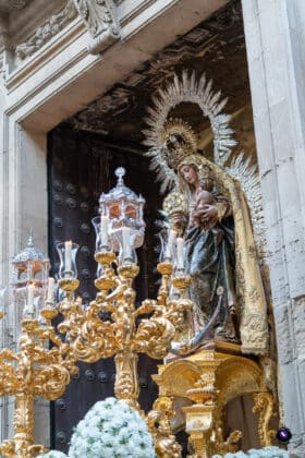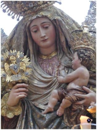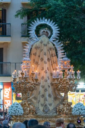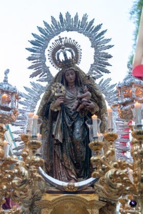 Concluidos los cultos en su honor, la Virgen cruzó el dintel del templo a las 17:40 horas, iniciando un recorrido clásico que la llevó por Cristo del Calvario, San Pablo, Puerta de Triana, Reyes Católicos, Santas Patronas, López de Arenas, Galera, Almansa, Julio César, Canalejas, Bailén y de nuevo San Pablo, para entrar de nuevo en torno a las 21:00 horas.