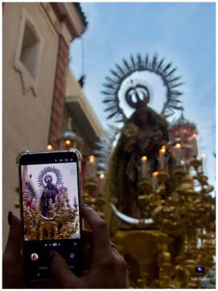 El paso procesional, adornado con una elegante combinación de claveles blancos, reflejaba la pureza y sobriedad que siempre caracterizan esta cita. La Banda de Música de la Sociedad Filarmónica Nuestra Señora del Carmen de Salteras acompañó a la Virgen durante todo el recorrido, interpretando un repertorio cuidadosamente escogido, donde sonaron marchas como Bajo tu Amparo, La Virgen de las Angustias o Virgen del Valle, entre otras piezas de gran tradición.