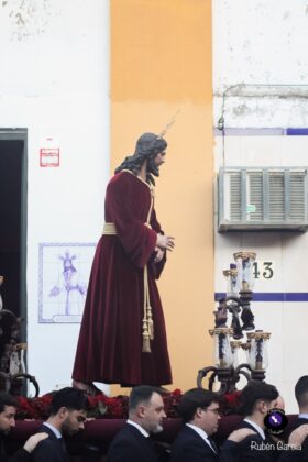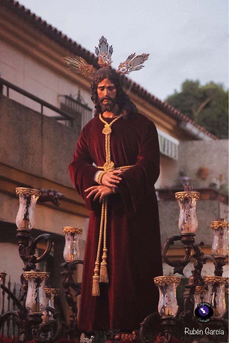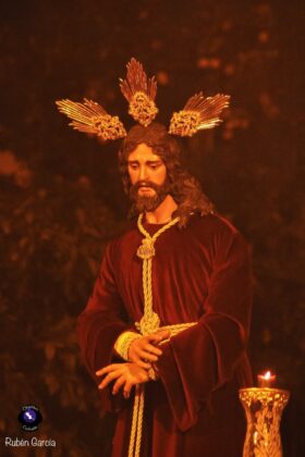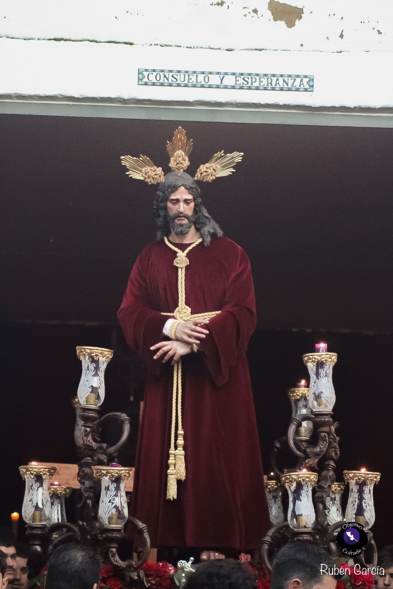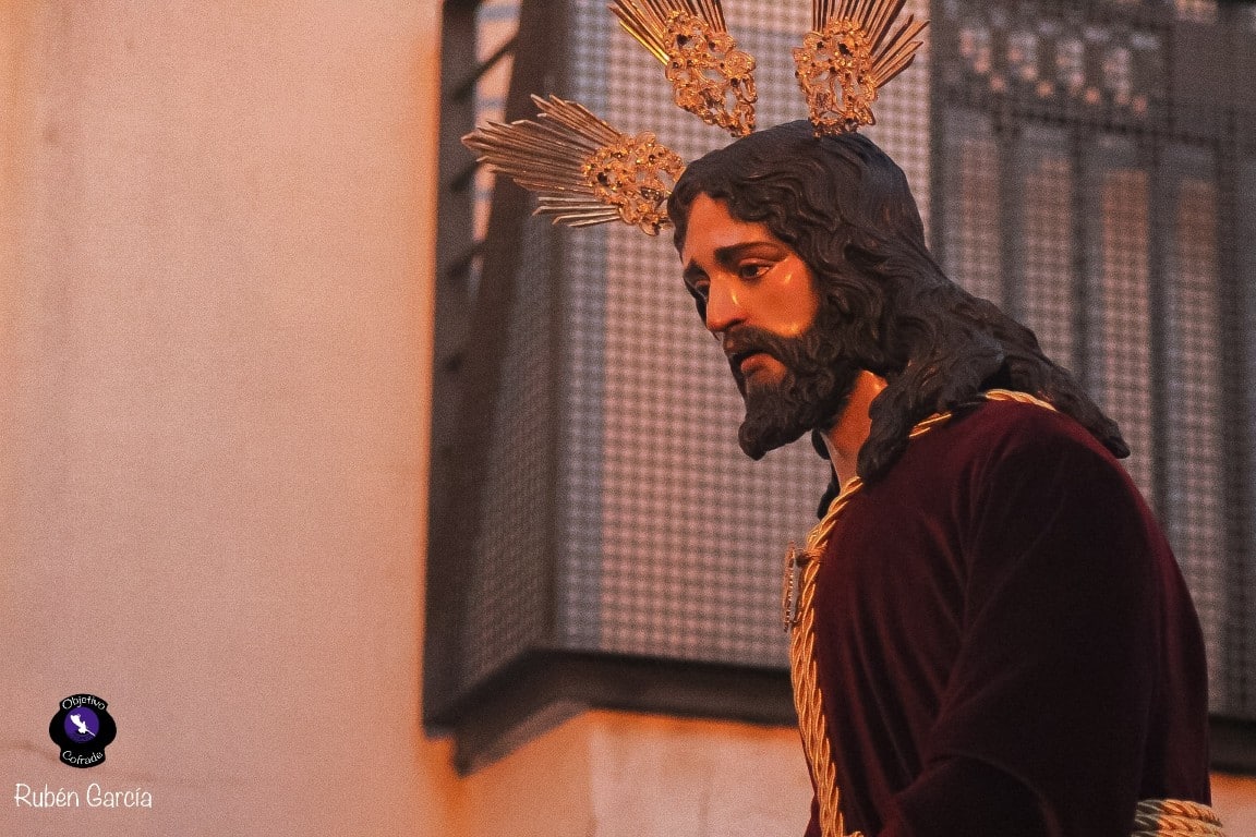 La imagen, ataviada con túnica de terciopelo burdeos y con las manos atadas en actitud de Cautivo, recorrió el itinerario previsto entre las 19:00 y las 21:00 horas, acompañado musicalmente por el Trío de Capilla “Ariscal”.