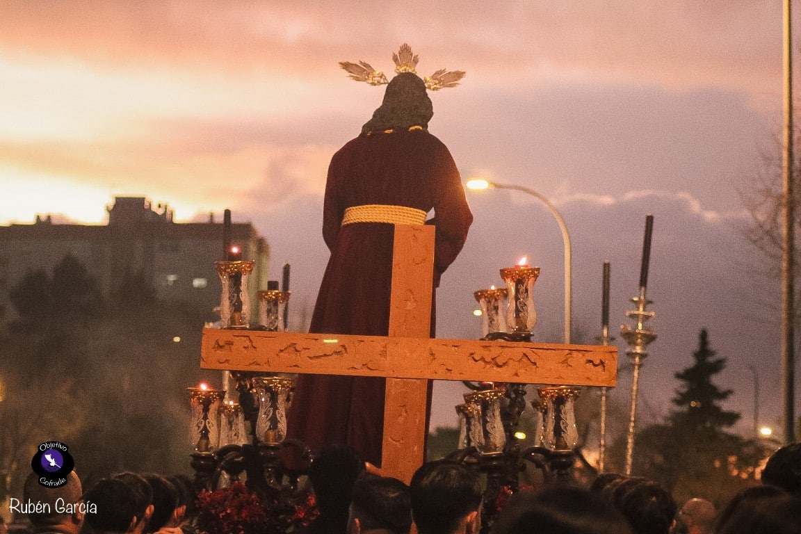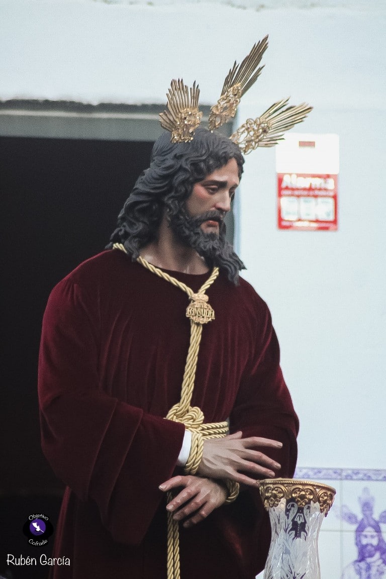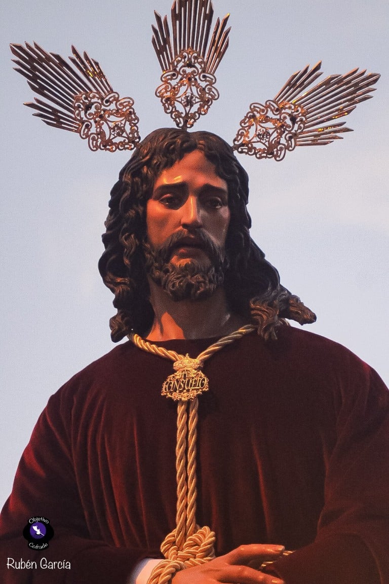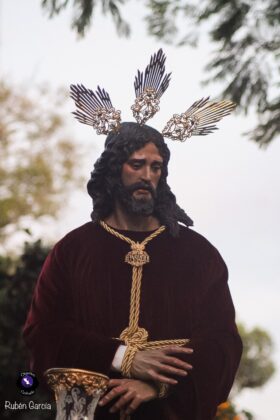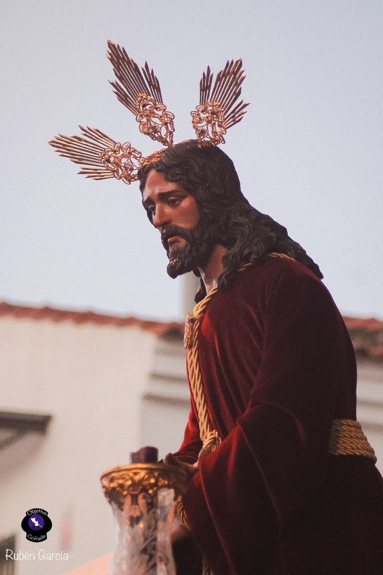 La imagen, ataviada con túnica de terciopelo burdeos y con las manos atadas en actitud de Cautivo, recorrió el itinerario previsto entre las 19:00 y las 21:00 horas, acompañado musicalmente por el Trío de Capilla “Ariscal”.