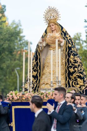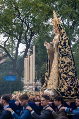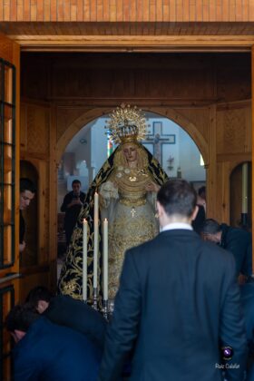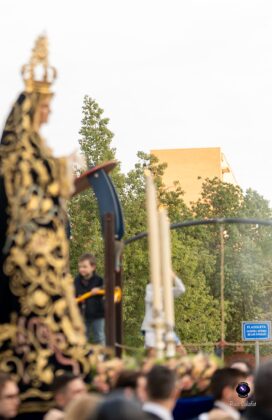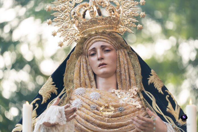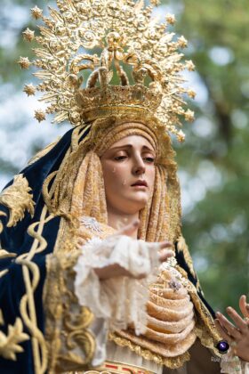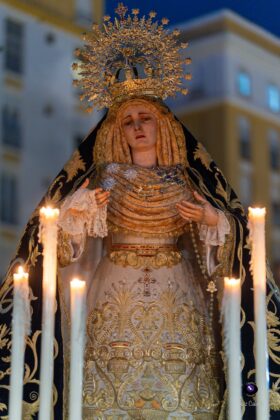 Asimismo, la Dolorosa estrenó un conjunto de puños de encaje y pañuelo de duquesa, además de un tocado con una nueva composición realizada en lamé de oro, combinado con encaje de color tostado. El exorno floral estuvo compuesto por rosas de pitiminí en tono melocotón, clavel caramelo, limonio rosa, tanacetum, eucalipto populus y ammi majus, configurando un conjunto de gran armonía visual.