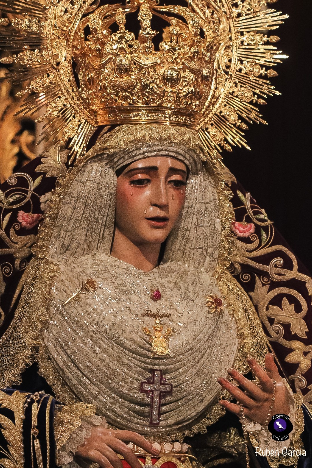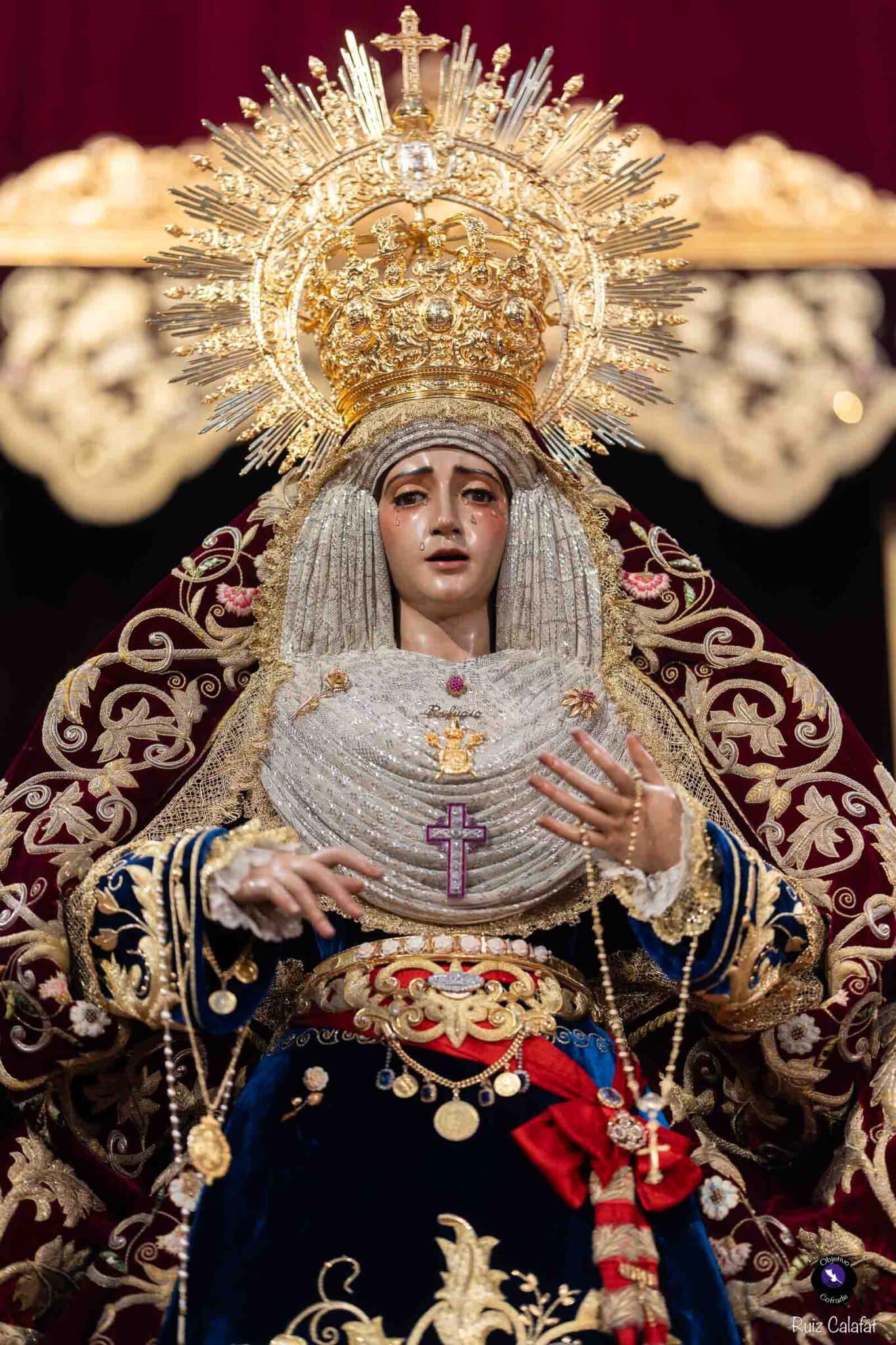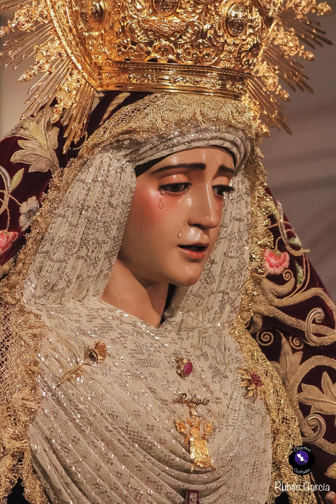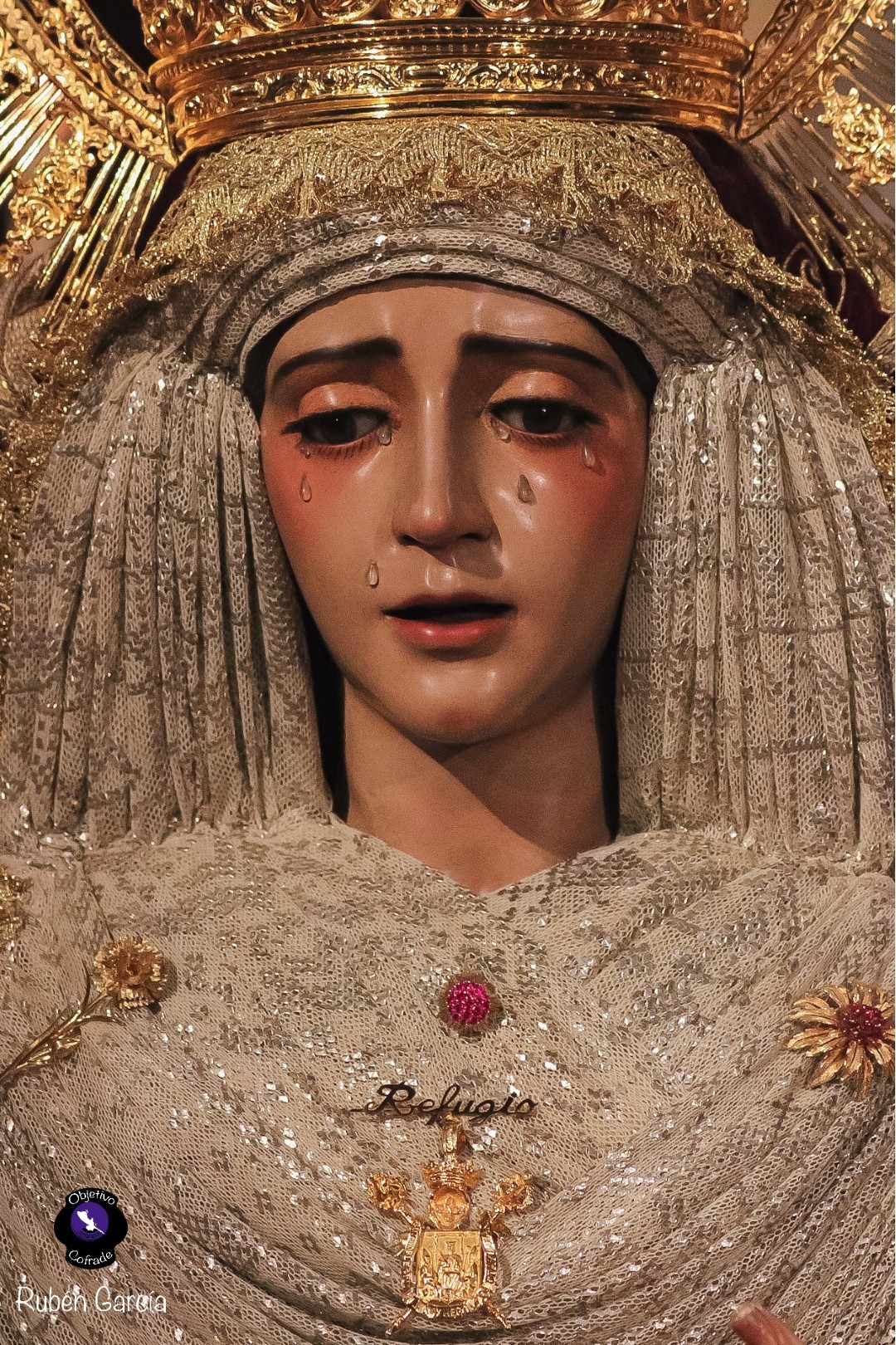La Virgen del Refugio se presenta ante los fieles con una estampa cuidada al detalle, luciendo saya azul confeccionada por Jesús Rosado Borja bajo diseño de Pepe Asian Cano, junto al manto de salida diseñado por Juan Manuel Rodríguez Ojeda y realizado por Esperanza Elena Caro. Una imagen que refuerza el carácter sobrio y elegante que siempre ha definido a esta advocación mariana del barrio.