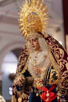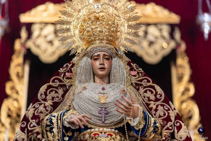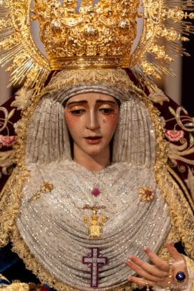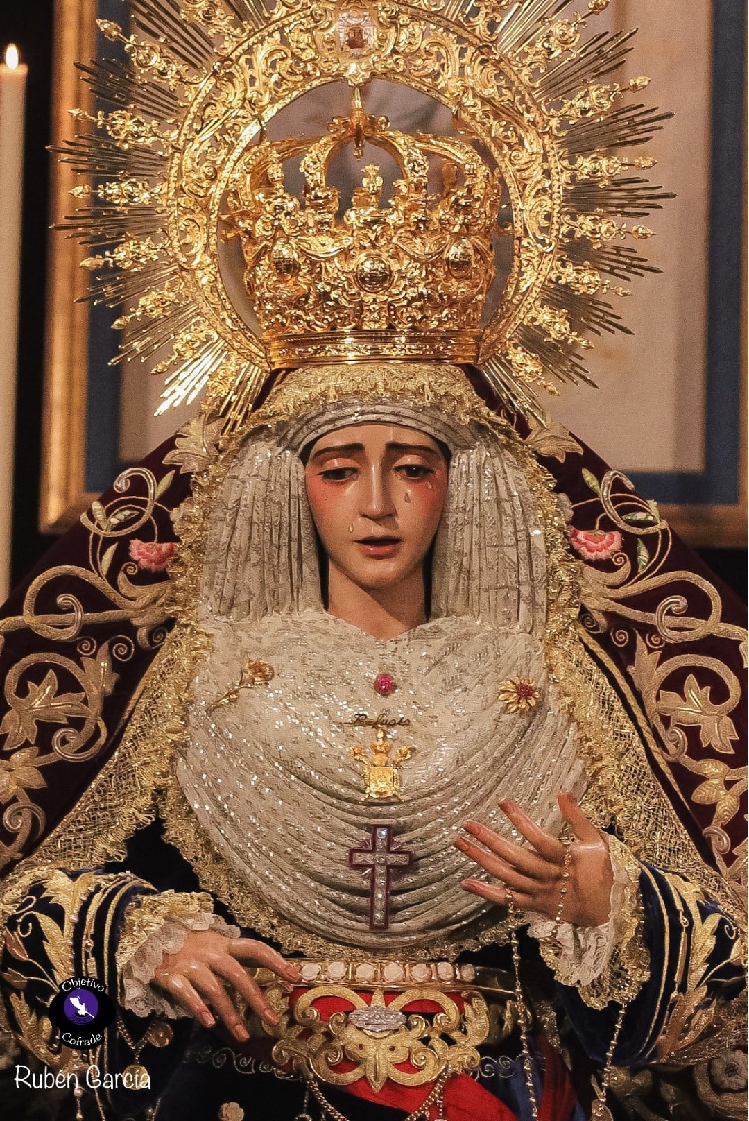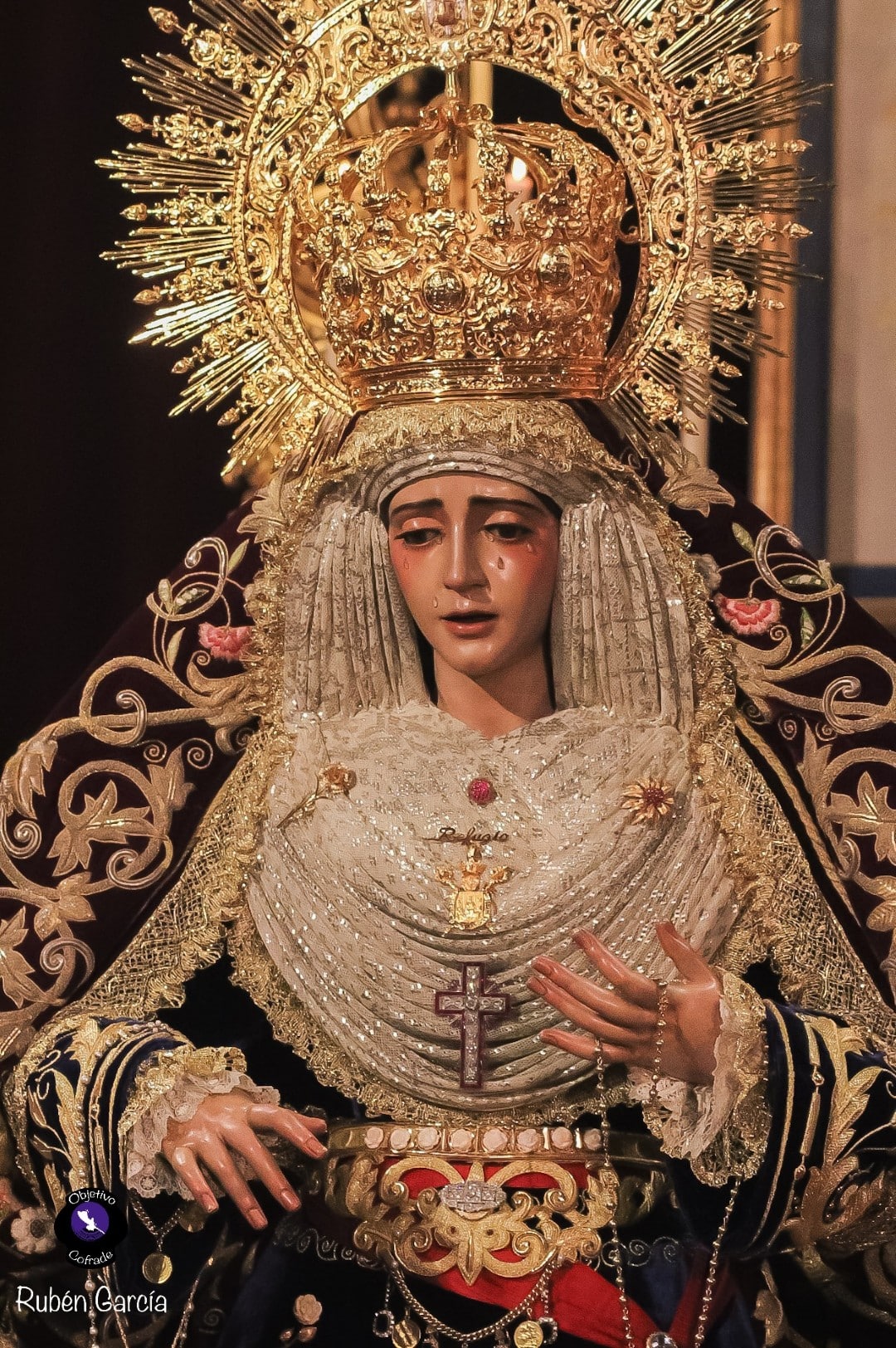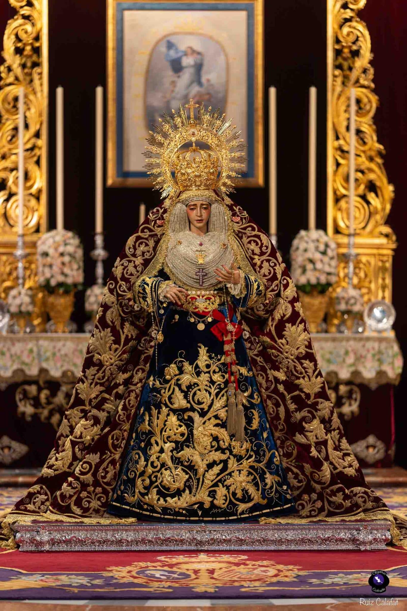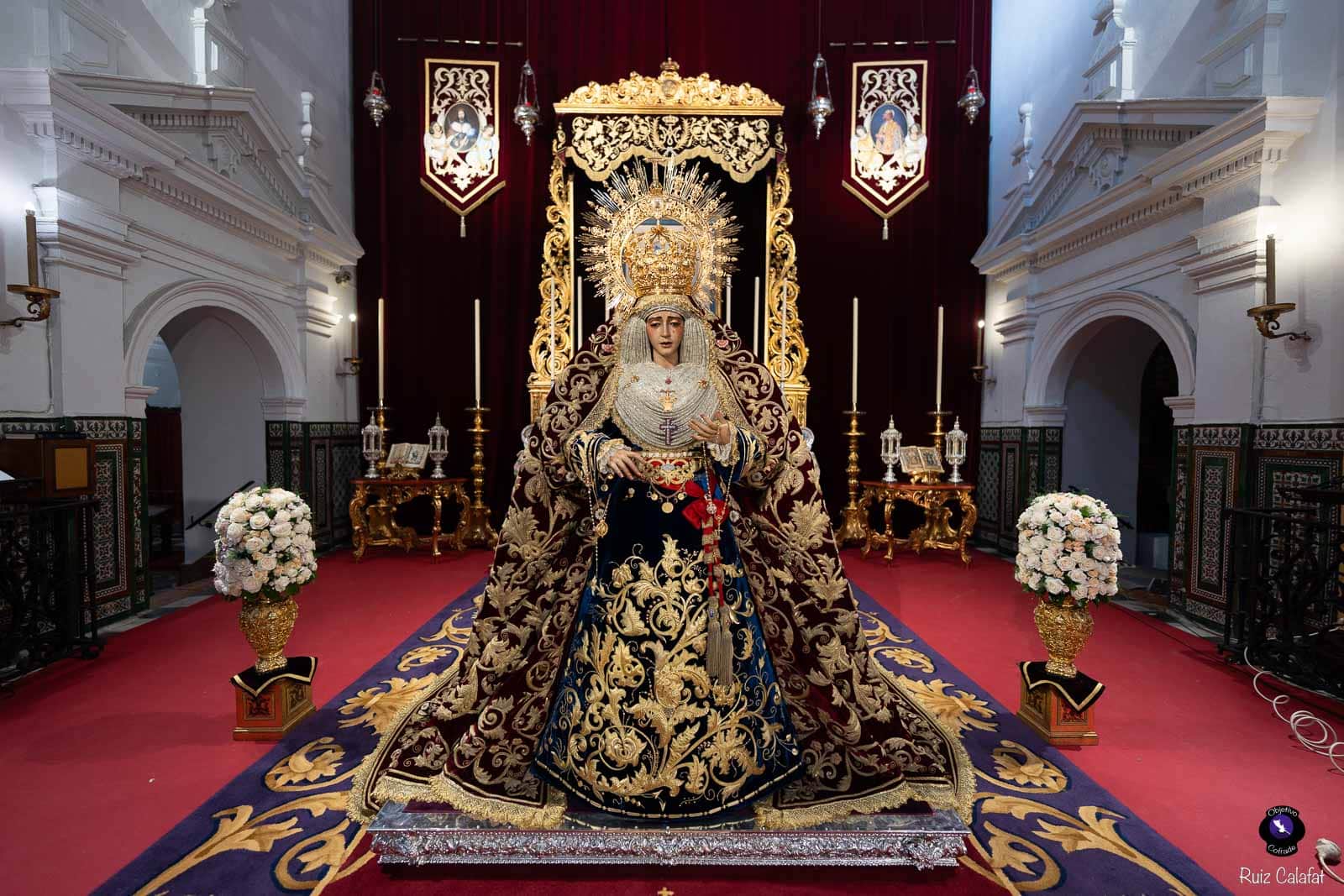 La Virgen del Refugio se presenta ante los fieles con una estampa cuidada al detalle, luciendo saya azul confeccionada por Jesús Rosado Borja bajo diseño de Pepe Asian Cano, junto al manto de salida diseñado por Juan Manuel Rodríguez Ojeda y realizado por Esperanza Elena Caro. Una imagen que refuerza el carácter sobrio y elegante que siempre ha definido a esta advocación mariana del barrio.