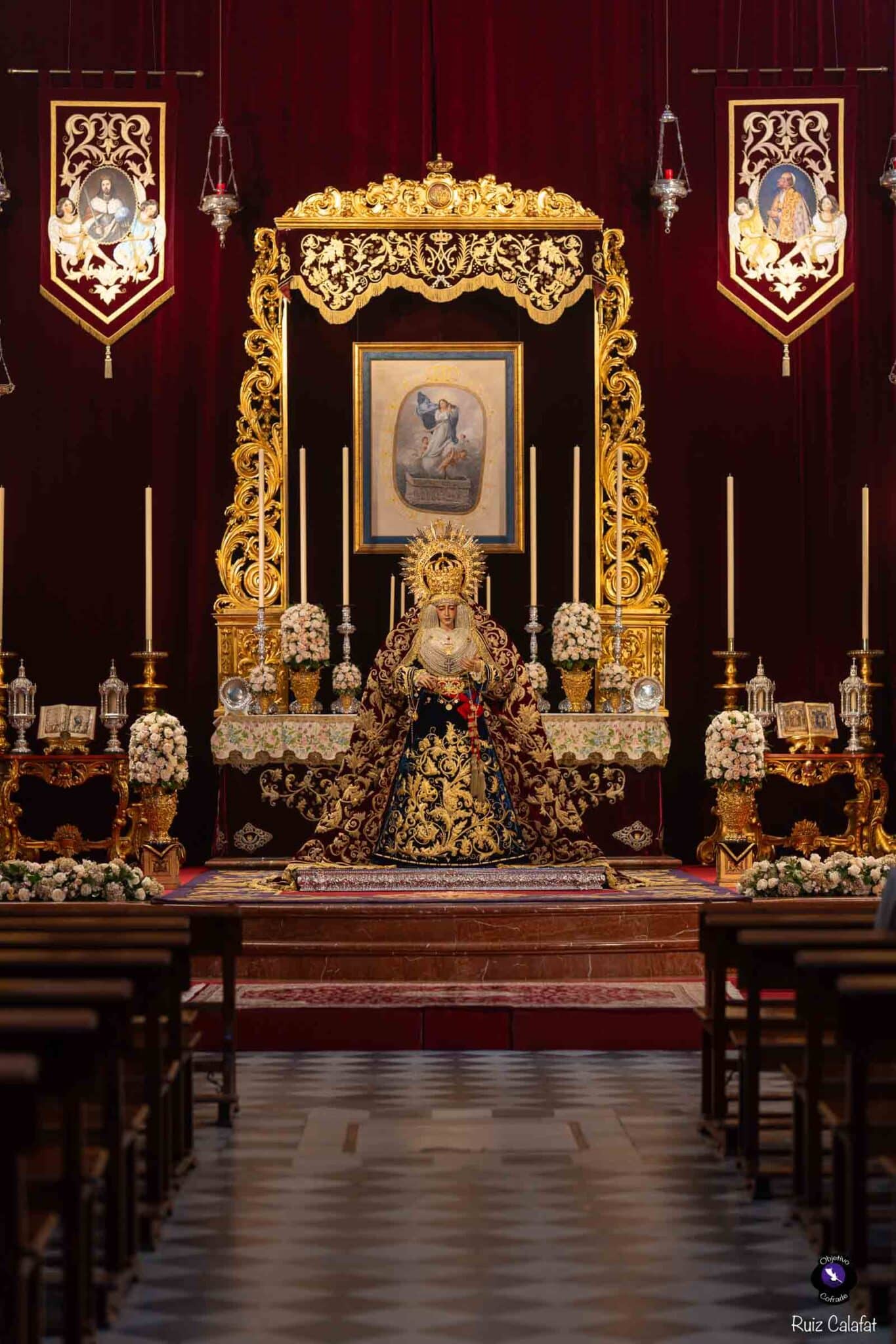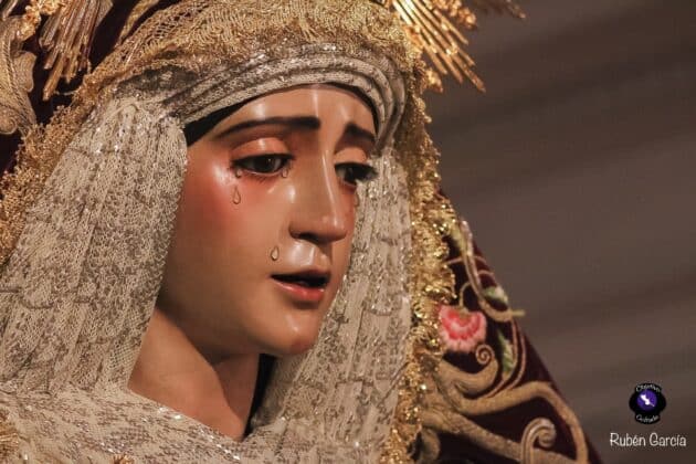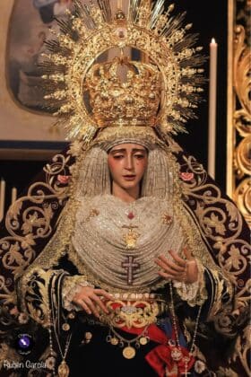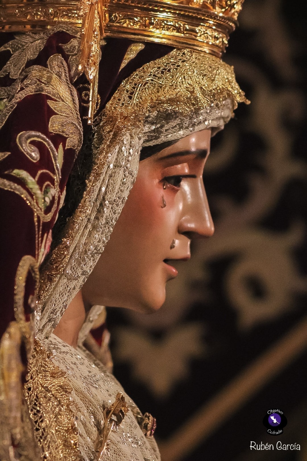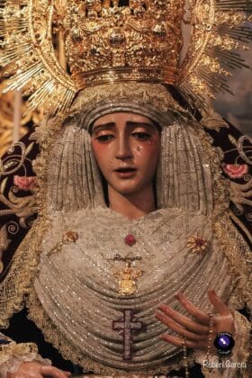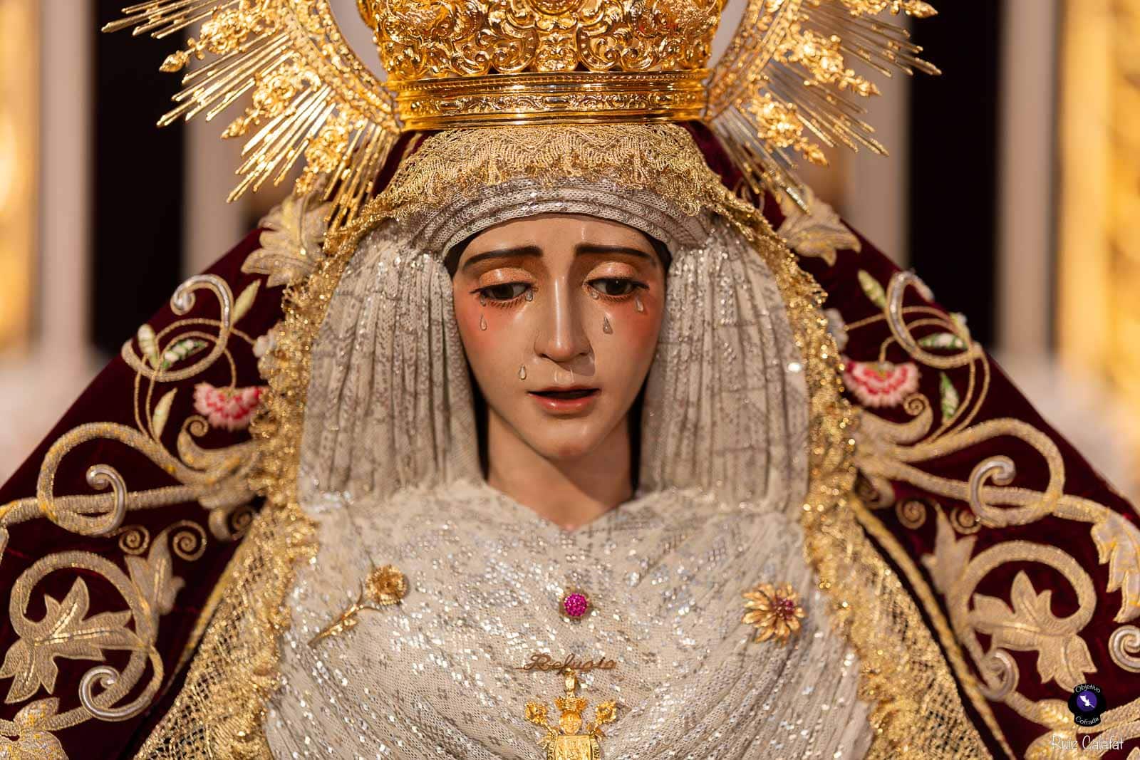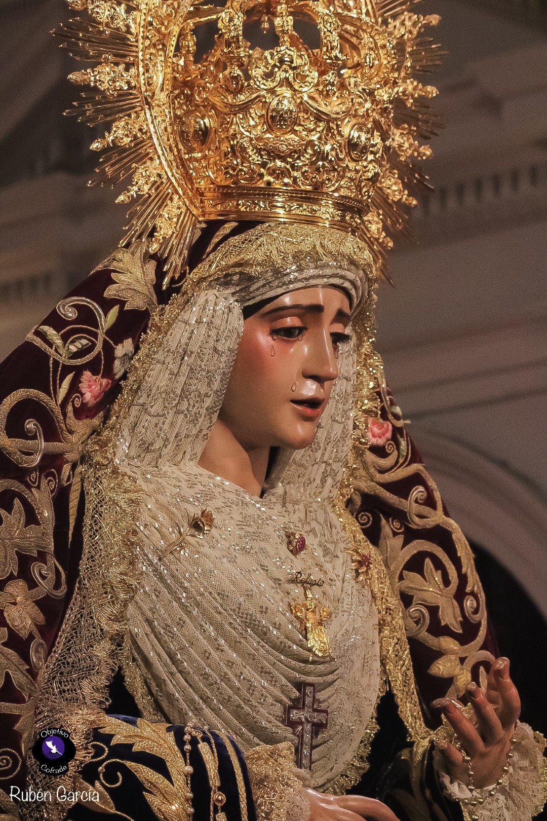 La Virgen del Refugio se presenta ante los fieles con una estampa cuidada al detalle, luciendo saya azul confeccionada por Jesús Rosado Borja bajo diseño de Pepe Asian Cano, junto al manto de salida diseñado por Juan Manuel Rodríguez Ojeda y realizado por Esperanza Elena Caro. Una imagen que refuerza el carácter sobrio y elegante que siempre ha definido a esta advocación mariana del barrio.