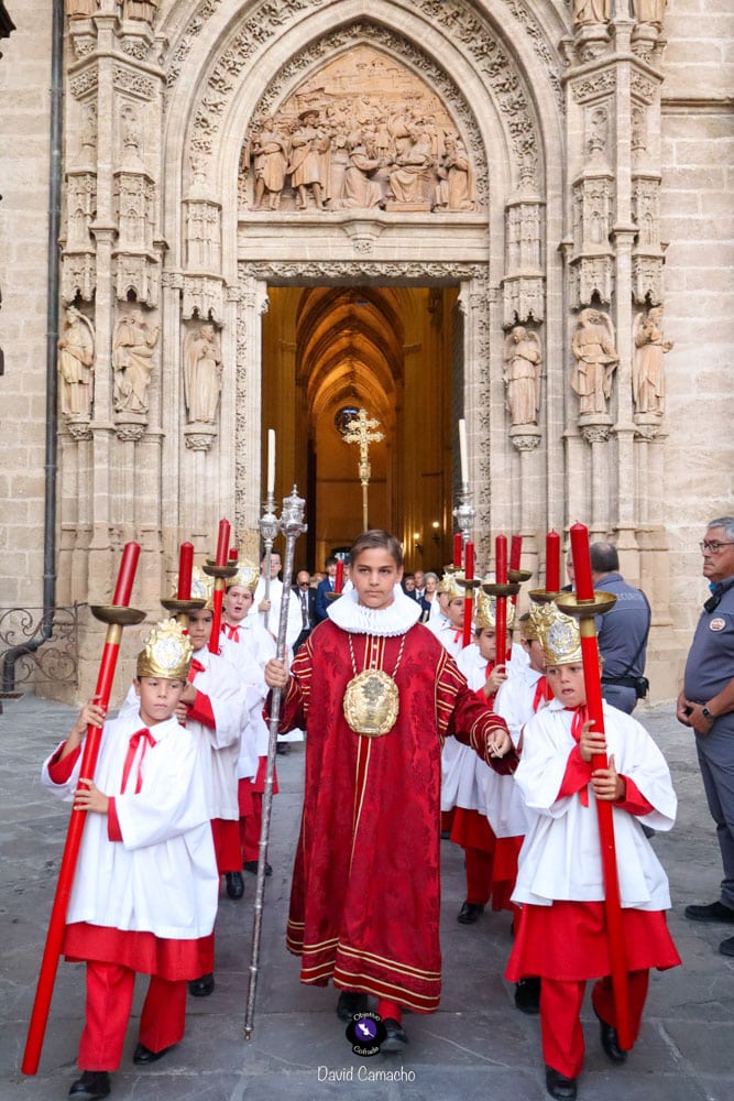 La Catedral abría sus puertas a las cinco de la mañana para acoger las tres eucaristías preparatorias antes de la procesión. Tras el rezo de Laudes, presidido por el arzobispo José Ángel Saiz Meneses y acompañado por los obispos auxiliares, el cortejo comenzó a organizarse en el interior del templo. A las 8:00 en punto, bajo el repique solemne de las campanas de la Giralda, la Virgen de los Reyes cruzaba la Puerta de los Palos entre un silencio reverente y la emoción contenida de los presentes, que según la tradición pidieron sus tres deseos al verla bajo el dintel.