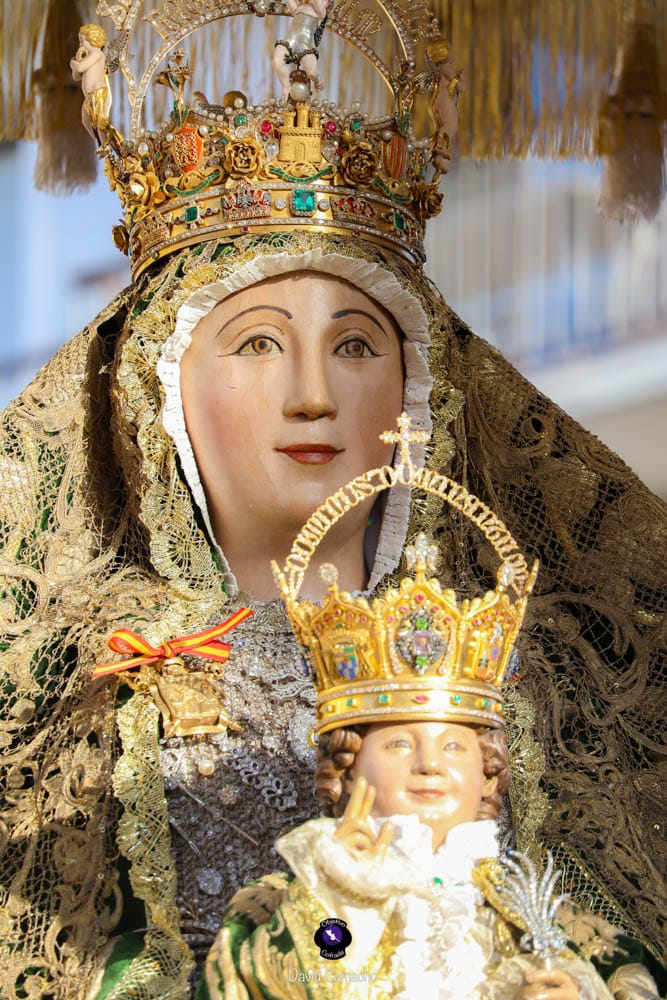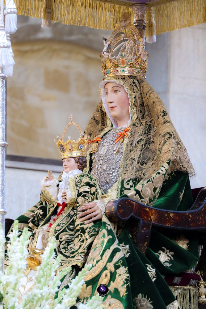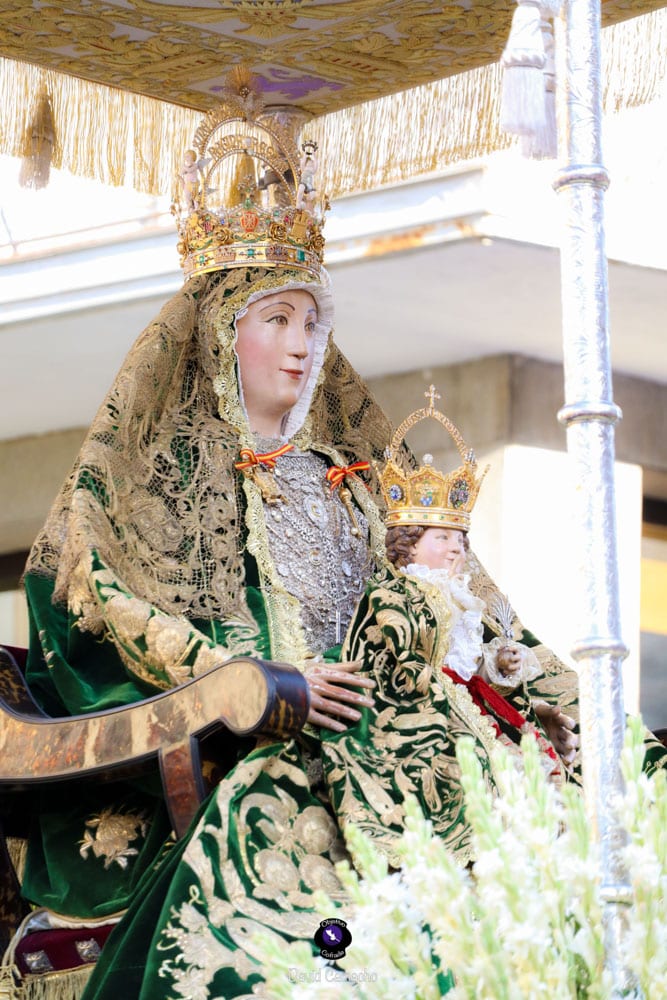 La Virgen lució en esta ocasión el espléndido terno verde regalado en 1853 por la reina Isabel II, recientemente restaurado por el taller de Sucesores de Esperanza Elena Caro. Tanto la saya como el traje del Niño se presentaban en seda blanca ricamente bordada en oro, con detalles de estilo renacentista. La imagen completaba su ajuar con el histórico “pecherín de brillantes”, la corona de la coronación canónica de 1904, diversas joyas donadas a lo largo de los siglos, así como la toca de encaje de Flandes del siglo XVIII.