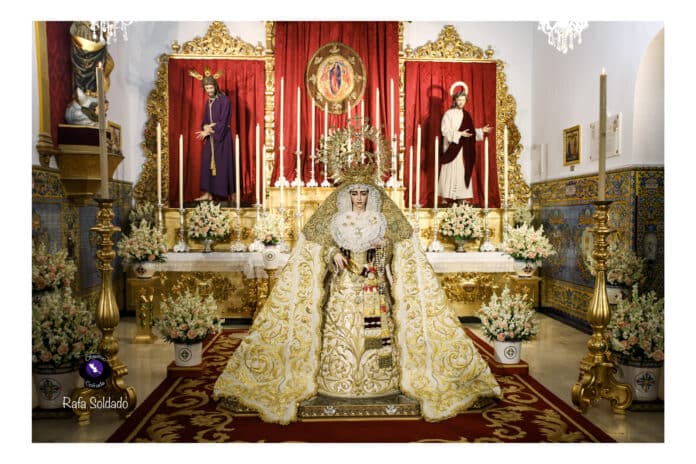 En esta ocasión, la Señora de la Salud se presenta en un montaje sencillo y elegante, que resalta la serenidad de su semblante. Ataviada con terno claro y manto de salida bordado, ofrece a los fieles una estampa llena de espiritualidad. Durante toda la jornada, hermanos, familias del barrio y devotos de Sevilla se acercan a besar su mano y a elevar oraciones en un ambiente de profundo fervor.