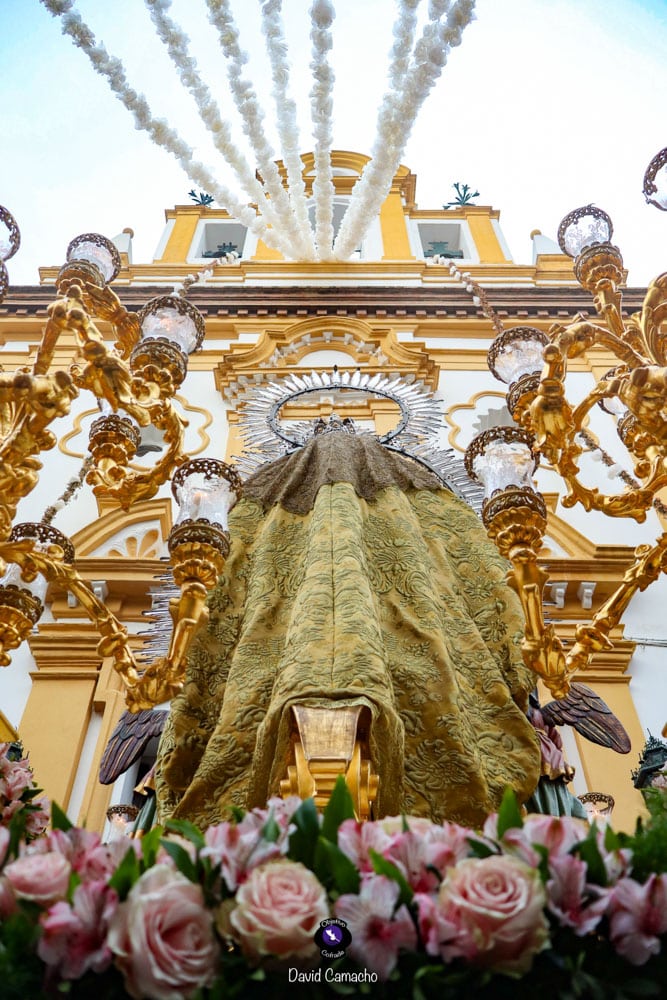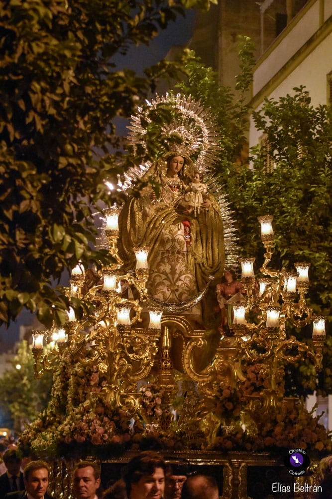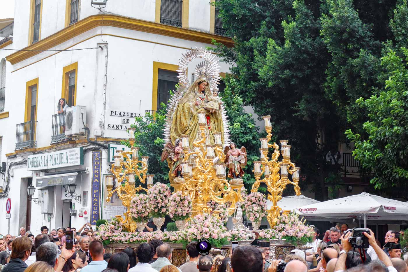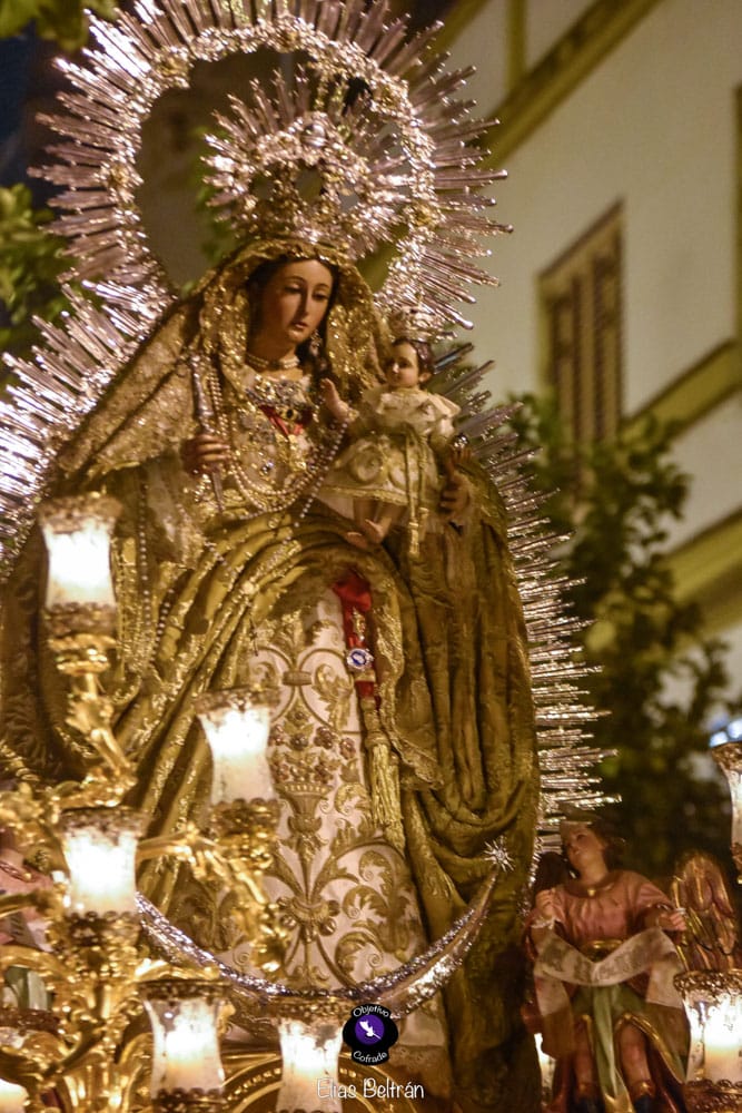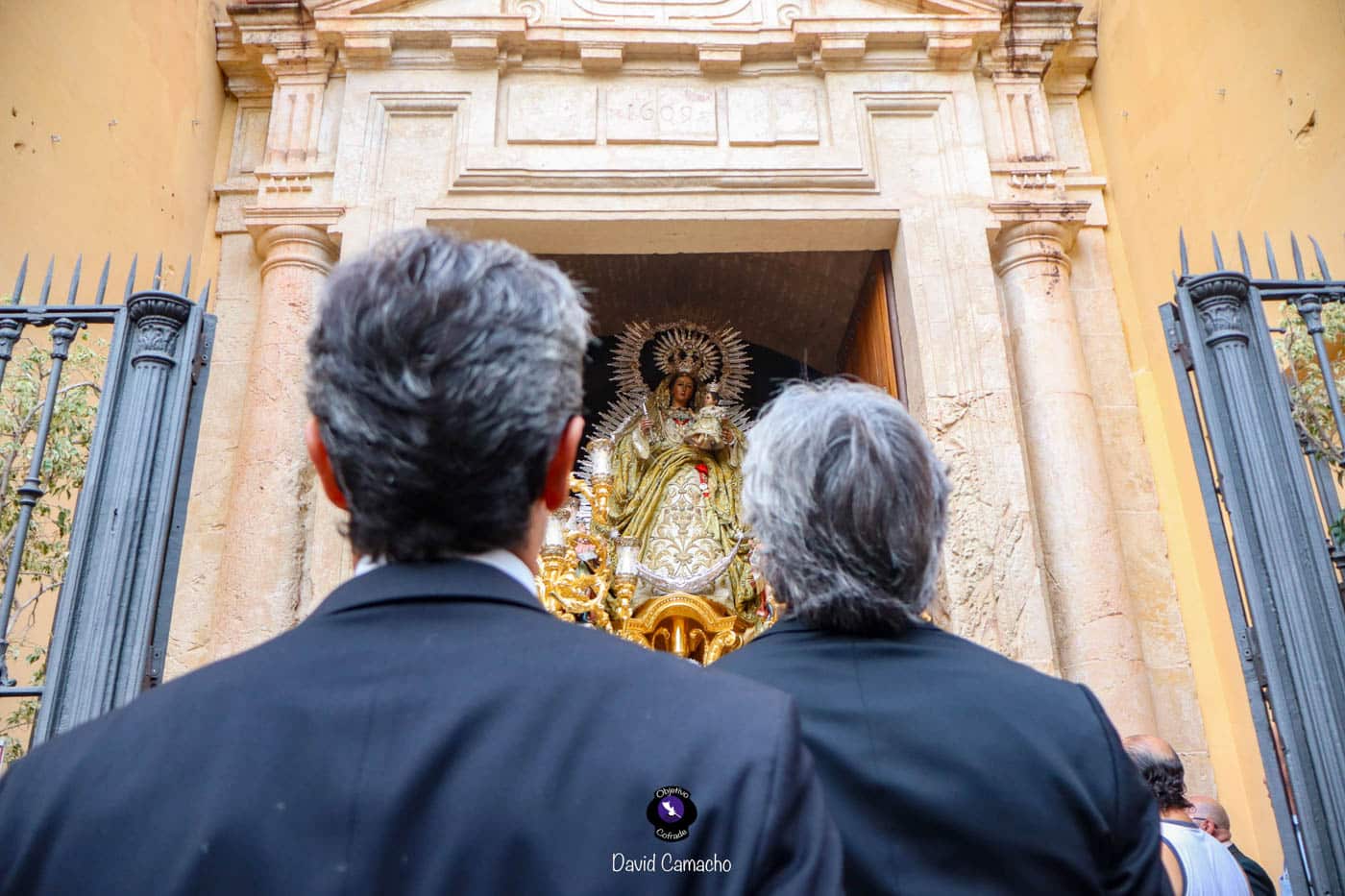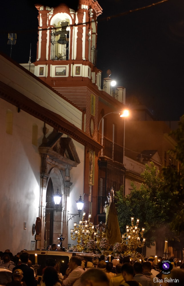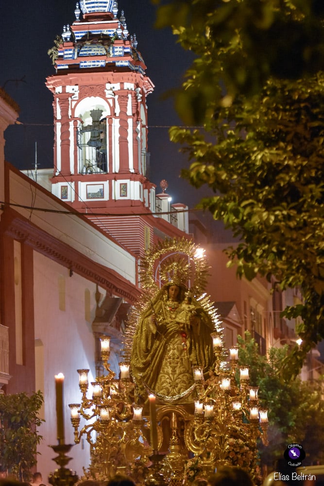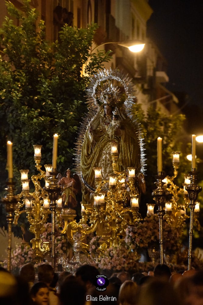 A las 18:30 horas, las puertas de la Real Parroquia de Santa Ana se abrieron, la banda de Cornetas y tambores del Santísimo Cristo de las Tres Caidas abria el cortejo y tras la salida del cortejo el paso cruzó la Plazuela entre aplausos y sones de la Banda de Música del Maestro Tejera, que interpretó el Himno Nacional y un repertorio acorde a cada momento. La Virgen lucía su habitual porte elegante, vestida con saya blanca bordada en oro.